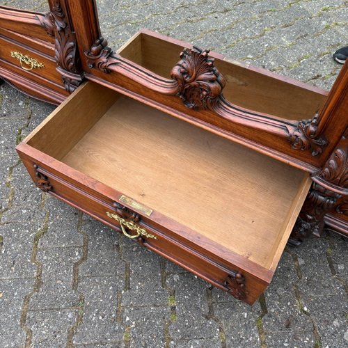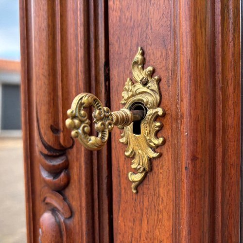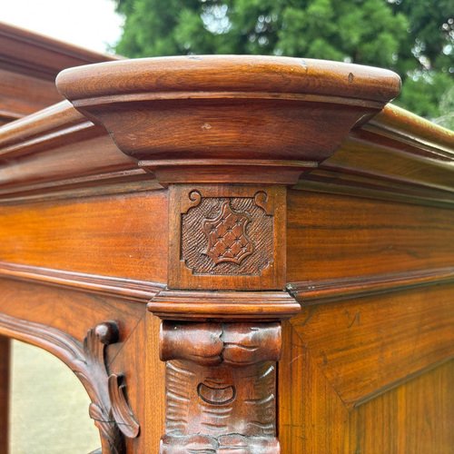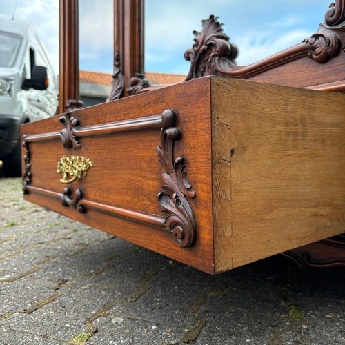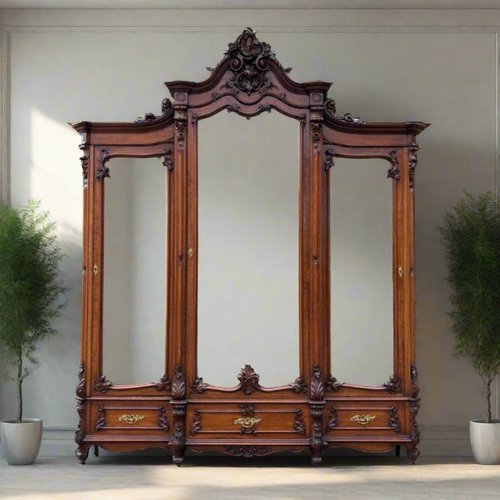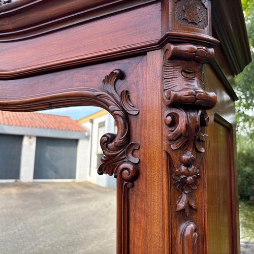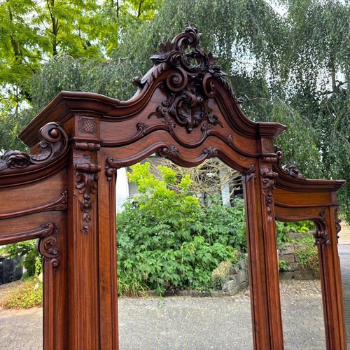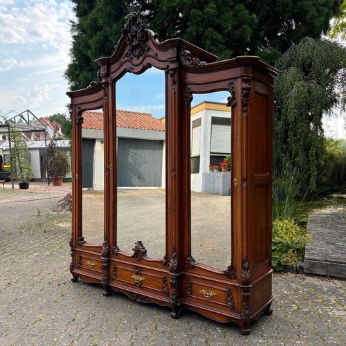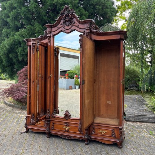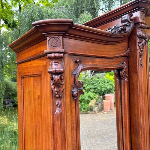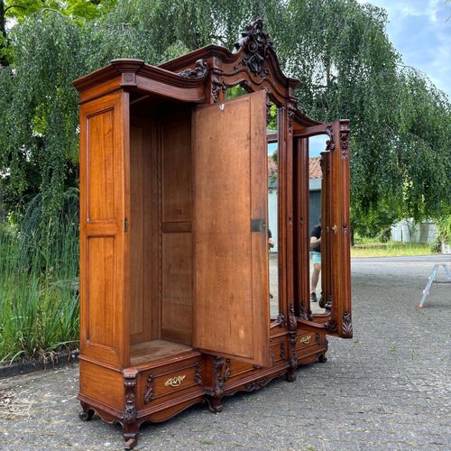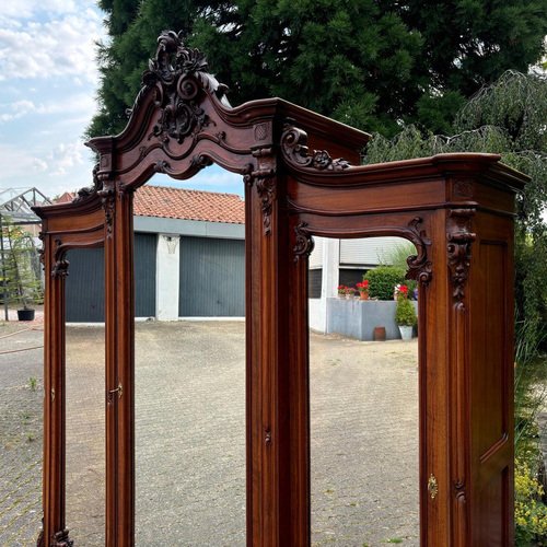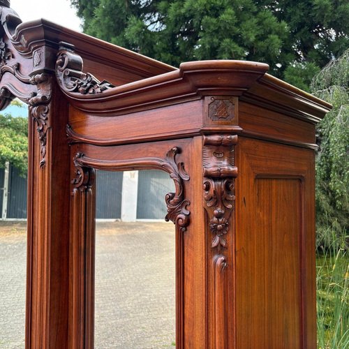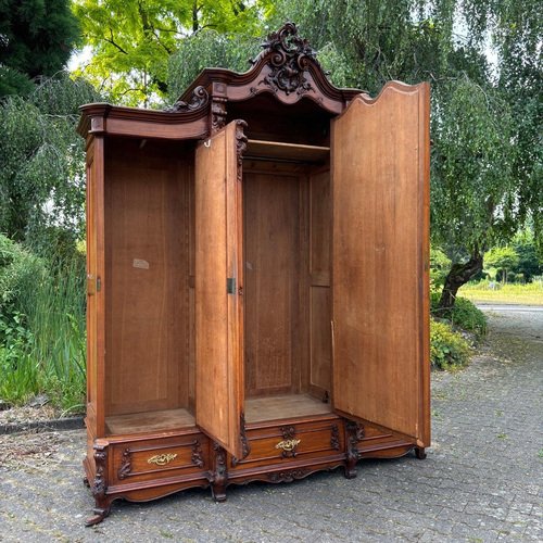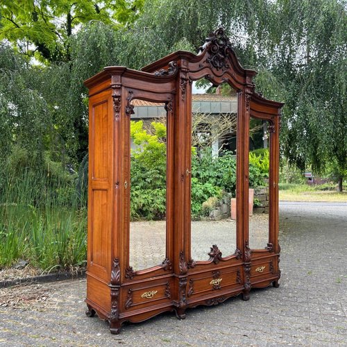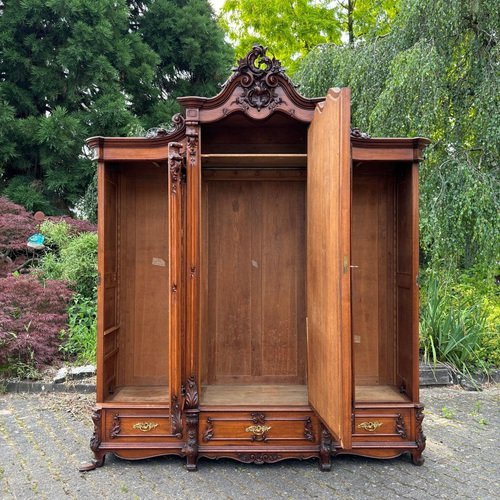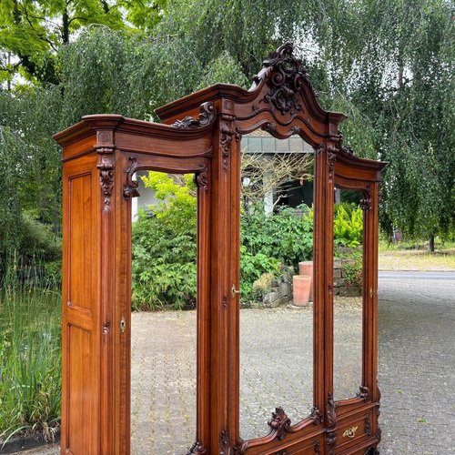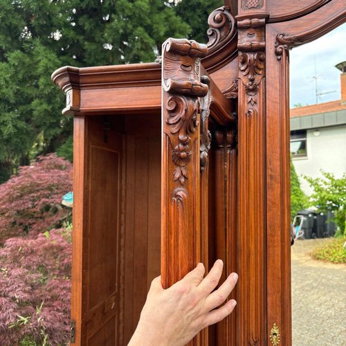✓ Special find✓ High-quality wood selection✓ Magnificent, impressive Dimensions: W: 230cm H: 270cm D: 63cm Item: Antique cabinet Item no.: 946Epoch: Historicism 1856, BerlinMaterial: Solid walnut & oak woodColor: BrownCondition: In very good condition, with slight Sign of the timesEquipment: The interior layout can be freely changed. Currently there is only a hat board in the middle with a clothes railConstruction: Can be completely dismantled Magnificent historicism cabinet: Impressive find from 1856 This antique cabinet from the historicism era, made in Berlin in 1856, is a true masterpiece of carpentry art. Made from solid walnut and oak, it exudes an impressive presence and magnificent elegance. with its brown color and exceptional wood grain, this cabinet fits harmoniously into various interior styles. It is in very good condition and shows only slight signs of time, which underline its historical charm. The interior layout of this special find can be freely designed according to your wishes. Currently it is only equipped with a hat board and a clothes rail in the middle, which offers you flexibility in use. The completely dismantled design allows for easy transport and installation without compromising the stability and longevity of the cabinet.