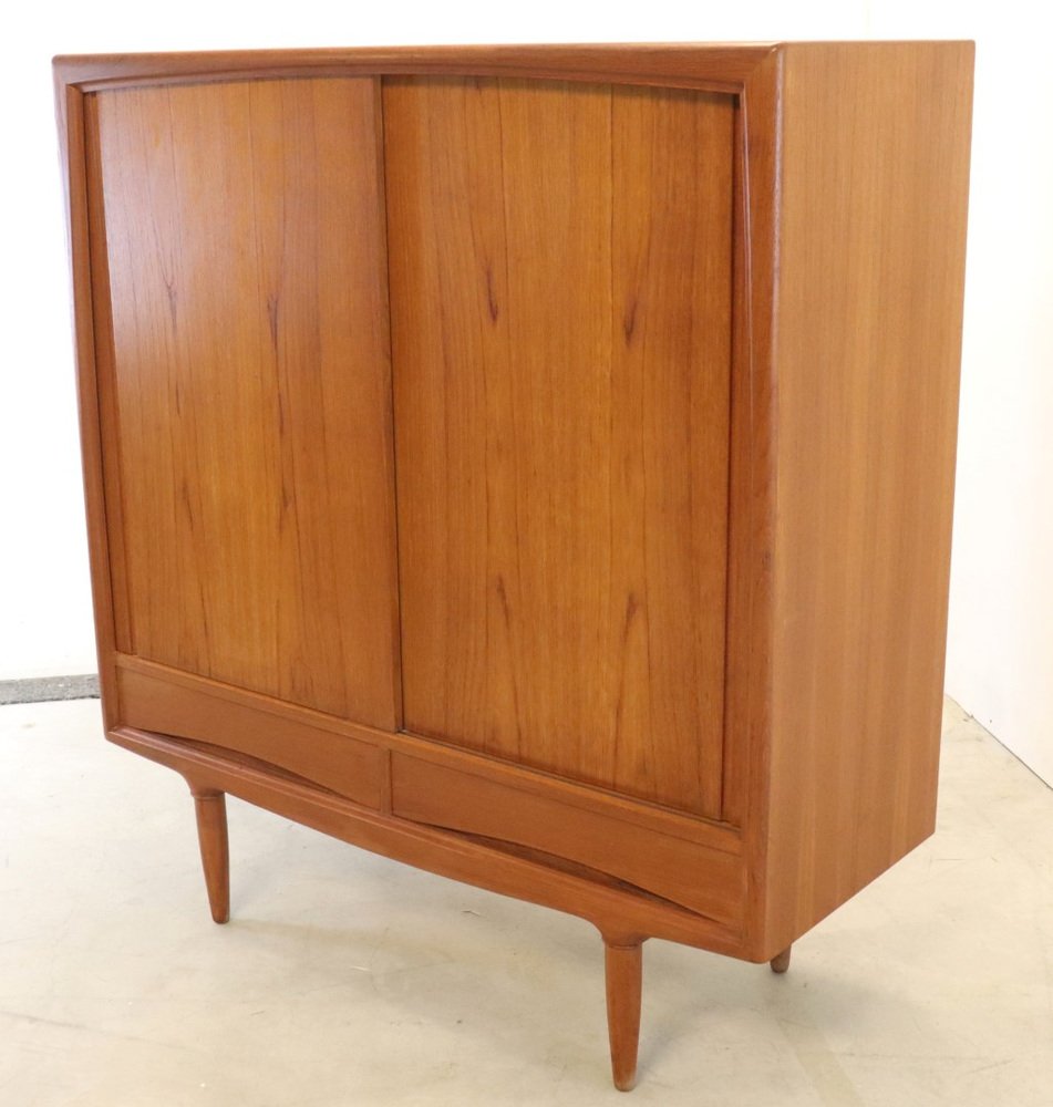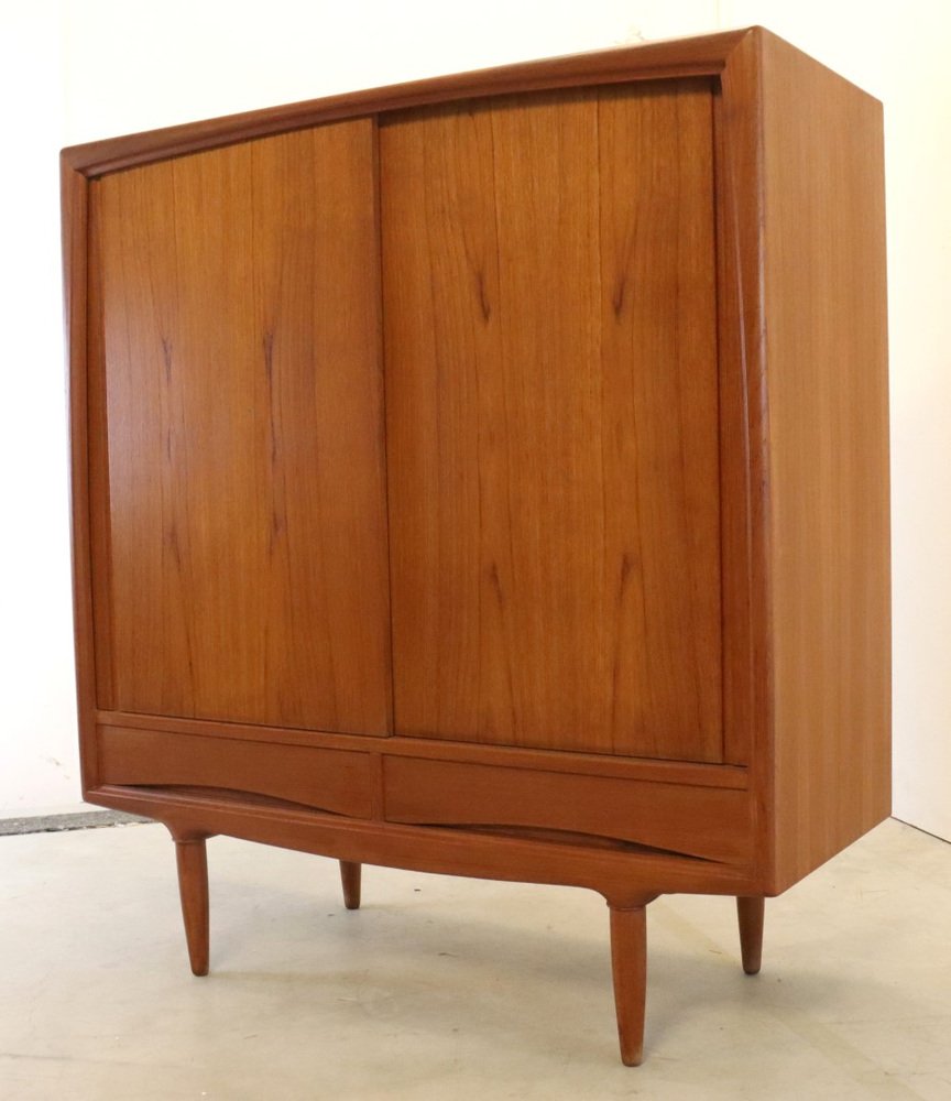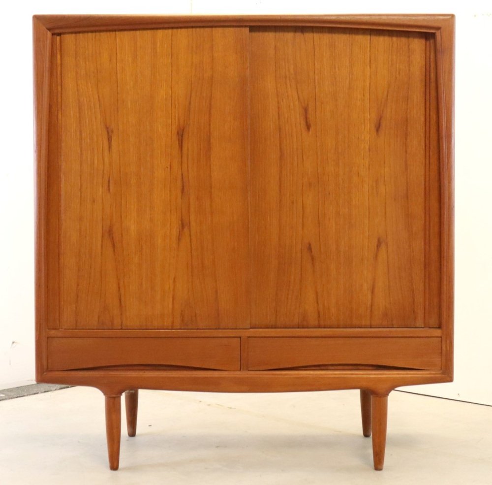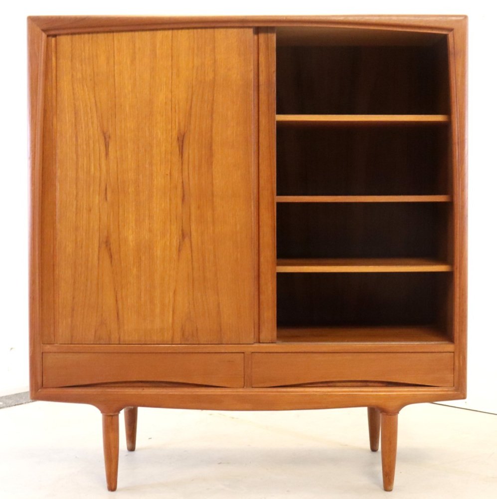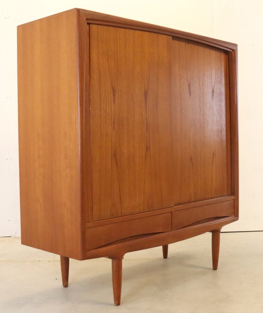 This cupboard from Denmark is a so -called mid -size highboard, a high but not too large cupboard that were often used as a crockery cupboard. Striking is his very sleek surface division and therefore sleek appearance. We see here a vintage cupboard that falls between various models because of its quirky and very unique format. Perhaps the term "Mid Board" is much better in place!