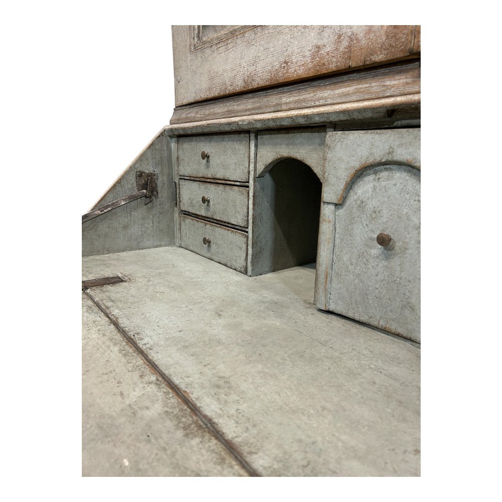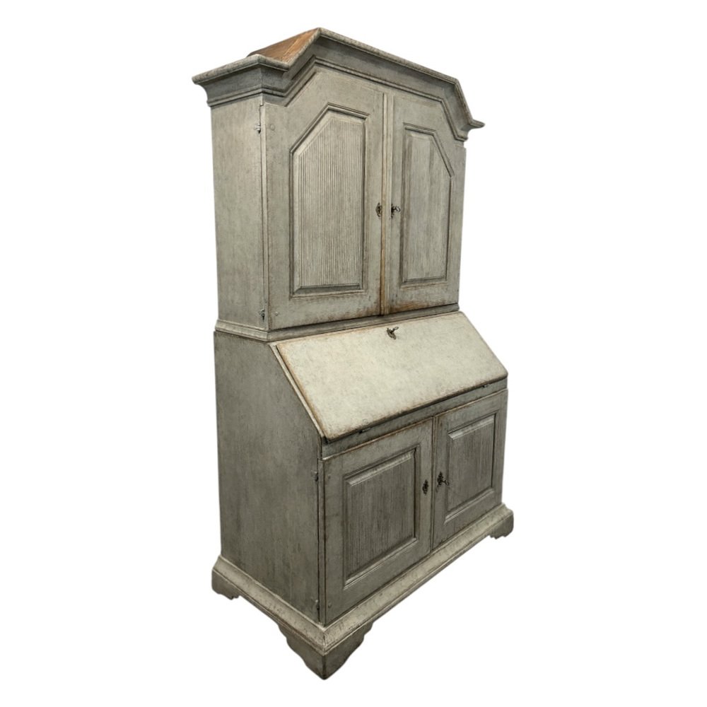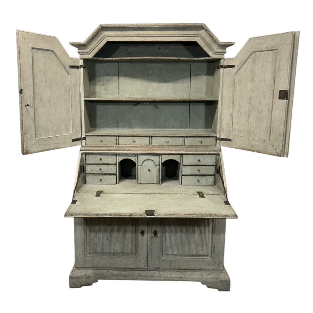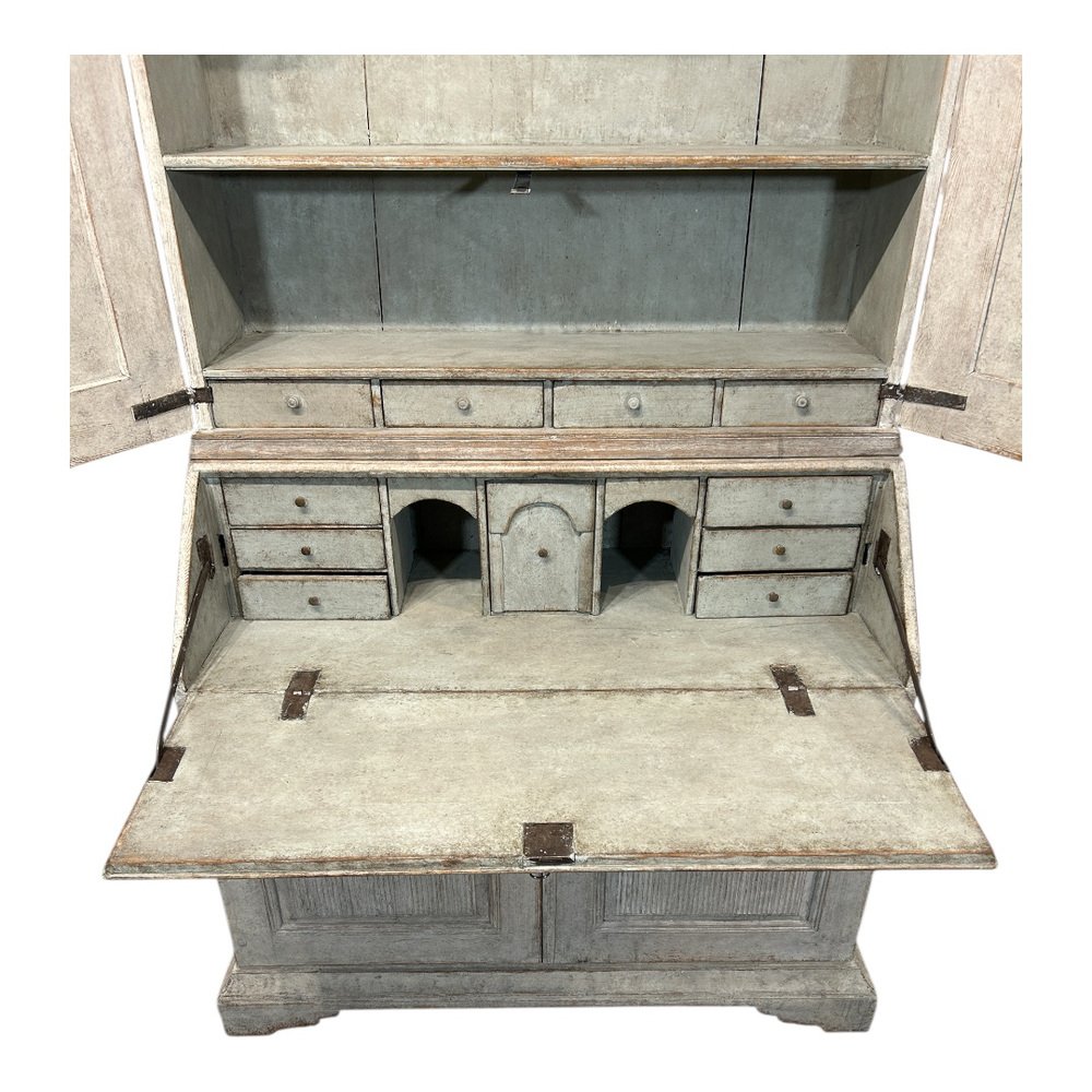 Armario sueco antiguo en gris claro. La parte superior tiene dos puertas con cerradura. Las puertas están adornadas con paneles fresados. El interior es de color turquesa apagado. Dentro hay dos estantes (a una altura fija) y tres cajones pequeños en la parte inferior. Los cajones tienen pomos de madera.
