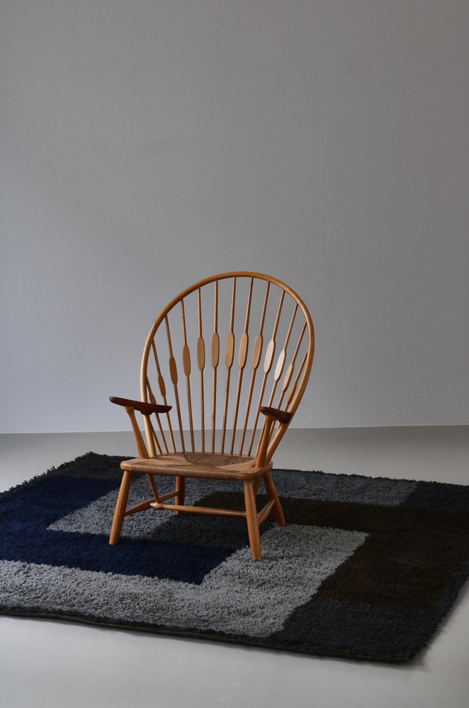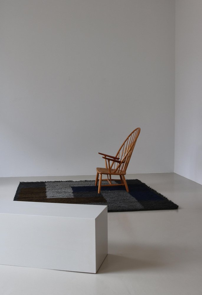 Gran alfombra "Rya" de Ross Littell hecha a mano en Dinamarca en los años 60 en Unika-Væv. Tejida a mano según la tradición escandinava Rya con un pelo largo en maravillosos colores azul, gris y marrón. Este diseño fue realizado por el diseñador estadounidense Ross Littell, que fue una figura importante del diseño danés en la década de 1960 gracias a su colaboración con Nanna Ditzel y Verner Parton, entre otros. Esta pieza única se utilizó para decorar una tienda de muebles modernos daneses en la década de 1960 y se ha guardado desde entonces. El estado de conservación es, por tanto, muy bueno, con escasos signos de desgaste. Aunque rya significa "alfombra" en inglés, el significado original en Suecia de rya era una funda de cama con pelo anudado. Las primeras ryas surgieron a principios del siglo XV como fundas gruesas, de pelo largo y pesado, utilizadas por los marineros en lugar de pieles. Con el paso del tiempo, las alfombras evolucionaron hasta ser más ligeras y coloridas. En la década de 1960, diseñadores como Nanna Ditzel, Verner Panton y Ross Littell reinventaron las alfombras Rya como parte importante del movimiento moderno danés. El diseñador textil, artista y diseñador de muebles estadounidense Ross Littell fue un apasionado defensor del diseño escandinavo. Tras licenciarse en diseño industrial en el Pratt Institute de Nueva York, Littell no tardó en iniciar una ilustre carrera produciendo diseños para empresas como Knoll y Herman Miller en las décadas de 1950 y 1960. En 1960 se trasladó a Copenhague, donde desarrolló su aprecio por el diseño escandinavo. Littell se trasladó después a Italia antes de regresar a su California natal. Durante su estancia en Europa, Littell trabajó con importantes fabricantes de textiles y muebles. A lo largo de su carrera, Littell se inspiró constantemente en la geometría, la naturaleza y el movimiento. En particular, desarrolló innovadores patrones textiles basados en combinaciones matemáticas y en el ritmo. Los diseños ópticos resultantes resultaron influyentes y hoy son una imagen familiar de los años sesenta.