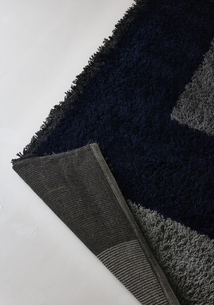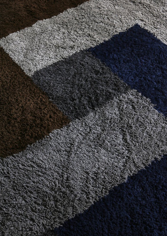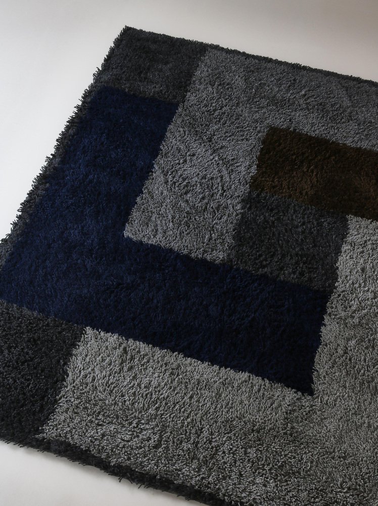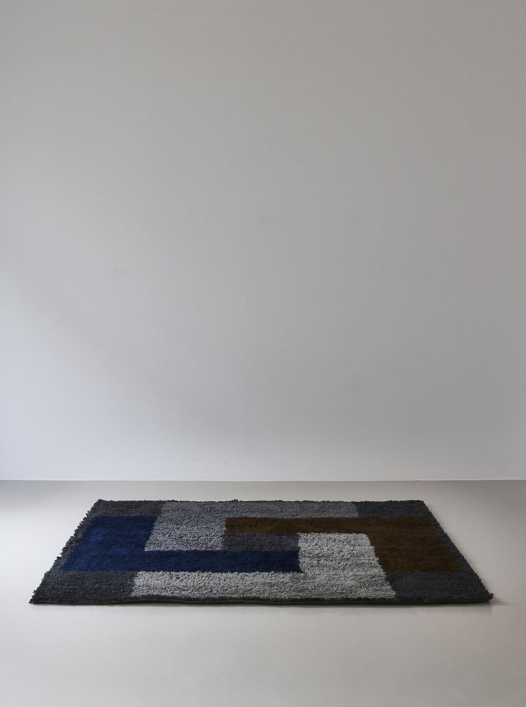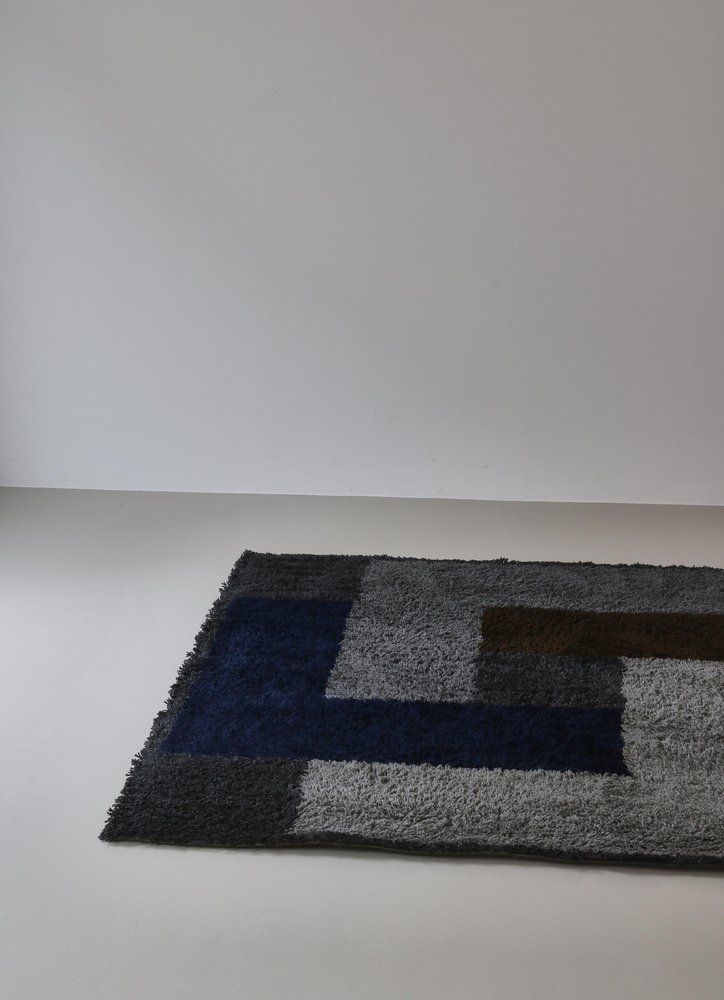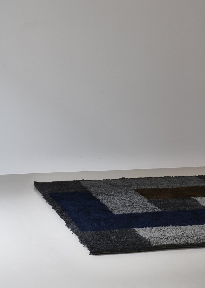 Large handmade "Rya" rug by Ross Littell made in Denmark in the 1960s at Unika-Væv. Hand woven in the Scandinavian Rya-tradition with a long pile in wonderful blue, grey and brown colours. This design was made by American designer Ross Littell who was an important figure in Danish Design in the 1960s through his collaboration with Nanna Ditzel and Verner Parton among others. This unique piece was used to decorate a Danish Modern furniture store in the 1960s and has been kept in storage ever since. The condition is therefore very good with few signs of wear. Though rya means "rug" in English, the original meaning in Sweden of rya was a bed cover with a knotted pile. The first ryas originated in the early fifteenth century as coarse, long-piled, heavy covers used by mariners instead of furs. As time progressed, the rugs have evolved to be lighter and more colorful. In the 1960s the Rya rugs was reinvented as an important part of the Danish Modern movement by designers such as Nanna Ditzel, Verner Panton and Ross Littell. American textile designer, artist and furniture designer Ross Littell was a passionate advocate of Scandinavian design. After receiving a degree in industrial design from Pratt Institute in New York Littell soon began an illustrious career producing designs for the likes of Knoll and Herman Miller in the 1950s and 1960s. He moved to Copenhagen in 1960 where his appreciation for Scandinavian design developed. Littell later moved to Italy before finally returning to his native California. During his time in Europe, Littell worked with a number of prominent textile and furniture manufacturers. Geometry, nature and motion proved constant inspirations for Littell throughout his career. In particular, he developed innovative fabric patterns based on mathematical combinations and rhythm. The resulting optical designs proved influential and are now a familiar image of the 1960s.