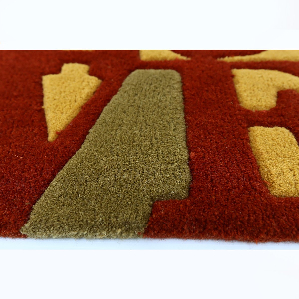 Robert Indiana decorative LOVE art rug in the ‘FALL’ edition of ambers, reds and browns.