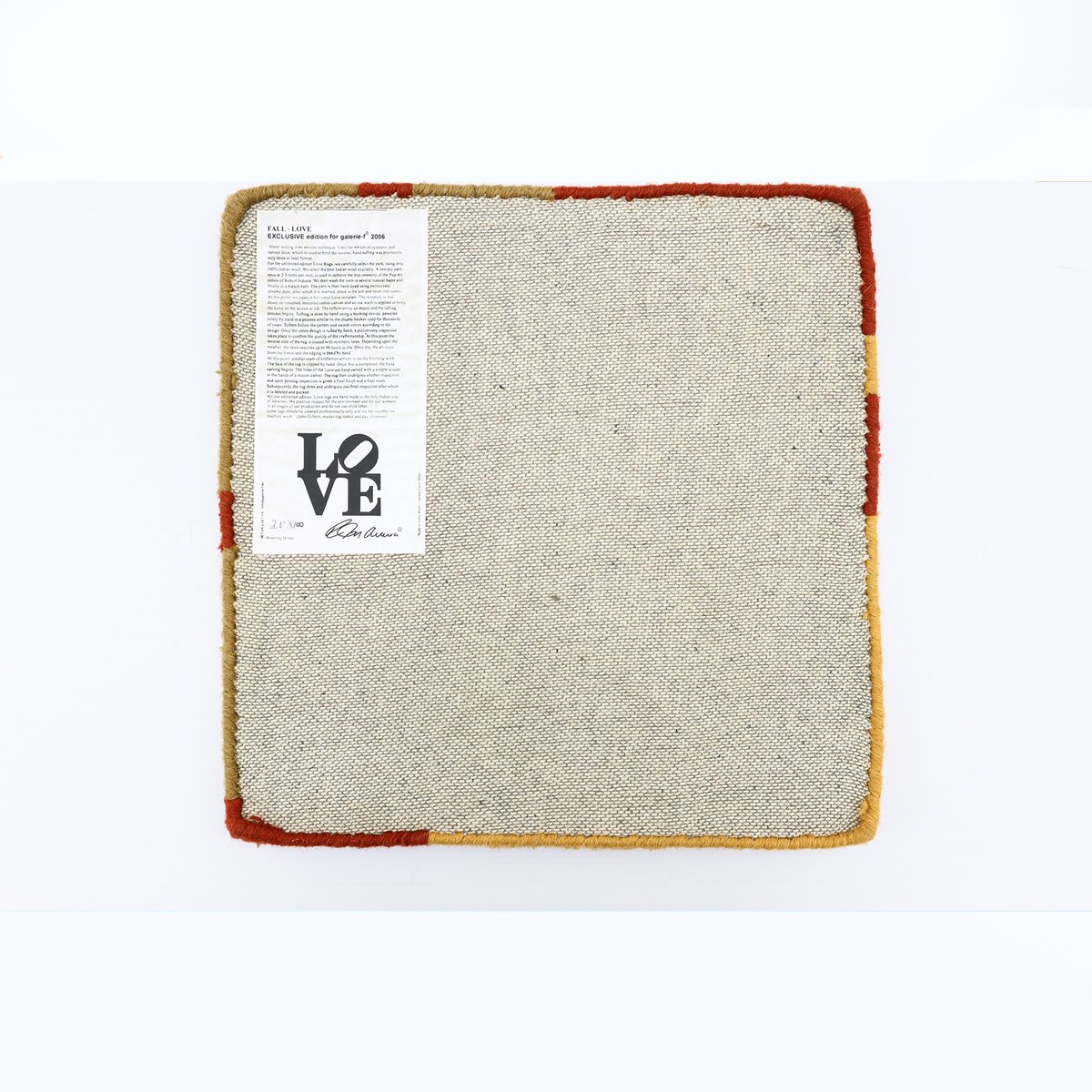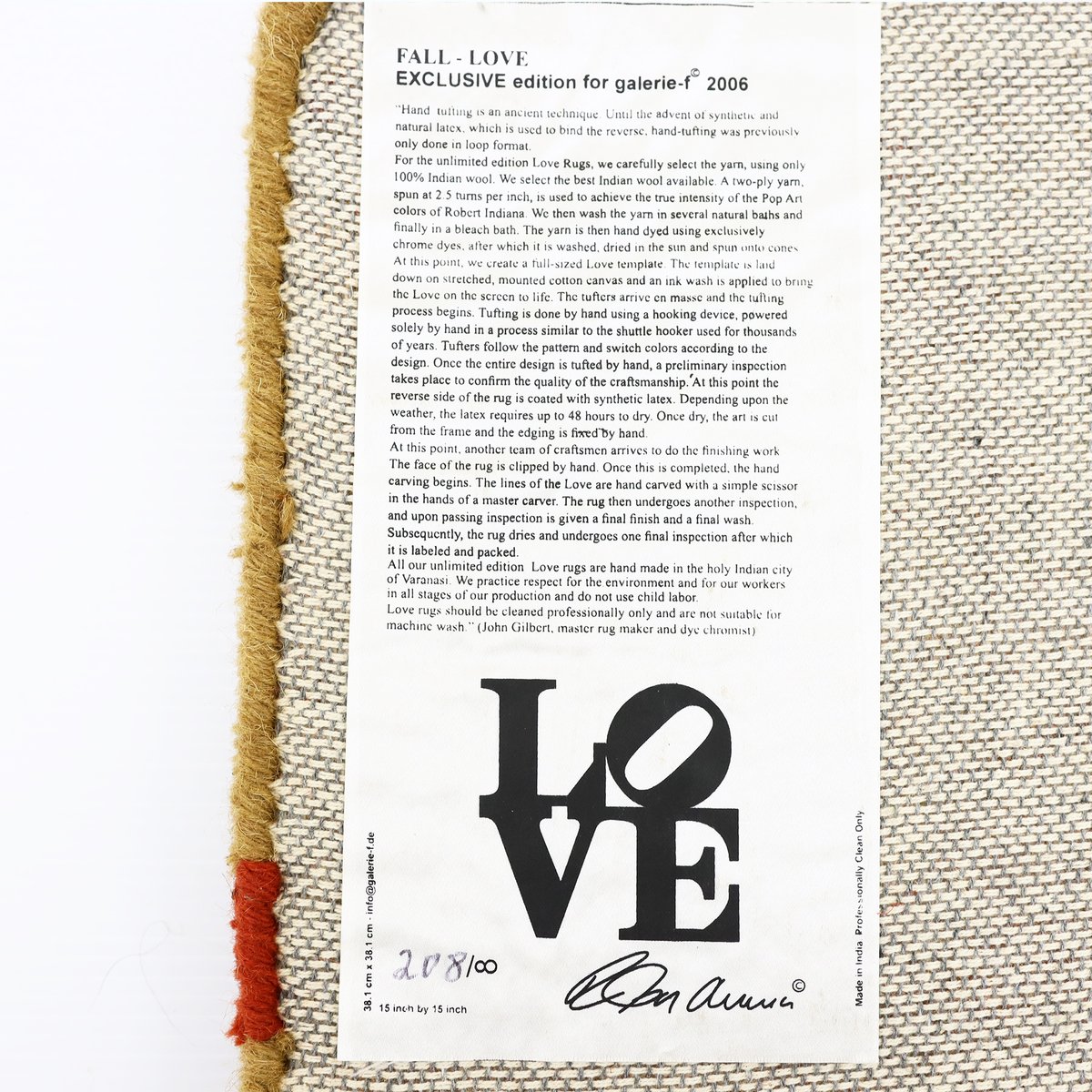 Los motivos LOVE de Indiana se crearon en una gama de colores que reflejan los colores de las estaciones del año y se fabricaron en lana empenachada a mano bajo licencia exclusiva para galerie-f, Krakenburg, Alemania, a partir de 2006. Las alfombras se hicieron a mano, se tiñeron y entintaron, y después se recortaron y tallaron a mano para darles un efecto casi tridimensional, como se puede ver en las fotos, donde parece que se puede tocar la superficie. Es un diseño maravilloso y el motivo de sus pinturas originales se ha utilizado en muchos artículos decorativos, como grabados, alfombras, cerámica y ropa.