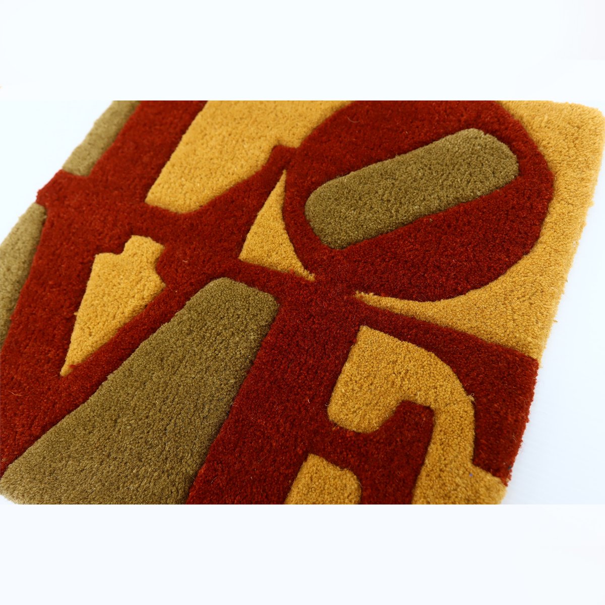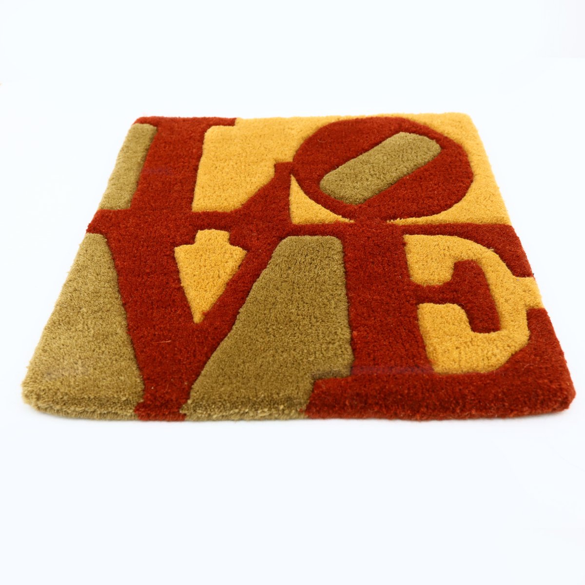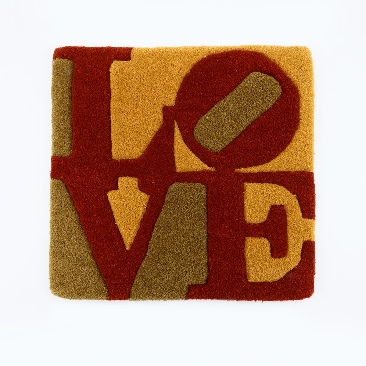 Indiana’s LOVE motifs were created in a range of colours to echo the colours of the seasons of the year and made in hand tufted wool under exclusive license for galerie-f, Krakenburg, Germany starting in 2006. The rugs were hand-made, dyed and inked and then hand clipped and carved to give an almost 3D like effect – which you can see in the pictures where it looks like you could actually reach out and touch the surface. It’s a wonderful design and the motif in his original paintings has been used for many decorative items including prints, rugs, pottery and clothing.