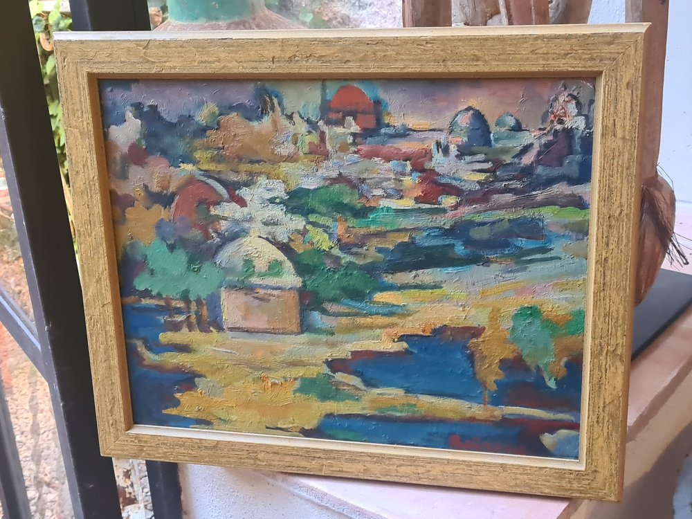 This vibrant painting captures an ethereal landscape imbued with dynamic movement and vibrant colour. The canvas is alive with sweeping strokes of blues, greens, and yellows, creating a rhythmic interplay that guides the viewer's eye across the composition. Nestled within this abstracted scenery are subtle hints of domed structures and lush vegetation, evoking a serene, dreamlike village. The artist skilfully blends bold, textured brushstrokes, providing depth and a sense of spontaneity. Each hue transitions seamlessly to the next, enabling the colours to dance harmoniously and evoke emotions of tranquillity and wonder. The rendering of light and shadow is masterfully executed, enhancing the atmospheric quality. This piece stands out for its ability to convey both simplicity and complexity, offering an immersive visual experience that invites contemplation and interpretation.