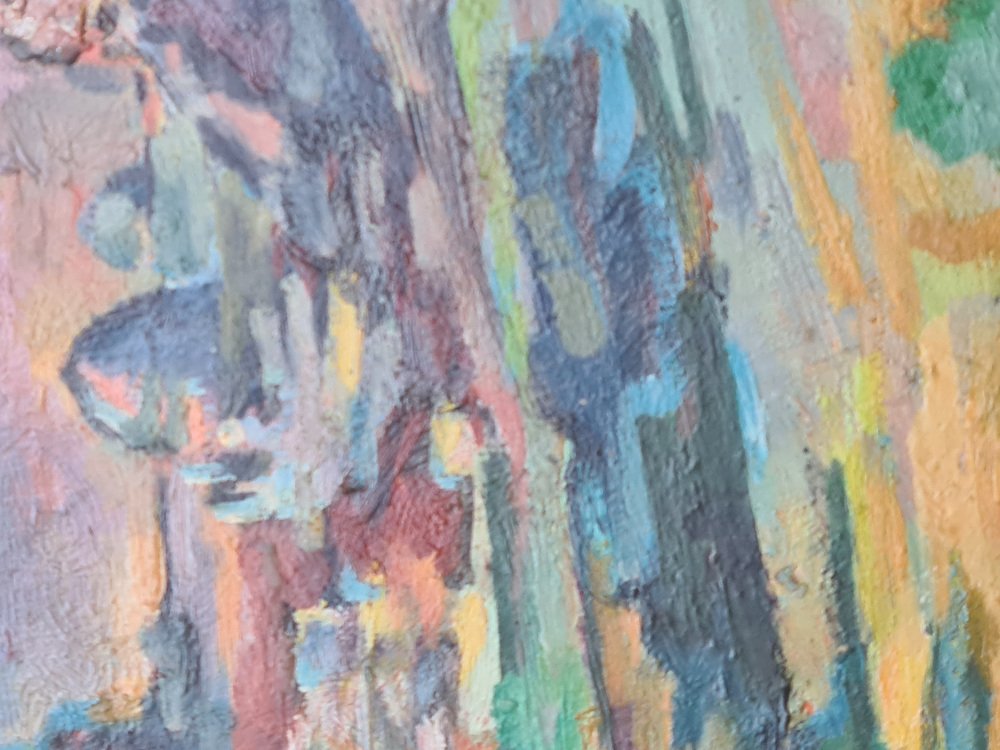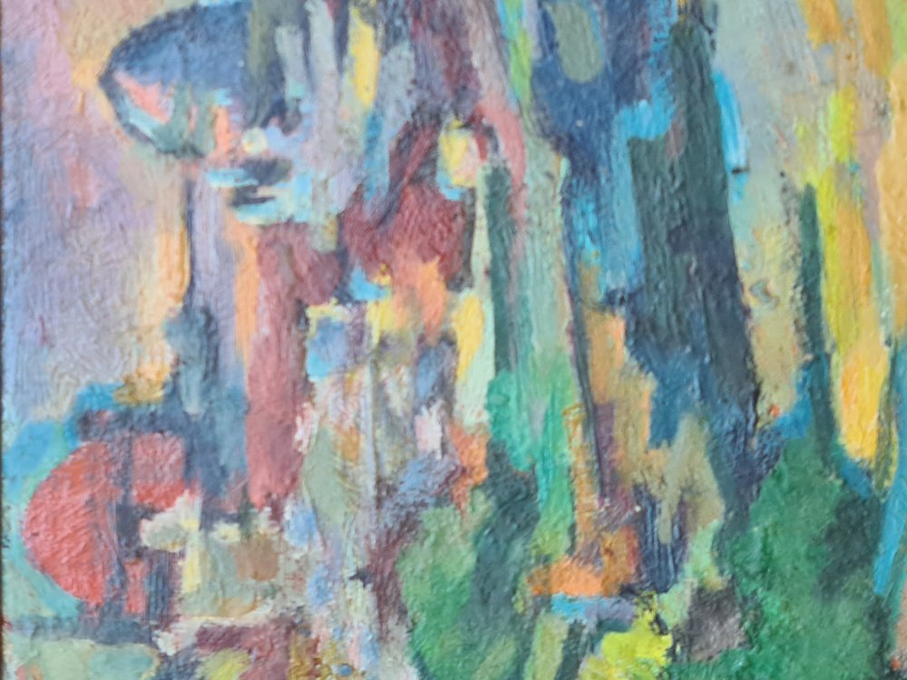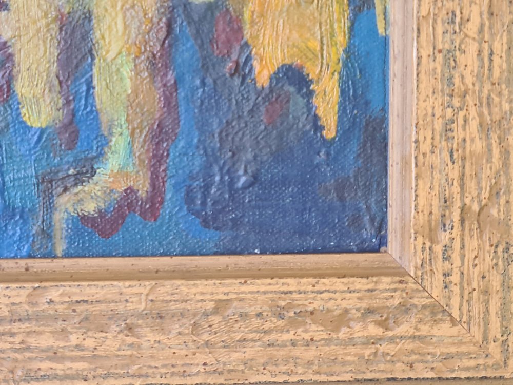 Esta vibrante pintura captura un paisaje etéreo impregnado de movimiento dinámico y color vibrante. El lienzo está lleno de pinceladas de azules, verdes y amarillos que crean una interacción rítmica que guía la mirada del espectador a través de la composición. Dentro de este paisaje abstracto hay sutiles toques de estructuras abovedadas y exuberante vegetación, que evocan un pueblo sereno y onírico. El artista combina hábilmente pinceladas atrevidas y texturadas que aportan profundidad y una sensación de espontaneidad. Cada matiz se funde con el siguiente, permitiendo que los colores bailen armoniosamente y evoquen emociones de tranquilidad y asombro. La representación de la luz y la sombra está ejecutada con maestría, realzando la calidad atmosférica. Esta obra destaca por su capacidad para transmitir simplicidad y complejidad, ofreciendo una experiencia visual envolvente que invita a la contemplación y la interpretación.