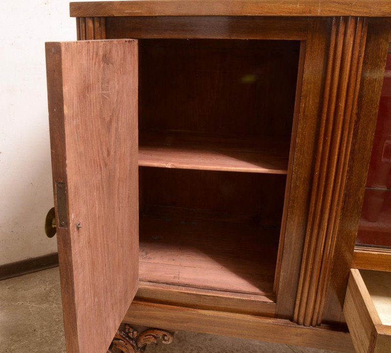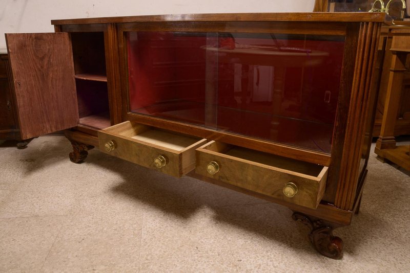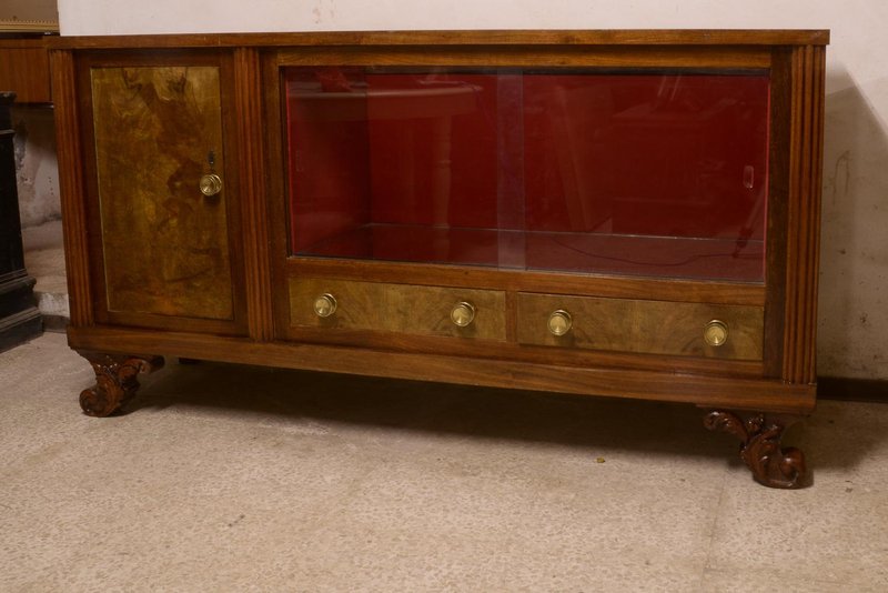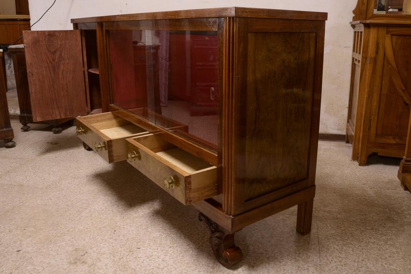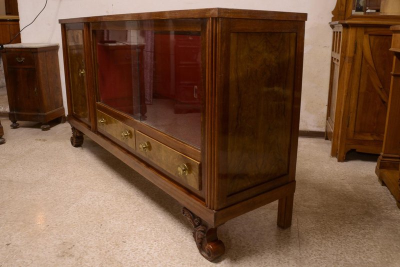 Art deco buffet sideboard in walnut burl with two sliding glass doors, curly carved feet, a closed door and two drawers, complete with brass knobs, Italian design, made in the 1940s. Measurements cm 193 x 49 x h 101 CATEGORY sideboards buffets STYLE art deco DIMENSIONS: HEIGHT cm 101 WIDTH cm 193 DEPTH cm 49 DIAMETER cm COLOR: red brown MATERIAL: walnut veneer walnut burl CONDITIONS: Good vintage item, fully functional but shows signs of wear such as scratches, dents, material defects and repairs