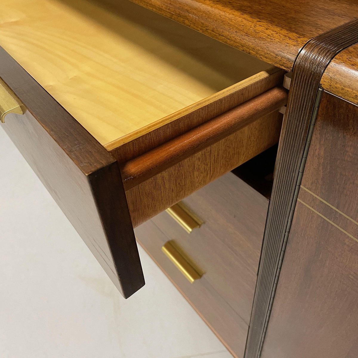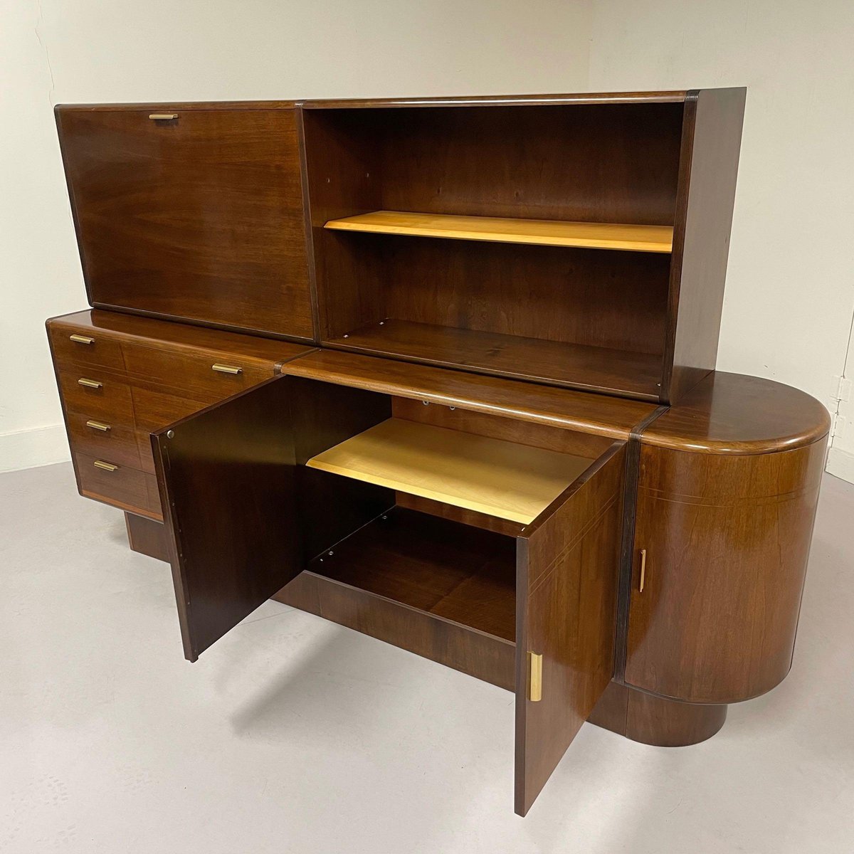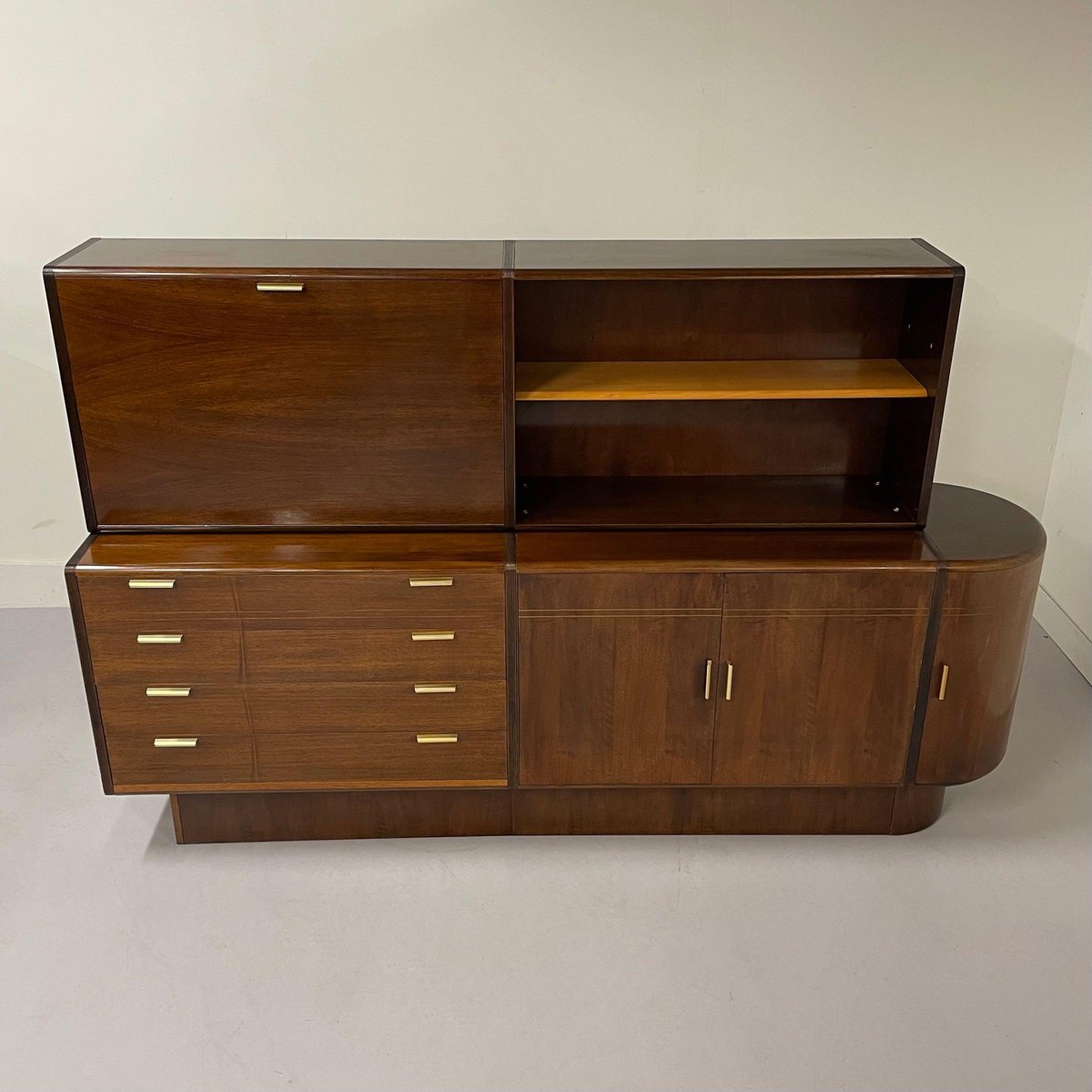 Aparador con mueble superior y barra diseñado por A.A. Patijn para la fábrica de muebles holandesa Zijlstra, década de 1950. Este aparador con lateral redondo pertenece a la serie Poly-Z. Las formas redondas son muy características en los diseños de A.A. Patijn. Este aparador tiene una barra, cuatro cajones sin polvo (con lados redondos, como Cees Braakman) para facilitar la limpieza, una librería y dos armarios de almacenamiento en la parte inferior derecha. El estado de conservación sigue siendo muy bueno y original, con ligeras huellas de la edad y el uso. Material: Madera, chapa de madera, nogal, cristal y latón. Dimensiones: alto x ancho x fondo = 130 x 204 x 44 cm. Altura aparador (sin armario superior) 74 cm.