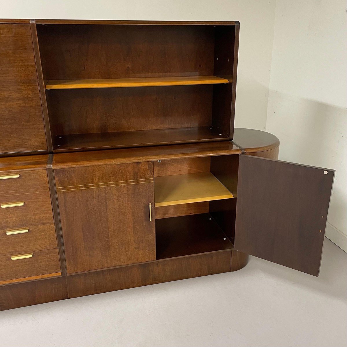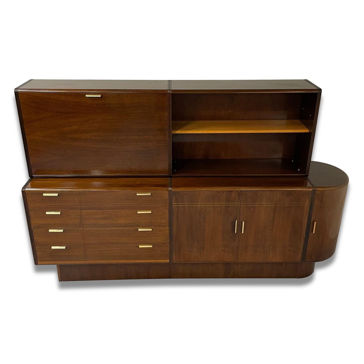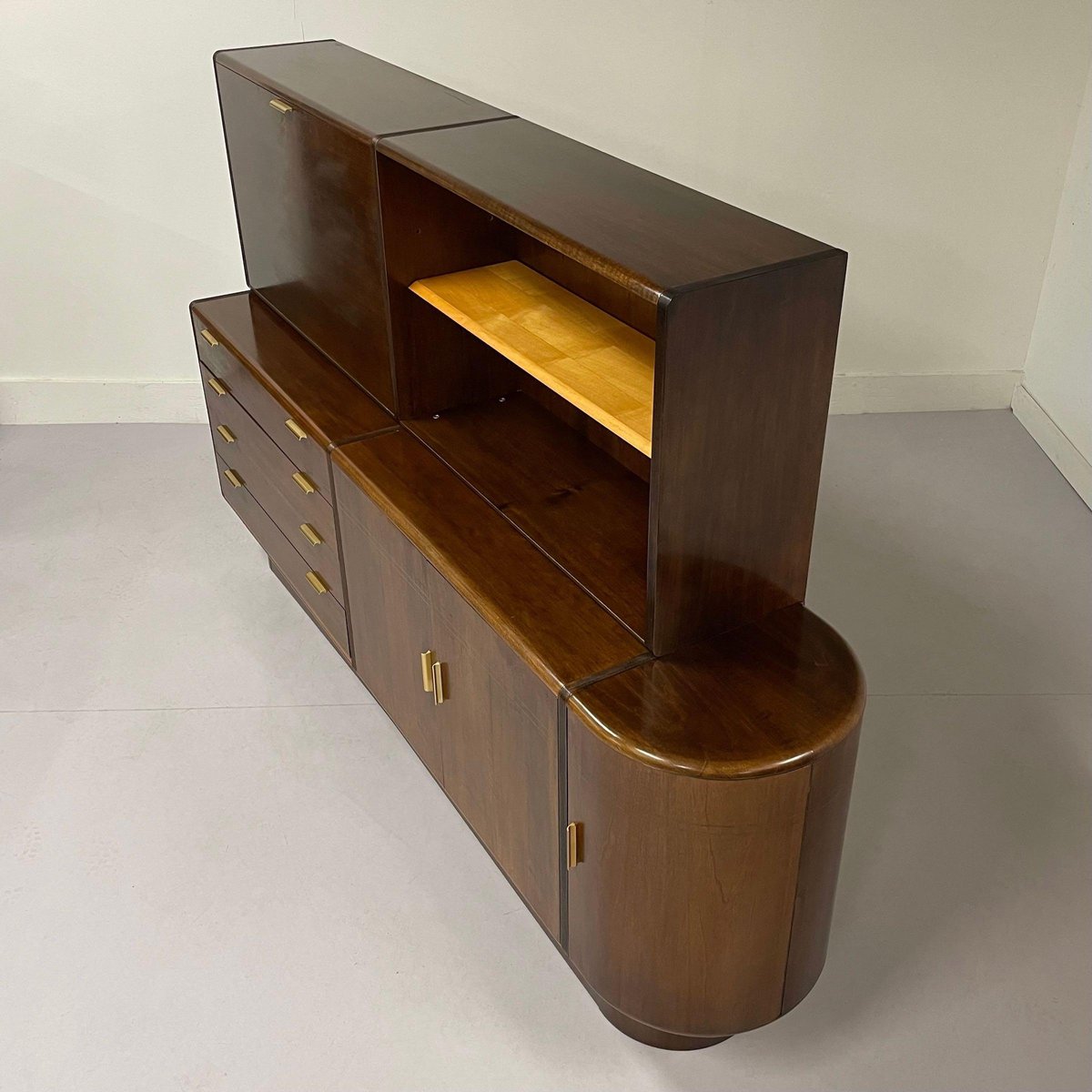 Sideboard with top cabinet and bar designed by A.A. Patijn for the Dutch furniture factory Zijlstra, 1950s. This sideboard with round side is from the Poly-Z series. The round shapes are very characteristic in the designs of A.A. Patijn. This sideboard has a bar, four dust-free drawers (with round sides, just like Cees Braakman) for easy cleaning, a bookcase and two storage cabinets at the bottom right. The condition is still very good and original condition with light traces of age and use. Material: Wood, veneer, walnut, glass and brass. Dimensions: h x w x d = 130 x 204 x 44 cm. Height sideboard (without top cabinet) 74 cm.