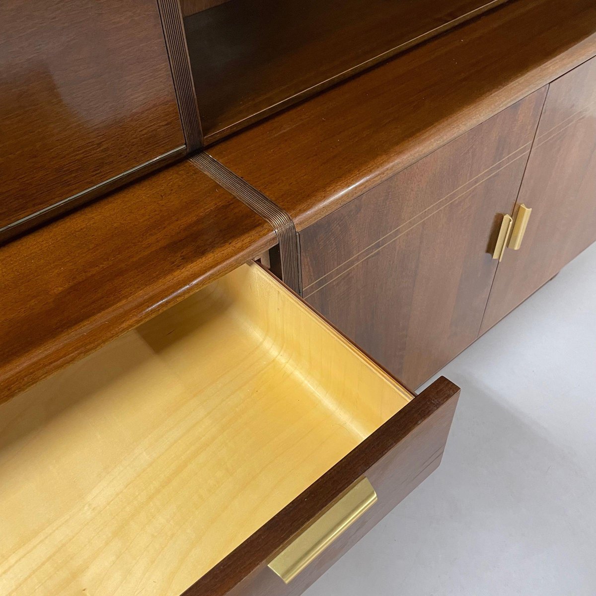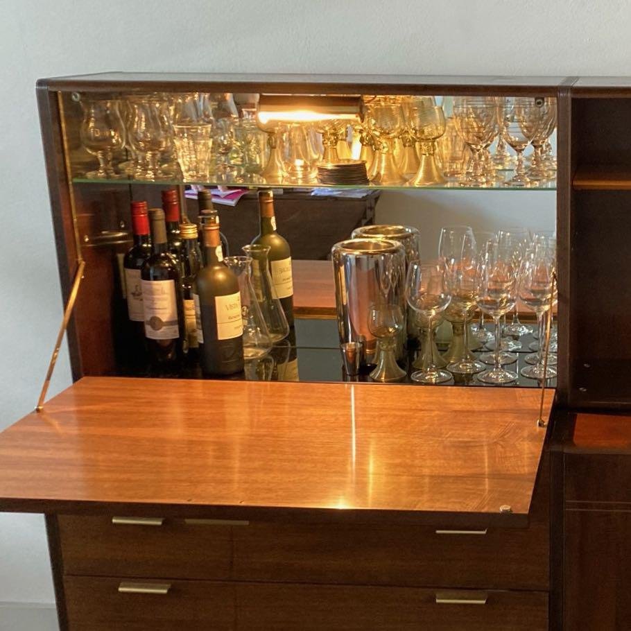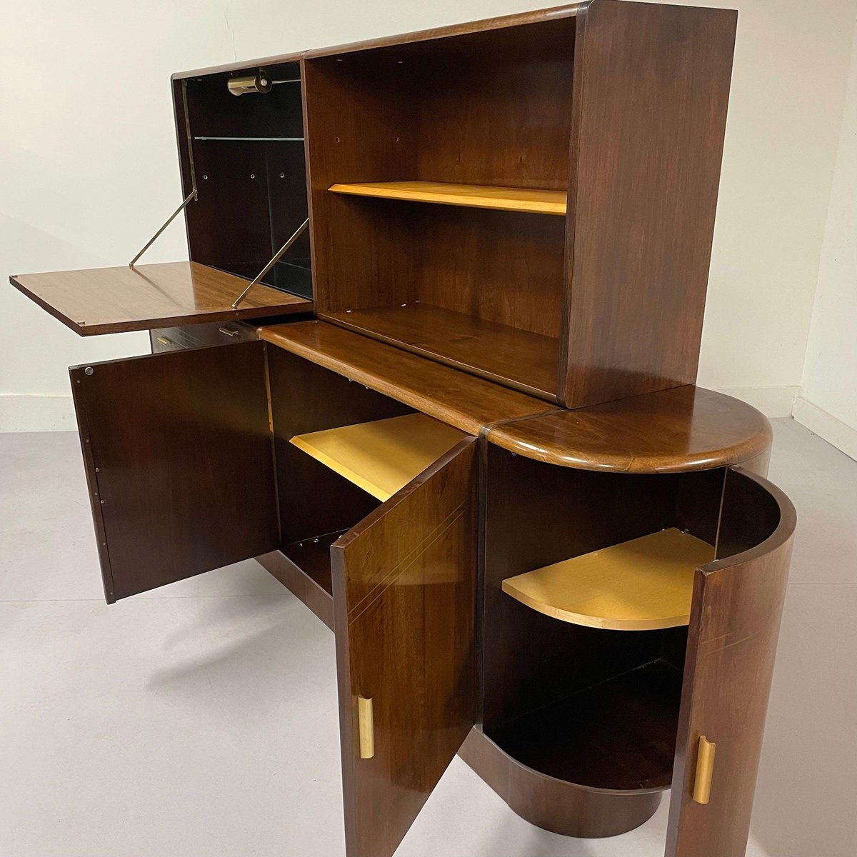Sideboard with top cabinet and bar designed by A.A. Patijn for the Dutch furniture factory Zijlstra, 1950s. This sideboard with round side is from the Poly-Z series. The round shapes are very characteristic in the designs of A.A. Patijn. This sideboard has a bar, four dust-free drawers (with round sides, just like Cees Braakman) for easy cleaning, a bookcase and two storage cabinets at the bottom right. The condition is still very good and original condition with light traces of age and use. Material: Wood, veneer, walnut, glass and brass. Dimensions: h x w x d = 130 x 204 x 44 cm. Height sideboard (without top cabinet) 74 cm.