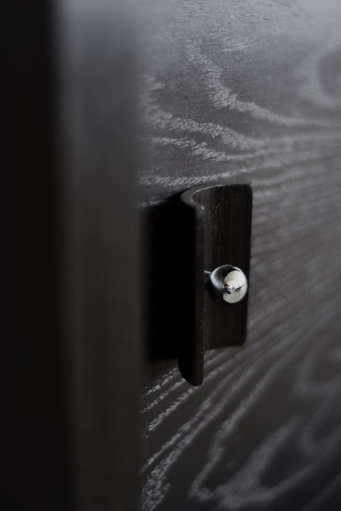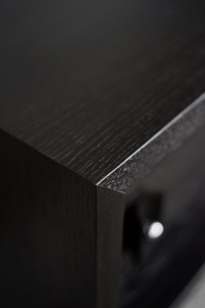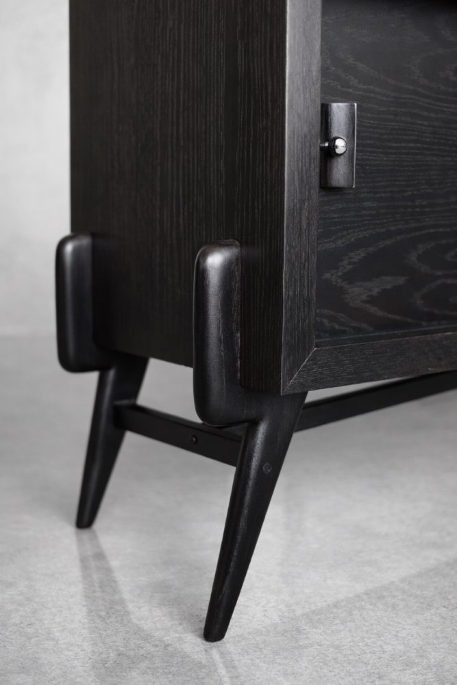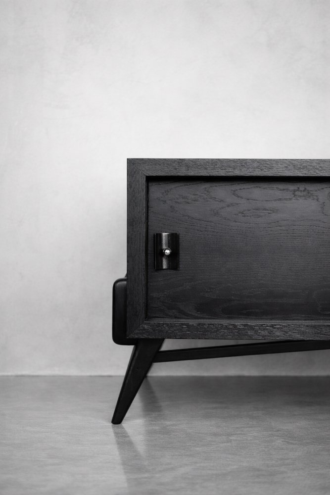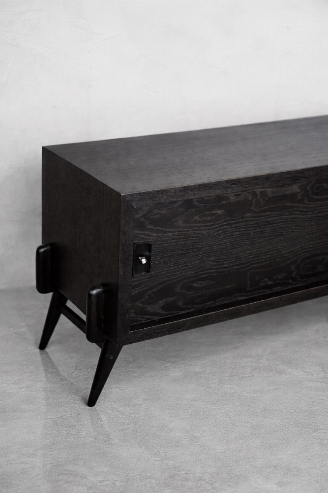 This modernist sideboard was made in Scandinavia during the 1960s. It was made of oak wood, which is considered royal wood. It is a very strong and durable material with rich grain. The wood is resistant to scratches and damage, and becomes noble with age. This sideboard is finished in a dark, varied color. from brownish tones to intense dark brown, which, depending on the angle of light, may give the impression of black. The strong, patterned grain flows harmoniously here. This creates a stuning visual effect. The front is a pair of sliding doors. There is one shelf and empty space inside. The geometric handles are made of wood supplemented with a metal ball. Elegant wooden legs perfectly match the sideboard. The multi-dimensional design of the furniture, materials used, non-obvious color and workmanship with the utmost care make it an extremely interesting object that will fit into many arrangements, from industrial to modern interiors.
