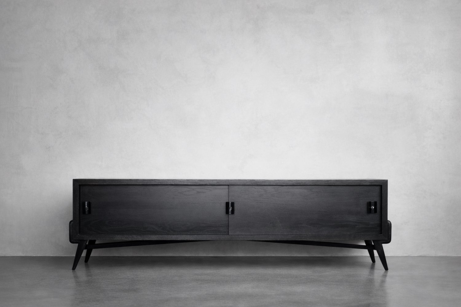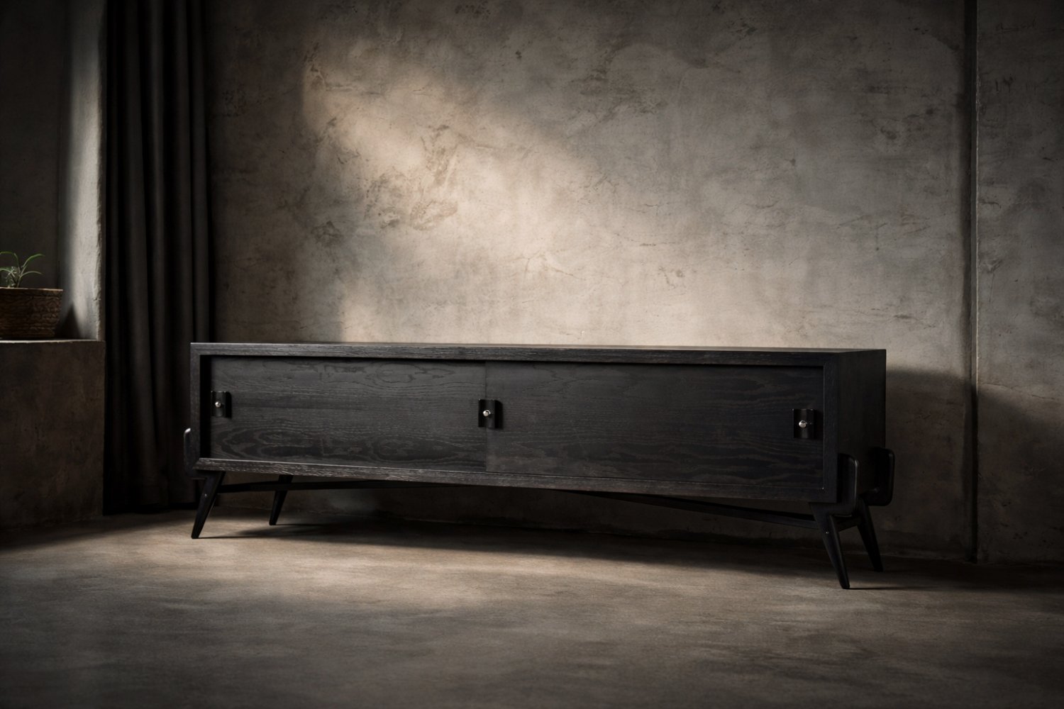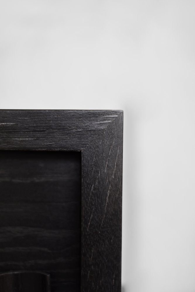 This modernist sideboard was made in Scandinavia during the 1960s. It was made of oak wood, which is considered royal wood. It is a very strong and durable material with rich grain. The wood is resistant to scratches and damage, and becomes noble with age. This sideboard is finished in a dark, varied color. from brownish tones to intense dark brown, which, depending on the angle of light, may give the impression of black. The strong, patterned grain flows harmoniously here. This creates a stuning visual effect. The front is a pair of sliding doors. There is one shelf and empty space inside. The geometric handles are made of wood supplemented with a metal ball. Elegant wooden legs perfectly match the sideboard. The multi-dimensional design of the furniture, materials used, non-obvious color and workmanship with the utmost care make it an extremely interesting object that will fit into many arrangements, from industrial to modern interiors.