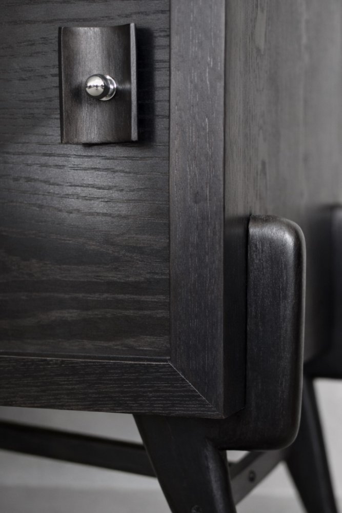 Este aparador modernista fue fabricado en Escandinavia durante la década de 1960. Está hecho de madera de roble, considerada una madera noble. Es un material muy resistente y duradero con un veteado muy marcado. La madera es resistente a los arañazos y los daños, y se vuelve más noble con el paso del tiempo. Este aparador tiene un acabado en un color oscuro y variado, desde tonos marrones hasta marrones oscuros intensos, que, dependiendo del ángulo de la luz, pueden dar la impresión de ser negros. Las vetas, fuertes y con dibujos, fluyen armoniosamente, lo que crea un efecto visual impresionante. La parte delantera está formada por un par de puertas correderas. En el interior hay un estante y un espacio vacío. Los tiradores geométricos son de madera y están complementados con una bola de metal. Las elegantes patas de madera combinan perfectamente con el aparador. El diseño multidimensional del mueble, los materiales utilizados, el color poco obvio y la mano de obra con el máximo cuidado lo convierten en un objeto extremadamente interesante que encajará en muchos arreglos, desde interiores industriales hasta modernos. El aparador ha sido restaurado y se encuentra en muy buen estado vintage.
