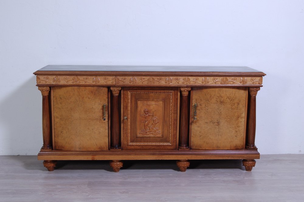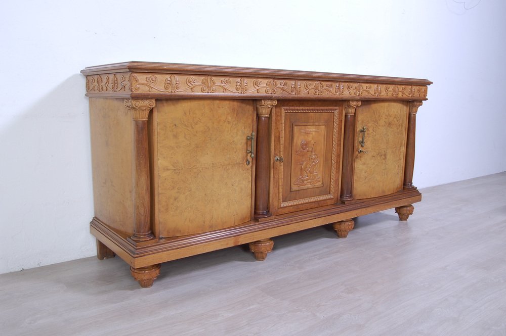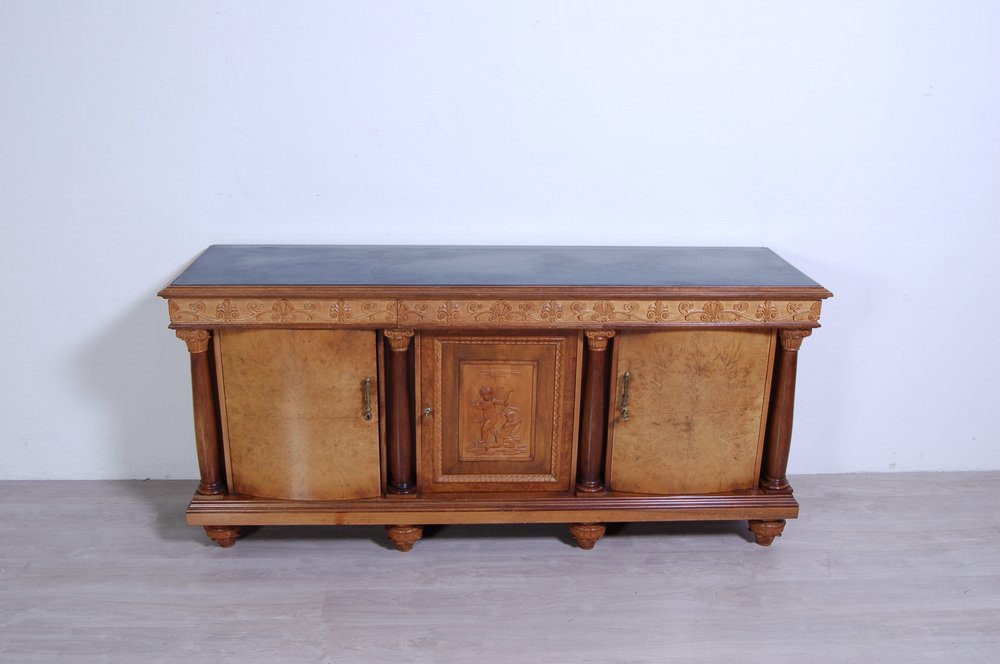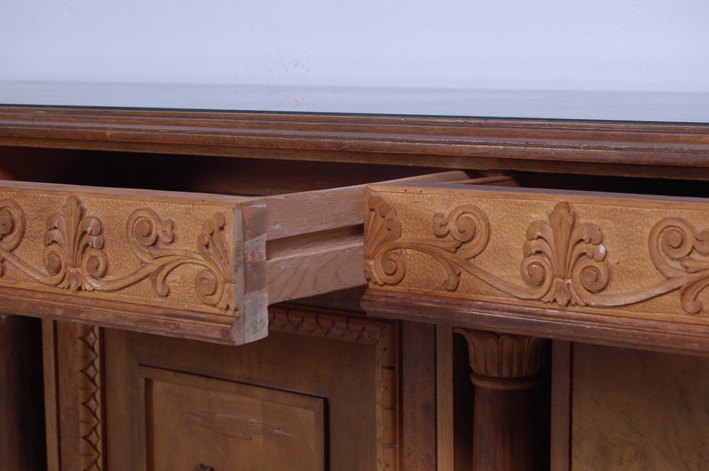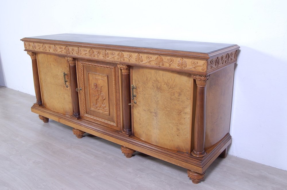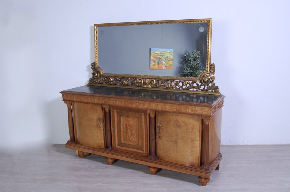 Imposing sideboard with mirror, furniture room Italian production (Milan Brianza) 1940s-1950s; the design takes up the classic empire style.