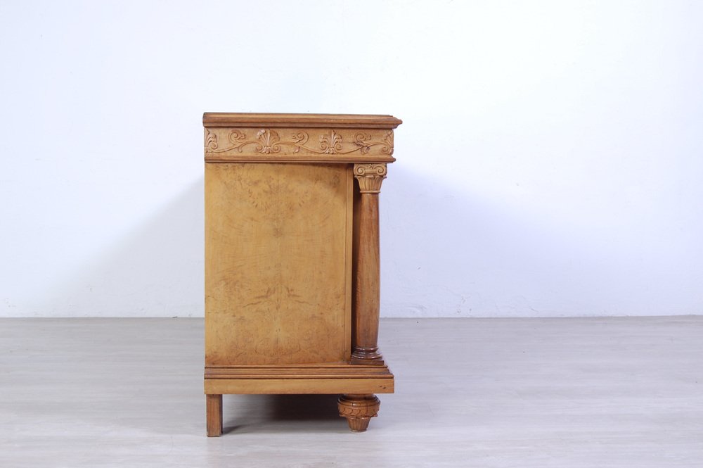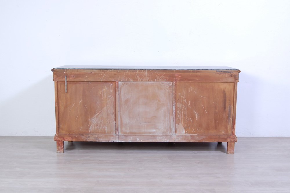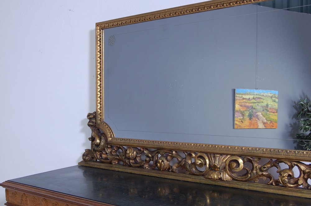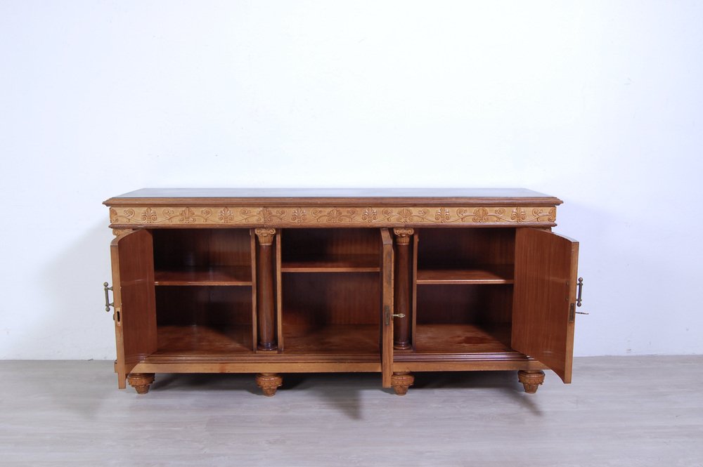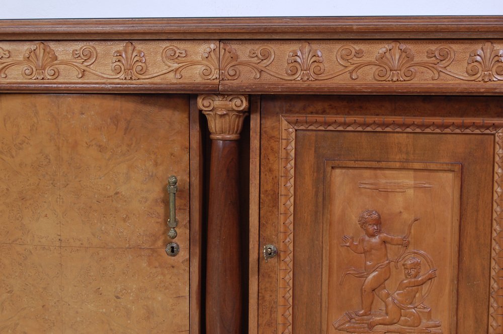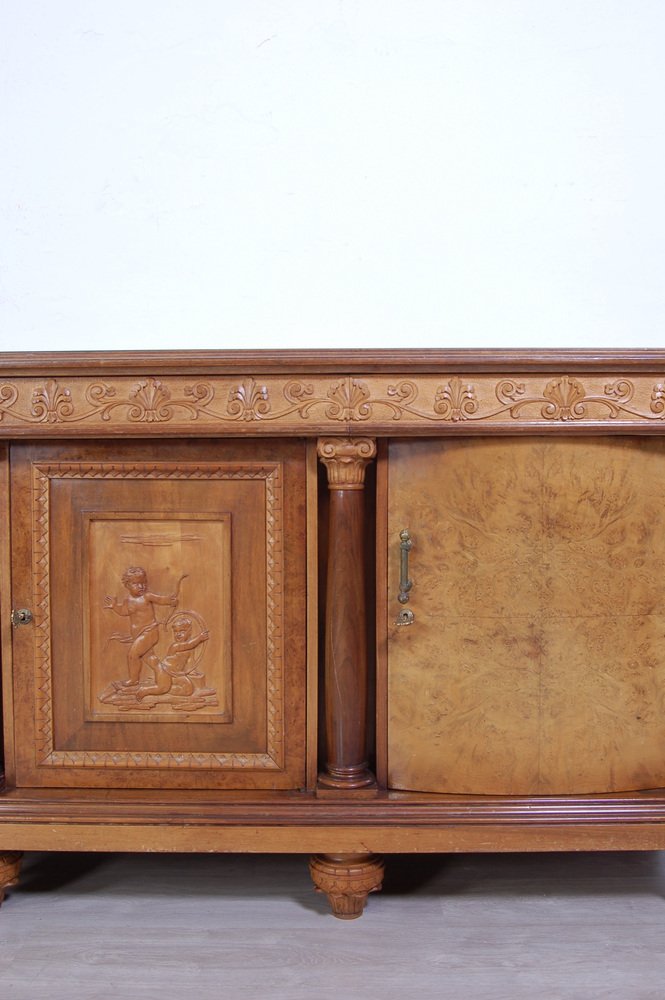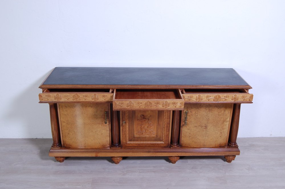 Imposing sideboard with mirror, furniture room Italian production (Milan Brianza) 1940s-1950s; the design takes up the classic empire style.