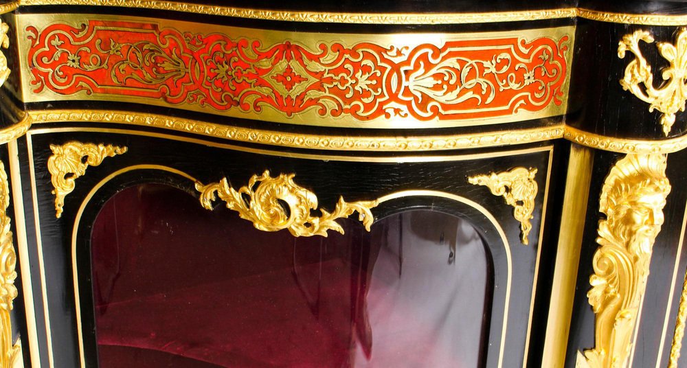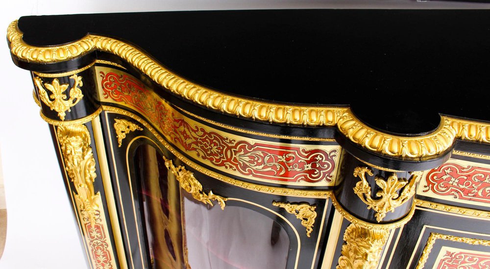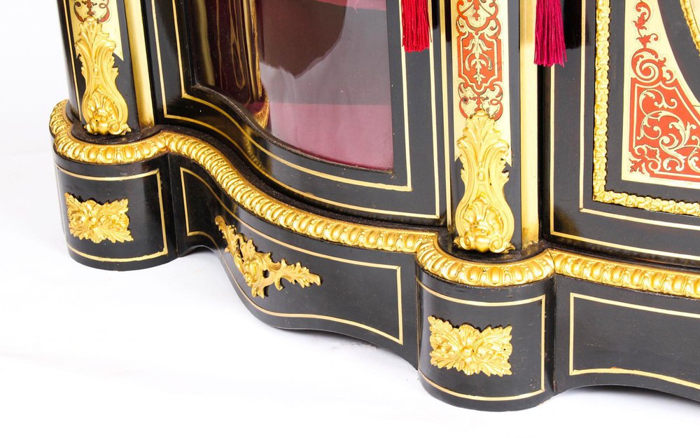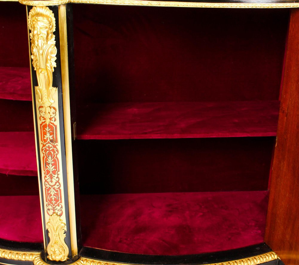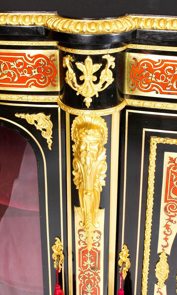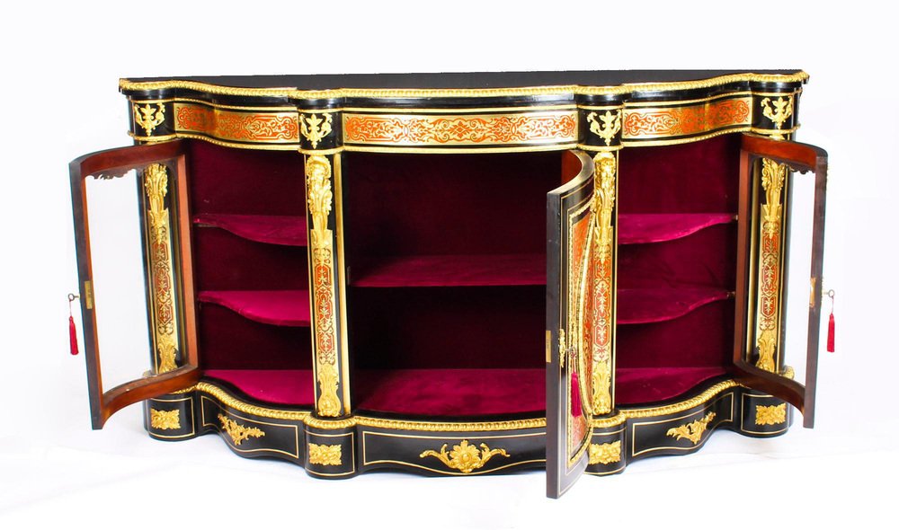 This is an important antique, Victorian, ebonised, ormolu mounted, and red Boulle cut brass marquetry serpentine credenza, circa 1870 in date. It is beautifully inlaid in cut brass, in addition there is scrolling acanthus foliage with flowers and honeysuckle. It is further adorned with a plethora of fabulous ormolu mounts. The central cupboard door, with raised oval panel, encloses a burgundy velvet lined interior with a shelf, and is flanked by a serpentine glass door opening to shelves on each side.. The credenza is raised on a plinth base and has its original working locks and keys. This is an absolutely breathtaking piece which is certain to make it a talking point in your home, it is nearly identical to one that can be seen in the Award Winning Television Drama, Downton Abbey, which is filmed at Highclere Castle in Hampshire and is the home of the Earl and Countess of Carnarvon. The exterior shots and much of the interior filming takes place there Condition: In excellent condition having been beautifully restored and the interior relined in our workshops, please see photos for confirmation. Dimensions in cm: Height 106 x Width 197 x Depth 47