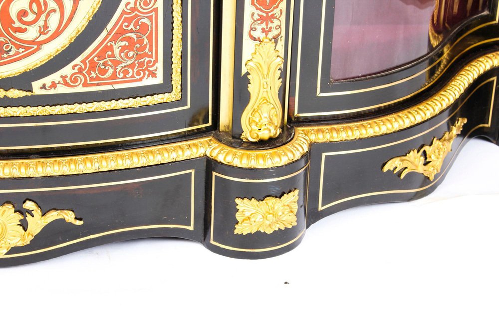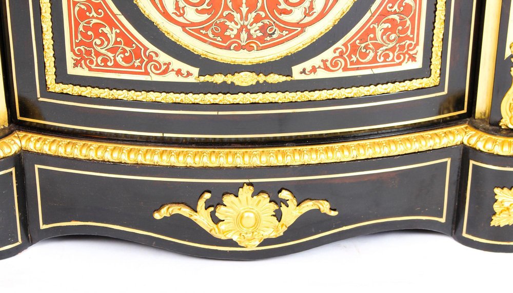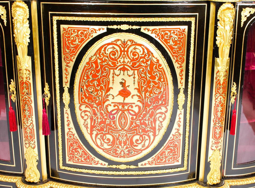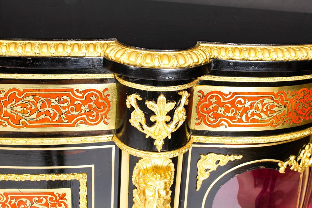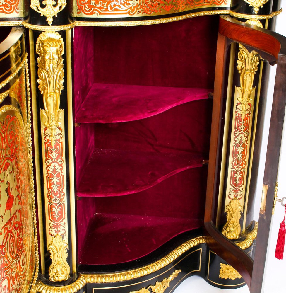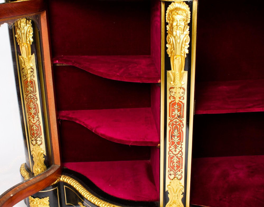 This is an important antique, Victorian, ebonised, ormolu mounted, and red Boulle cut brass marquetry serpentine credenza, circa 1870 in date. It is beautifully inlaid in cut brass, in addition there is scrolling acanthus foliage with flowers and honeysuckle. It is further adorned with a plethora of fabulous ormolu mounts. The central cupboard door, with raised oval panel, encloses a burgundy velvet lined interior with a shelf, and is flanked by a serpentine glass door opening to shelves on each side.. The credenza is raised on a plinth base and has its original working locks and keys. This is an absolutely breathtaking piece which is certain to make it a talking point in your home, it is nearly identical to one that can be seen in the Award Winning Television Drama, Downton Abbey, which is filmed at Highclere Castle in Hampshire and is the home of the Earl and Countess of Carnarvon. The exterior shots and much of the interior filming takes place there Condition: In excellent condition having been beautifully restored and the interior relined in our workshops, please see photos for confirmation. Dimensions in cm: Height 106 x Width 197 x Depth 47