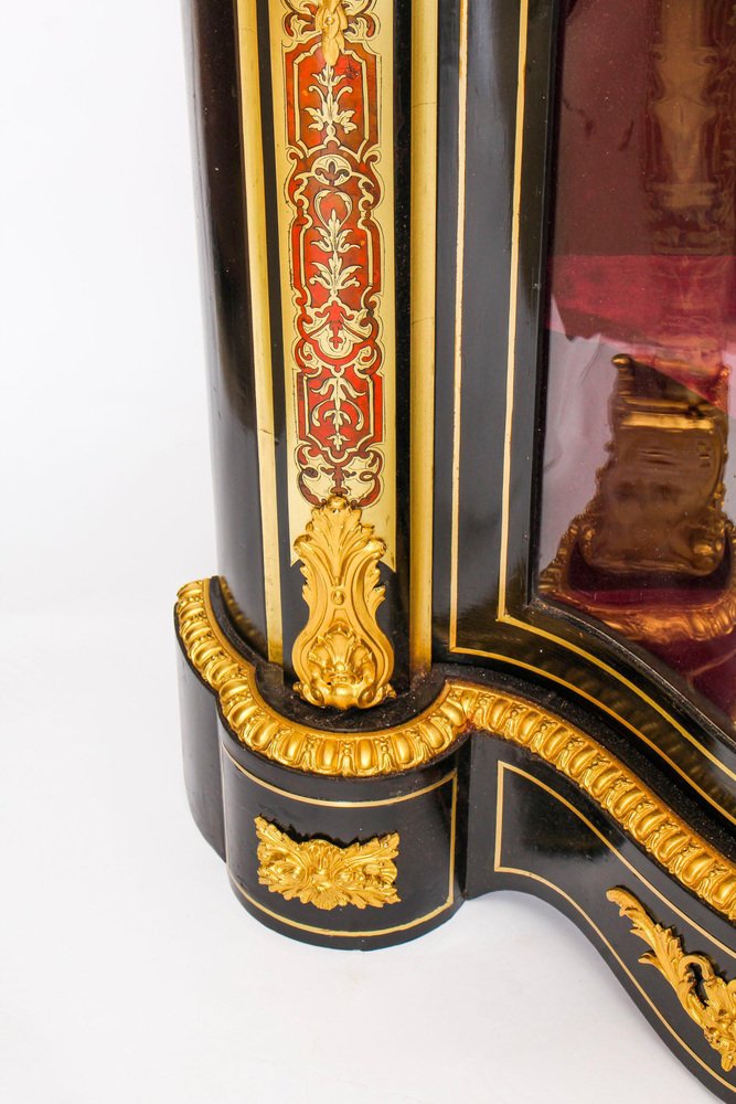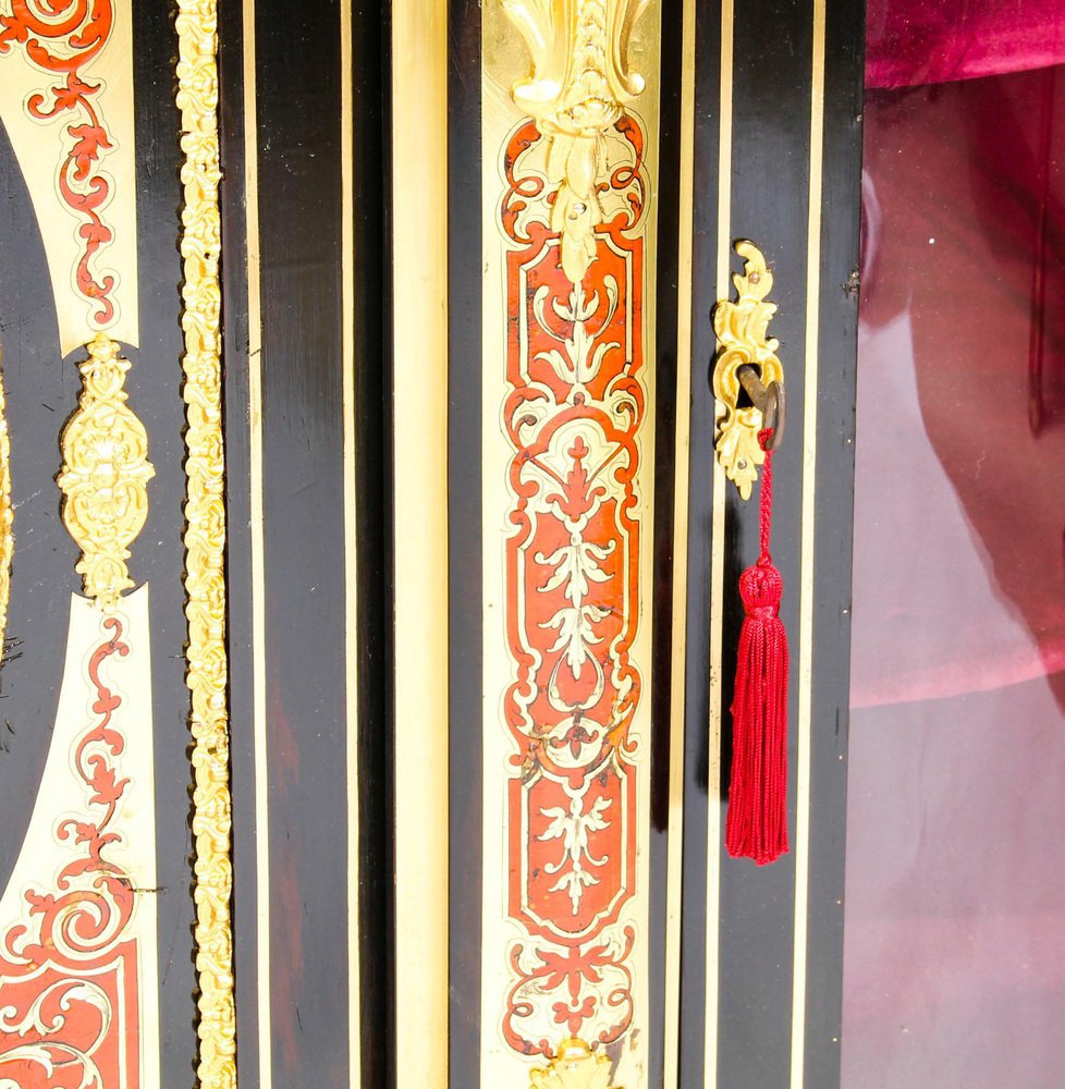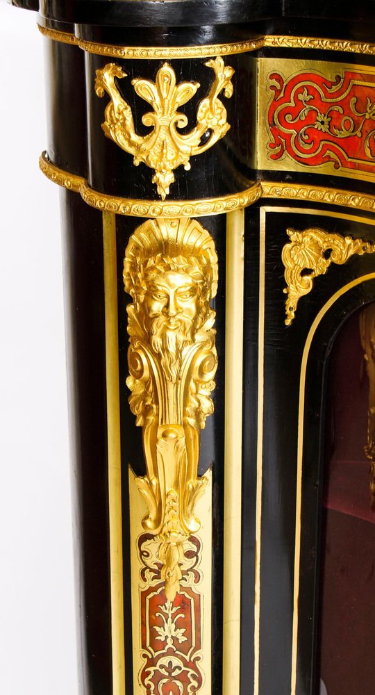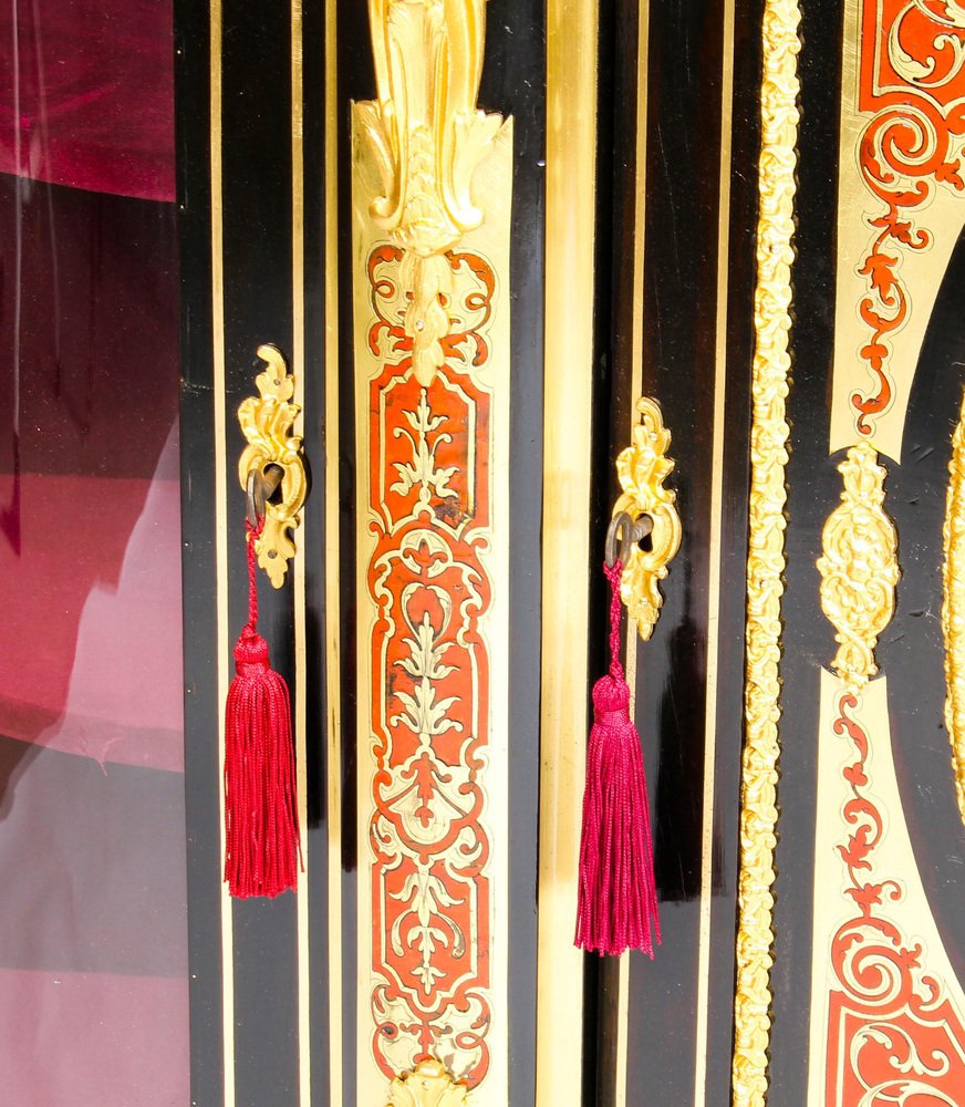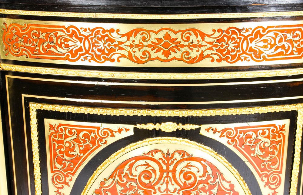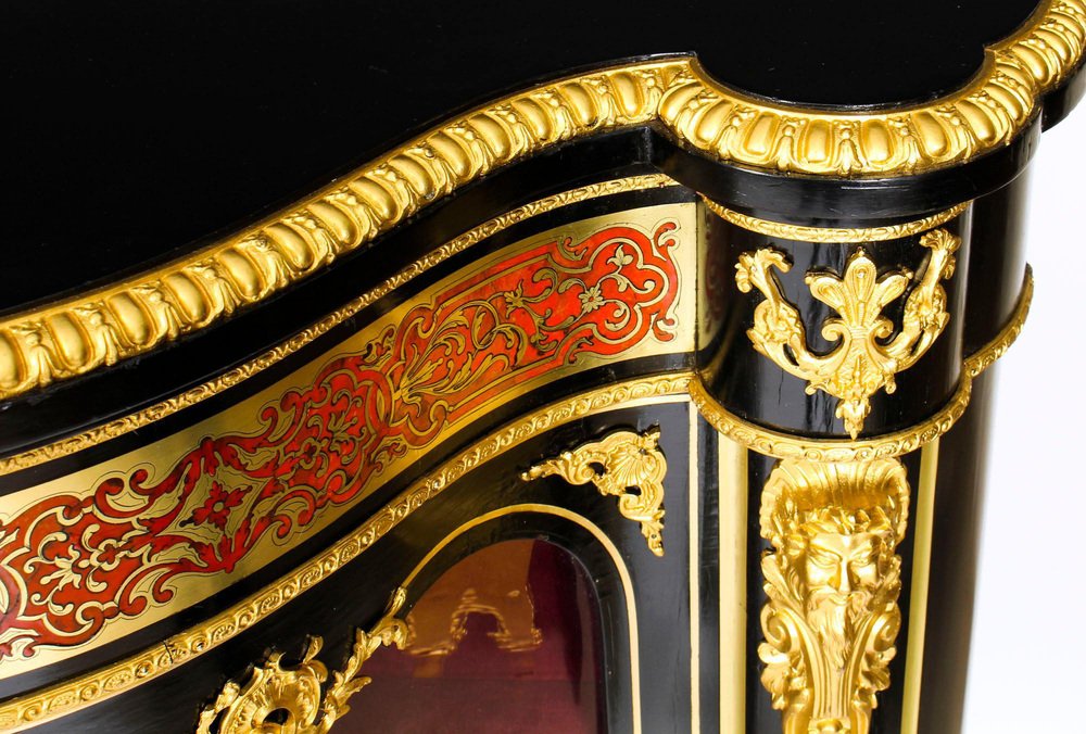 This is an important antique, Victorian, ebonised, ormolu mounted, and red Boulle cut brass marquetry serpentine credenza, circa 1870 in date. It is beautifully inlaid in cut brass, in addition there is scrolling acanthus foliage with flowers and honeysuckle. It is further adorned with a plethora of fabulous ormolu mounts. The central cupboard door, with raised oval panel, encloses a burgundy velvet lined interior with a shelf, and is flanked by a serpentine glass door opening to shelves on each side.. The credenza is raised on a plinth base and has its original working locks and keys. This is an absolutely breathtaking piece which is certain to make it a talking point in your home, it is nearly identical to one that can be seen in the Award Winning Television Drama, Downton Abbey, which is filmed at Highclere Castle in Hampshire and is the home of the Earl and Countess of Carnarvon. The exterior shots and much of the interior filming takes place there Condition: In excellent condition having been beautifully restored and the interior relined in our workshops, please see photos for confirmation. Dimensions in cm: Height 106 x Width 197 x Depth 47