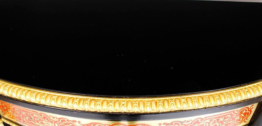 Esta es una importante credenza antigua, victoriana, ebonizada, montada en ormolu y con marquetería de latón cortado rojo Boulle, fechada hacia 1870. Presenta hermosas incrustaciones de latón tallado, además de follaje de acanto con flores y madreselva. Además, está adornado con una plétora de fabulosas monturas de ormolu. La puerta central del armario, con un panel oval elevado, encierra un interior forrado de terciopelo burdeos con un estante, y está flanqueada por una puerta de cristal en forma de serpiente que se abre a sendos estantes. El aparador se levanta sobre un zócalo y tiene sus cerraduras y llaves originales. Se trata de una pieza absolutamente impresionante que sin duda dará mucho que hablar en su hogar. Es casi idéntica a la que puede verse en la galardonada serie de televisión Downton Abbey, que se rueda en el castillo de Highclere, en Hampshire, donde viven el conde y la condesa de Carnarvon. Las tomas exteriores y gran parte de la filmación interior tienen lugar allí: En excelentes condiciones después de haber sido bellamente restaurado y el interior revestido en nuestros talleres, por favor vea las fotos para su confirmación. Dimensiones en cm: Altura 106 x Anchura 197 x Profundidad 47