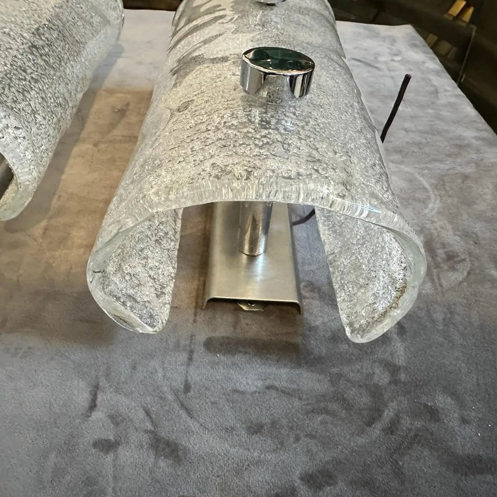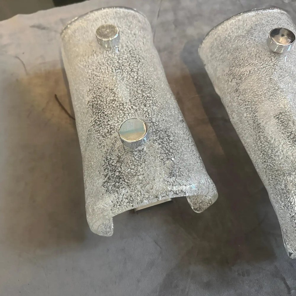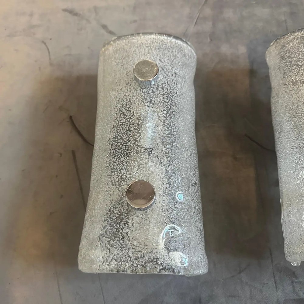This stunning pair of vintage Italian wall sconces beautifully encapsulates the Space Age design movement of the 1970s. Each sconce features a semi-cylindrical shade of thick, curved Murano glass. The glass itself is a masterful blend of flecked white and clear hues, characterized by a granular, light-diffusing texture that creates a dramatic visual effect when illuminated. The shades are mounted with sleek, contrasting polished steel studs, emphasizing the modernist and retro-futuristic style. These pieces were crafted in Italy by Mazzega and are in excellent vintage condition, showing only minor wear consistent with their age. They are perfect for casting a warm, inviting glow in a hallway, living room, or as unique bedside lighting. These striking sconces are a must-have for collectors of sophisticated vintage Italian lighting and Murano glass. The sconces are in very good condition overall and ready to be used.