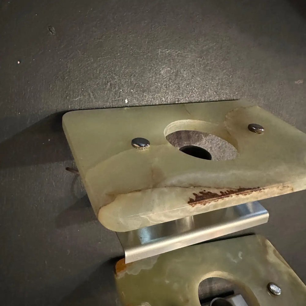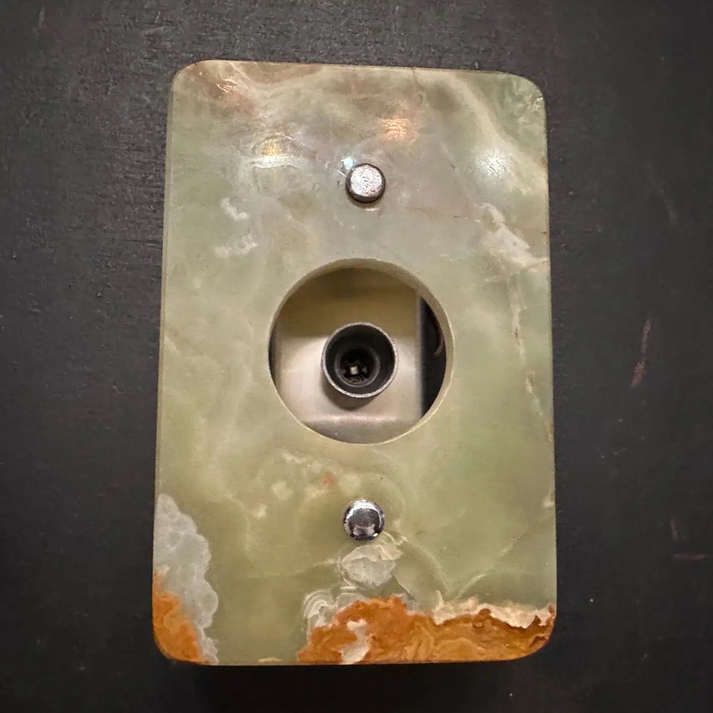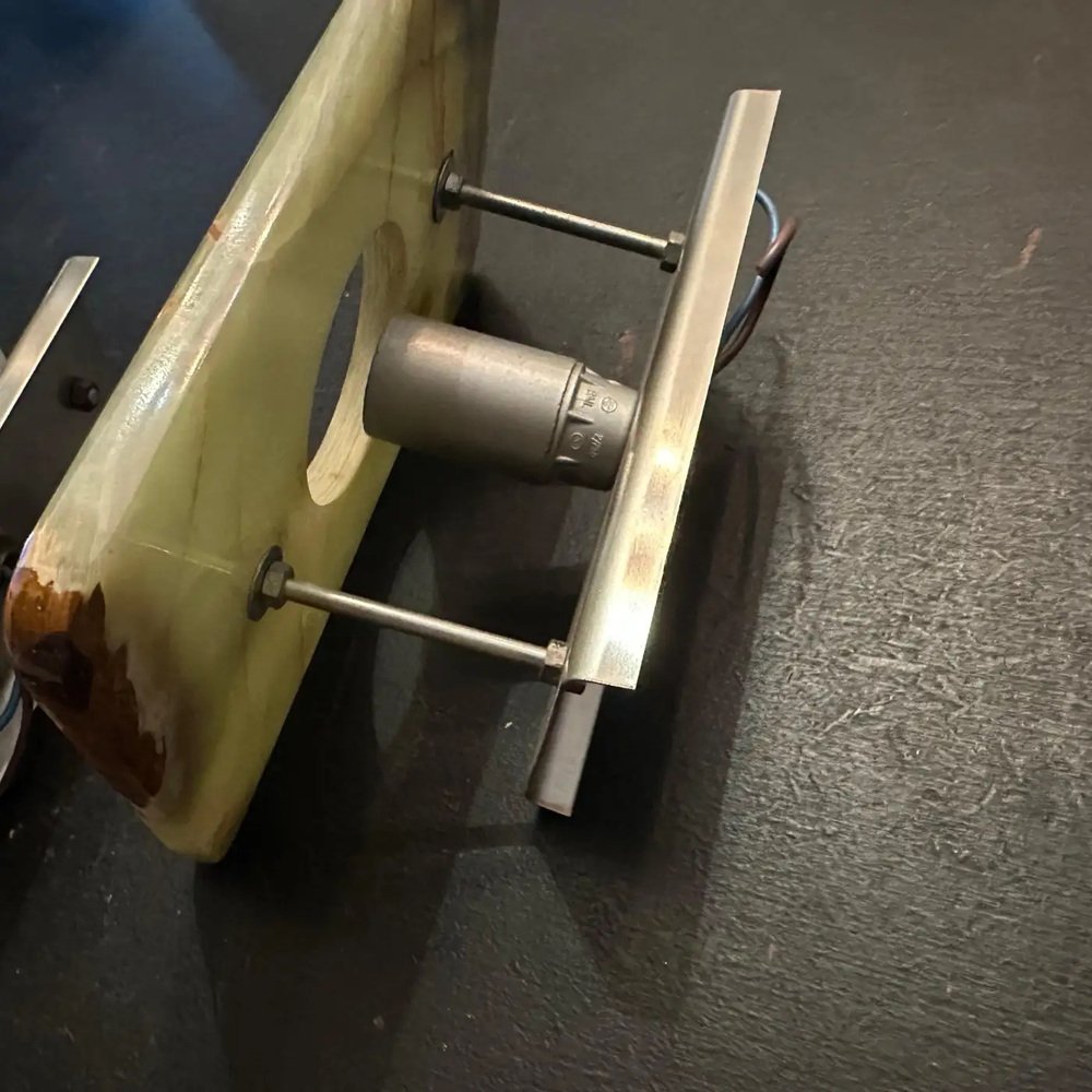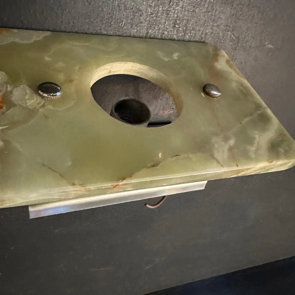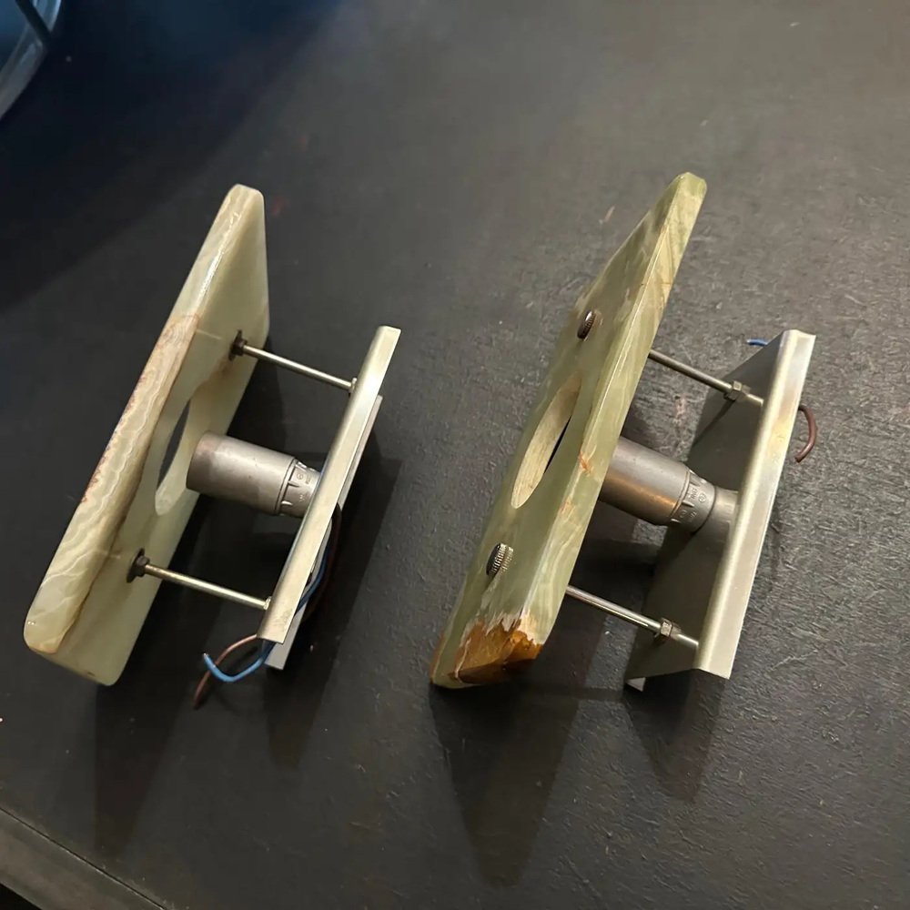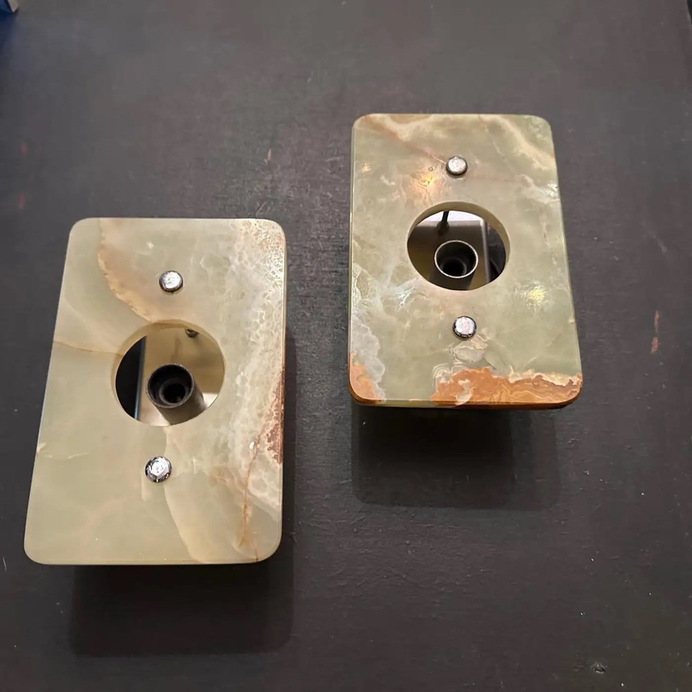 These 1970s Space Age green and brown onyx marble Italian wall sconces are elegant examples of mid-century modern design with a unique Space Age twist. Each sconce features a rectangular onyx marble panel, showcasing the natural, earthy tones and intricate veining of the stone. The panel is arranged on a metal base that creates depth and texture, adding visual interest to the sconces. The onyx marble has a rich, green color and warm brown color with varying shades and patterns, which are unique to each piece. The lighting element is discreetly housed within the marble panel, allowing the light to softly diffuse through the stone, creating a warm and ambient glow. The combination of luxurious onyx marble with the sleek metal accents makes these sconces a stylish and sophisticated addition to any interior. They are in perfect condition and in working order.