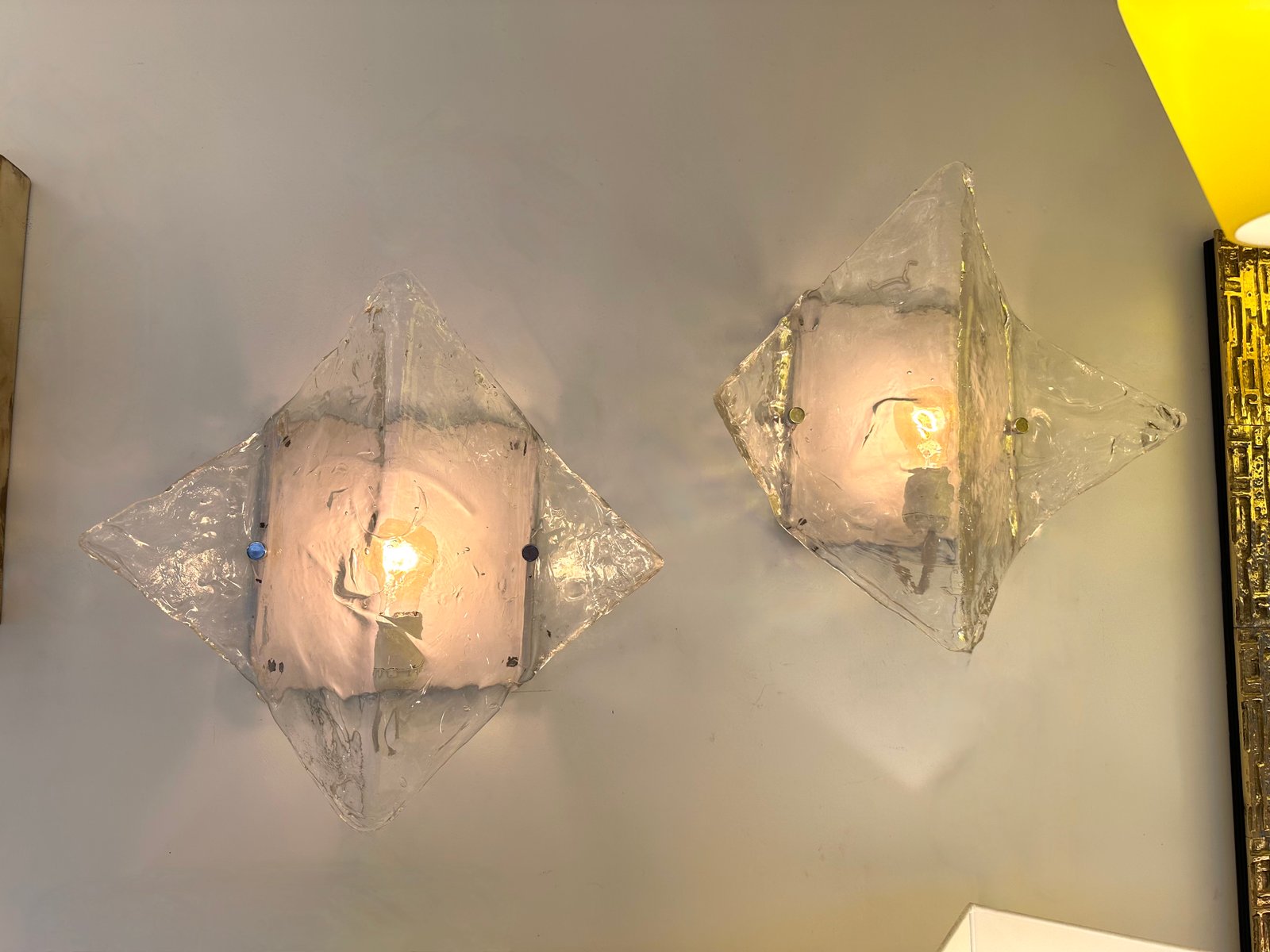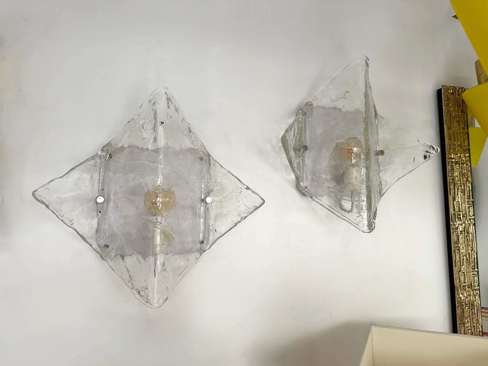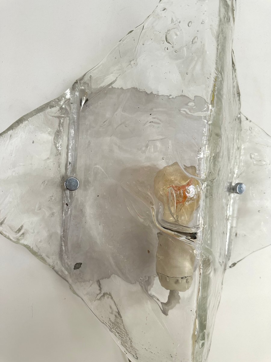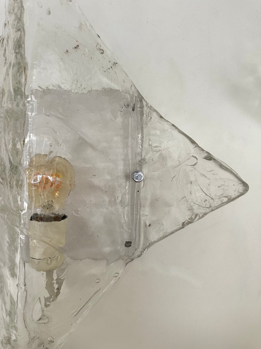 Par de apliques de pared de la Era Espacial Moderna de mediados de siglo modelo LP253 en cristal de murano texturizado transparente y metal lacado en blanco de Carlo Nason para la manufactura Mazzega. Famosos del diseño italiano como Venini, Vistosi, La Murrina, Aldo Nason, Stilnovo, Joe Colombo, Arteluce, Arredoluce, Lumi, Luci, Rggiani, Sciolari, Werner Pantone, Luigi Colani, Raak, Angelo Lelii, Angelo Brotto, Esperia, Francesco Bocola, Superstudio, Enrico Tronconi, Mario Bellini, Harvey Guzzini, Luigi Massoni, Martinelli, Pierre Cardin, Fabio Lenci, Gio Ponti.