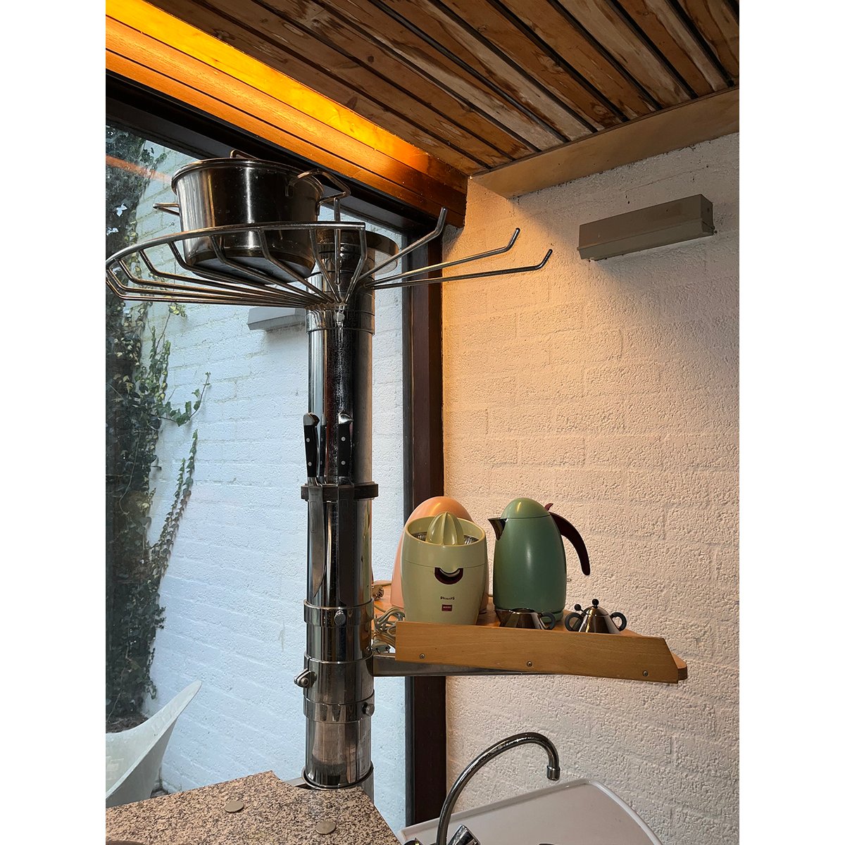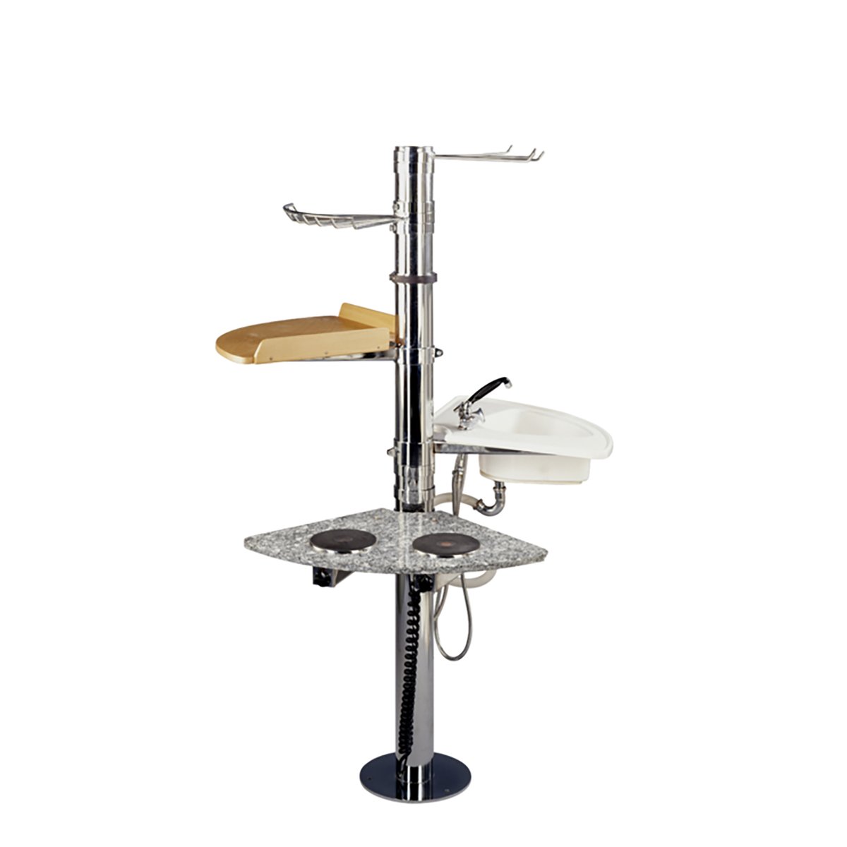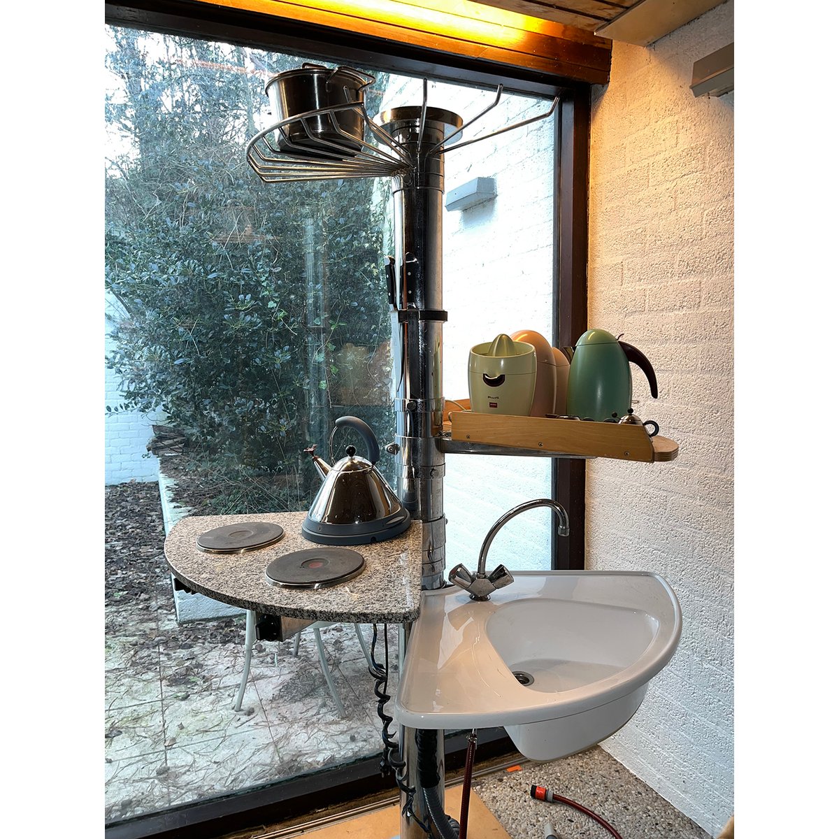 Una columna de acero cromado que aloja cables y tuberías de agua rodeada de todo lo que se necesita en una cocina: un hornillo eléctrico, un fregadero, una encimera y un escurreplatos, así como ganchos para colgar ollas o paños de cocina. Incluso hay un especiero. La disposición de los elementos funcionales puede adaptarse a las preferencias individuales.