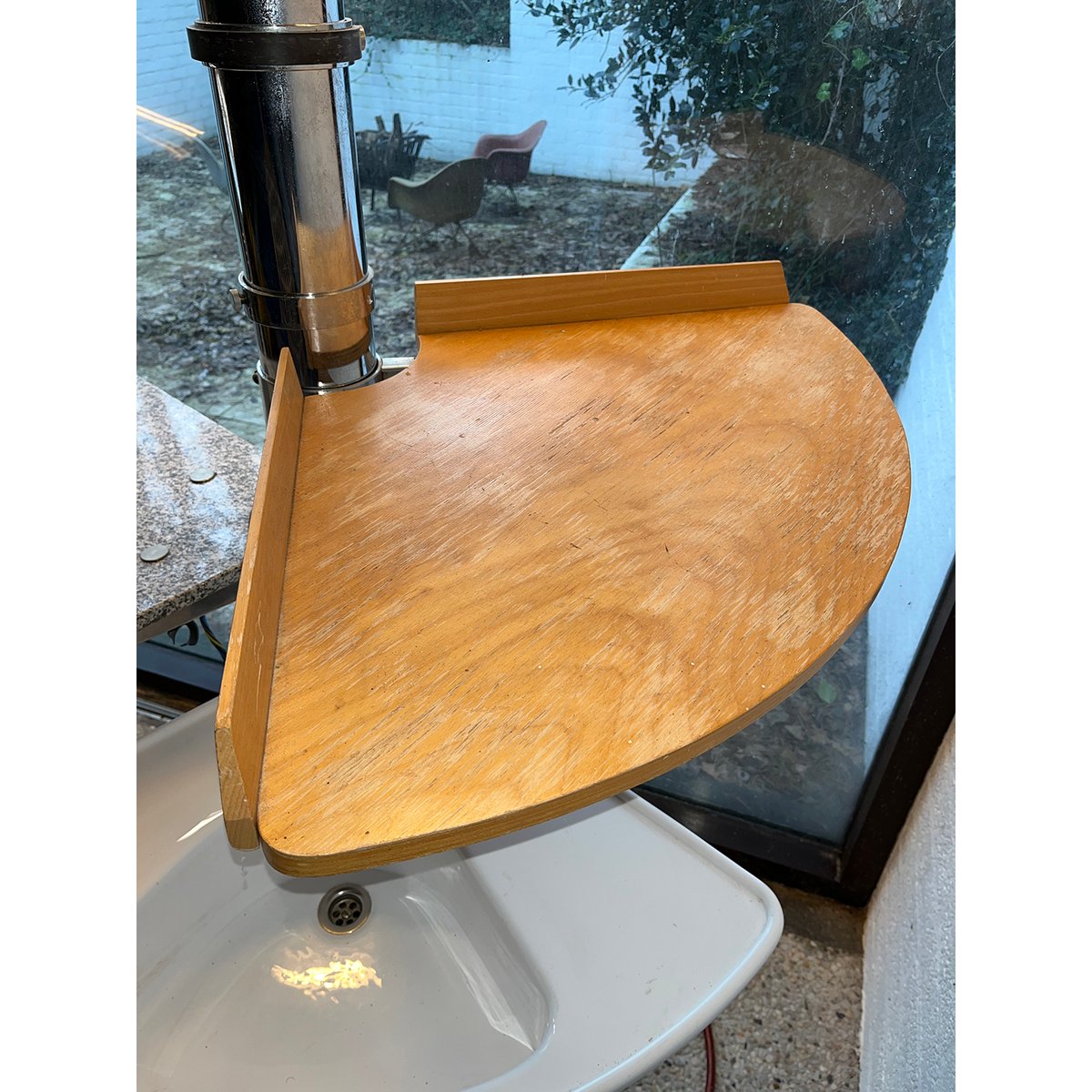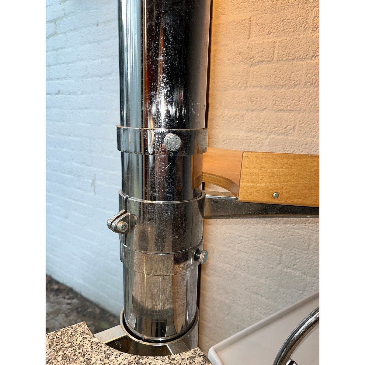 The kitchen pole shows some light traces of use, such as some light spots in the varnish of the wooden board, 2 light scratches on the sink and some light rust spots oil the round base plate as well as on the column and the racks. The coating of the electrical cable is missing on some parts.