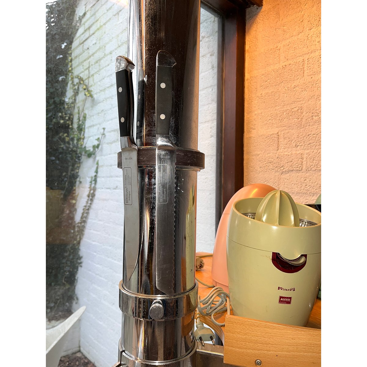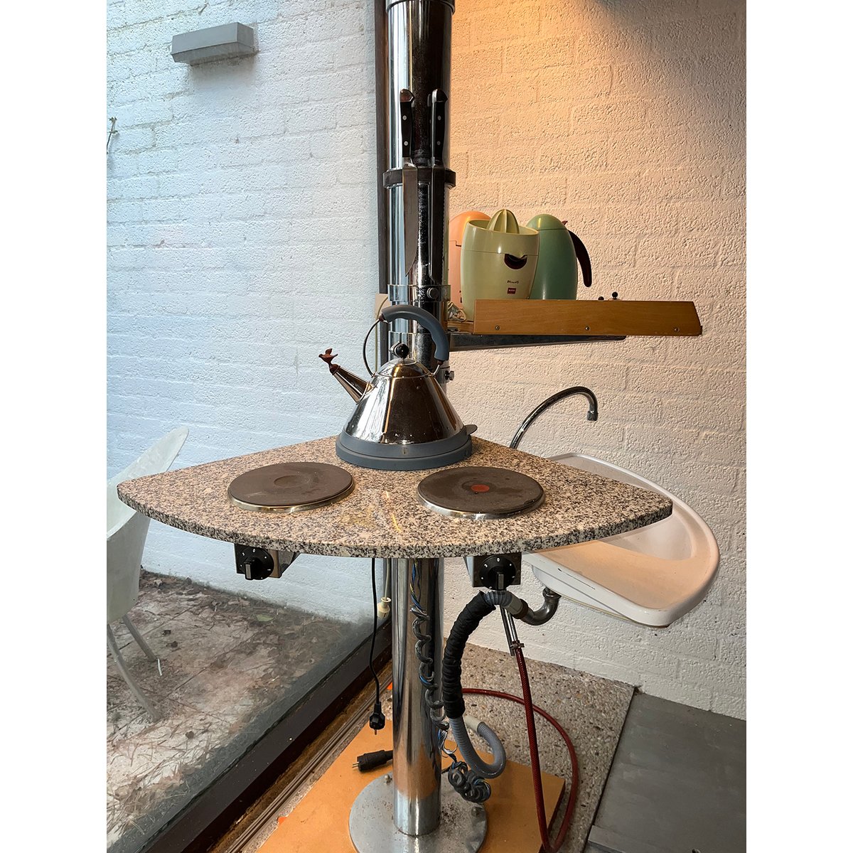A chrome-plated steel column housing cables and water pipes surrounded by everything you need in a kitchen: an electric stove, a sink, work surface, and dish rack as well as hooks for hanging pots or tea towels. There is even a spice rack. The arrangement of the functional elements can be adapted to individual preferences.