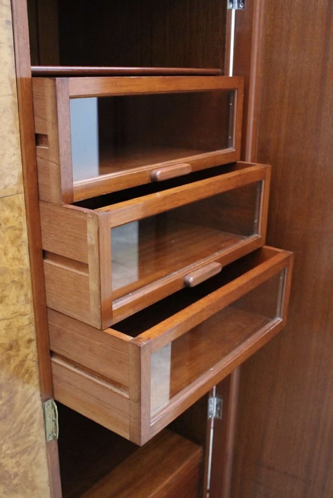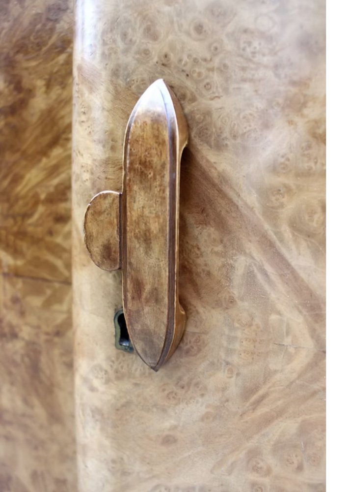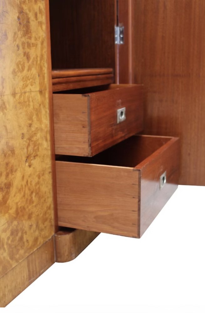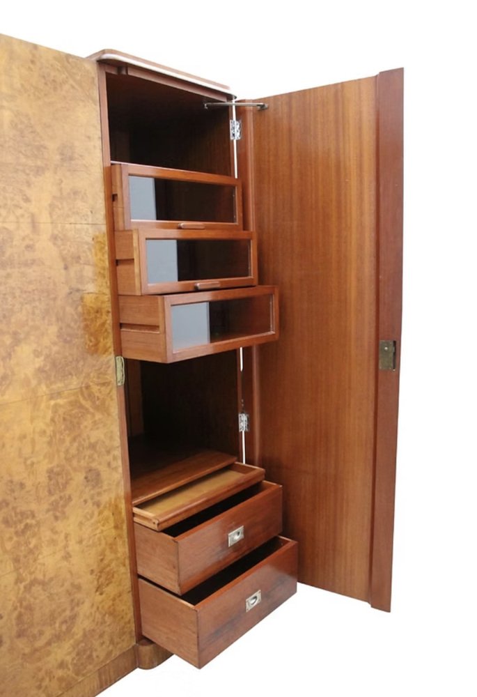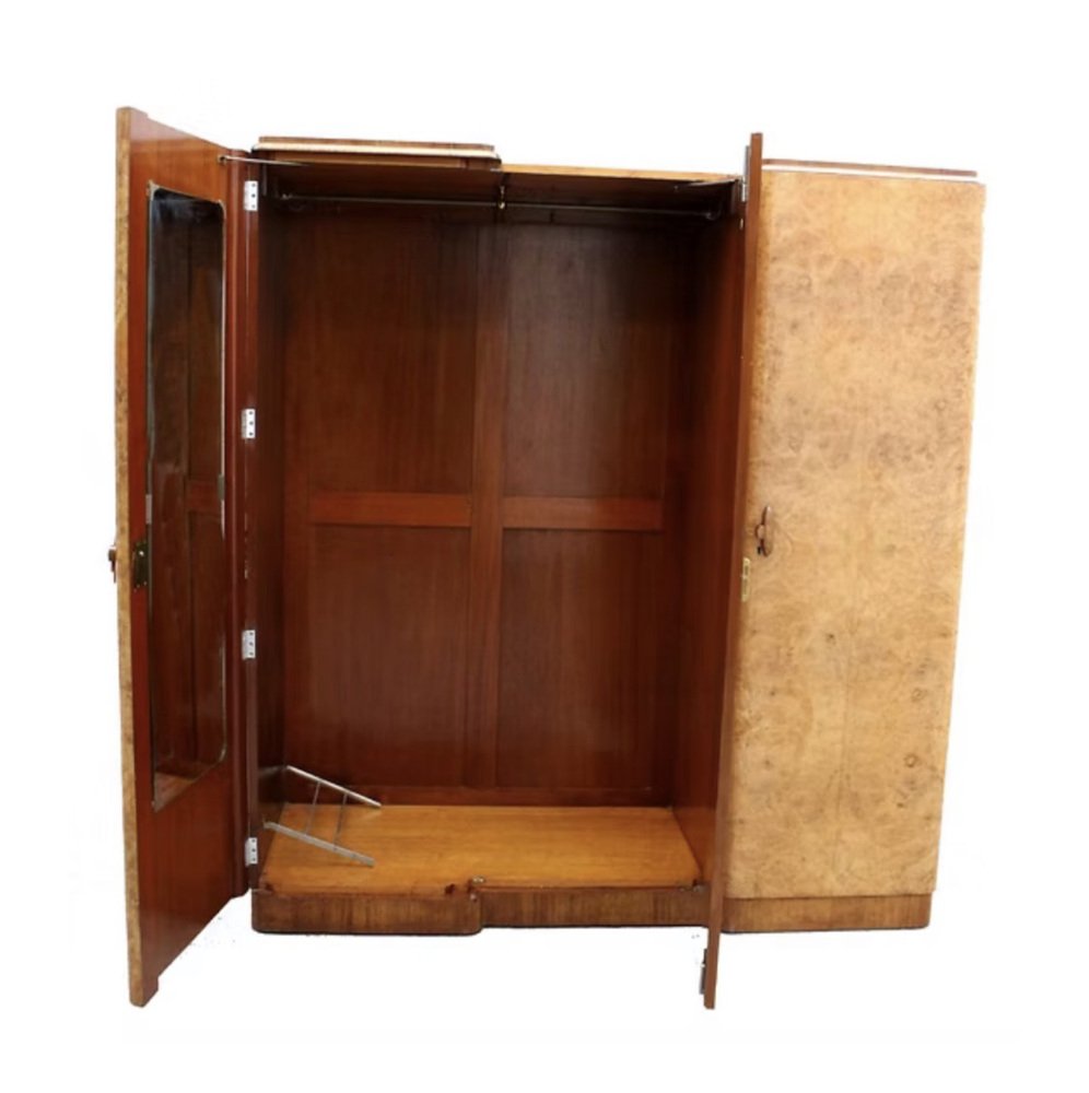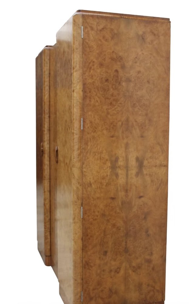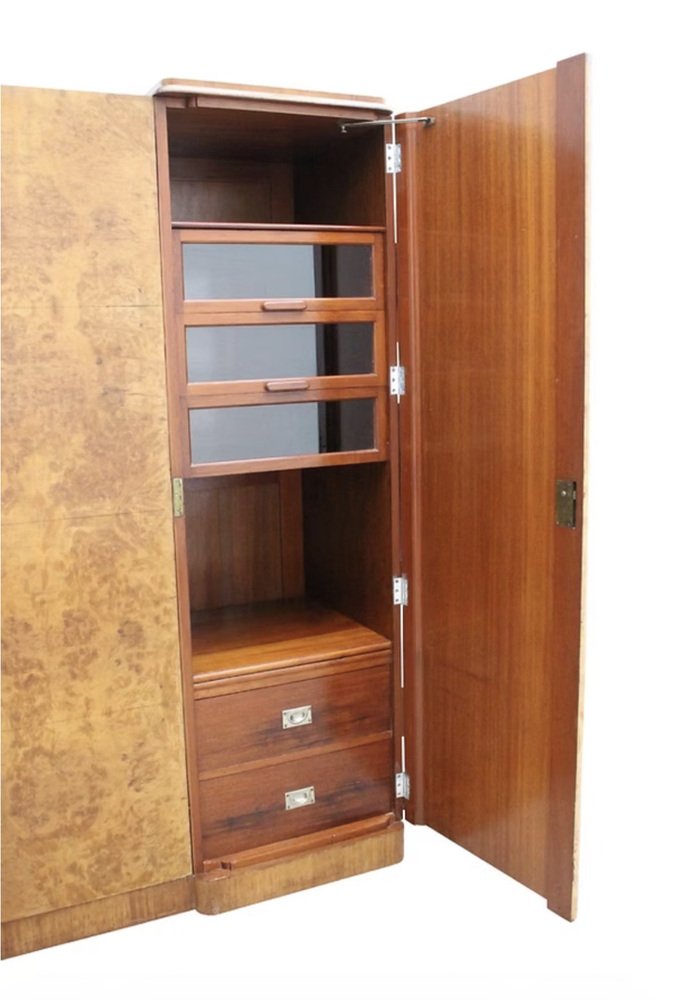 Le presentamos este impresionante armario Art Déco de tres puertas y dimensiones reducidas, absolutamente espectacular tanto por dentro como por fuera. Data de la década de 1930 y la calidad de esta pieza es de la más alta especificación, sin escatimar en gastos, y se integrará fácilmente tanto en hogares modernos como de época. Aún conserva sus herrajes cromados originales, incluyendo barras, ganchos, bisagras, tiradores militares, etc. Una de las puertas tiene un espejo de cuerpo entero en su interior y se encuentra en buen estado vintage. La puerta del extremo derecho se abre para revelar una serie de cajones acristalados, cajones profundos y estantes abiertos. También hay un inusual cajón oculto de 1 1/2 " de profundidad. El interior, de generosas dimensiones, es una auténtica delicia, y es aquí donde realmente destaca la artesanía, con paneles de caoba en la parte trasera. El interior equipado ofrece el espacio perfecto para su ropa y accesorios. El exterior es un frente invertido en una magnífica chapa de nogal rubio muy veteado. Hemos restaurado toda la pieza de forma completa y profesional para que quede como nueva.
