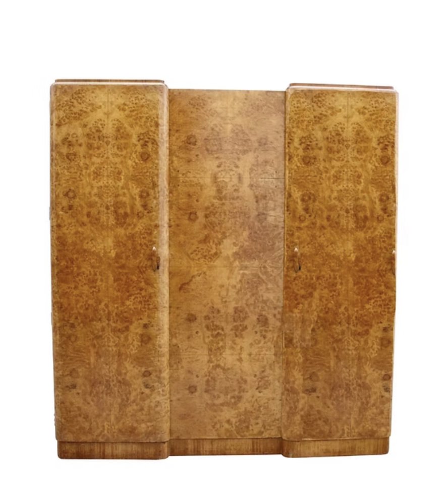 For your consideration is this very impressive looking Art Deco three door triple wardrobe of smaller dimensions and is absolutely stunning, inside and out!. Dating to the 1930's the quality throughout this piece is of the highest spec with no expense spared and will easily integrate in both modern and period home settings. Still retaining it's original chrome furniture to include, rails, hooks, hinges, military handles etc. One door has a full length mirror on it's interior and is in good vintage condition . The far right door opens to reveal of bank of glazed drawers, deep drawers and and open shelving. There is also an unusual hidden shallow drawer 1 1/2 " deep. The generously sized interior is an absolute delight , this is really where the craftsmanship shines, with mahogany panelling to the back. The fitted interior offers the perfect space for your clothes and accessories. The exterior is an inverted breakfront in a glorious blonde walnut heavily figured veneer. We've had this whole piece fully and professionally restored to showroom standard.