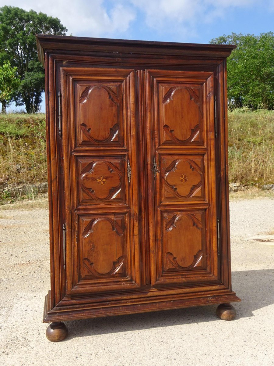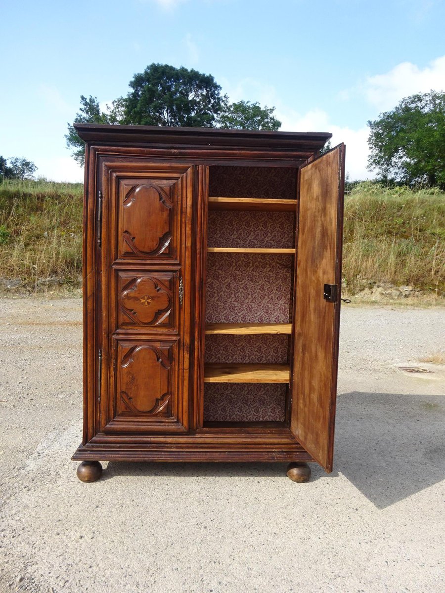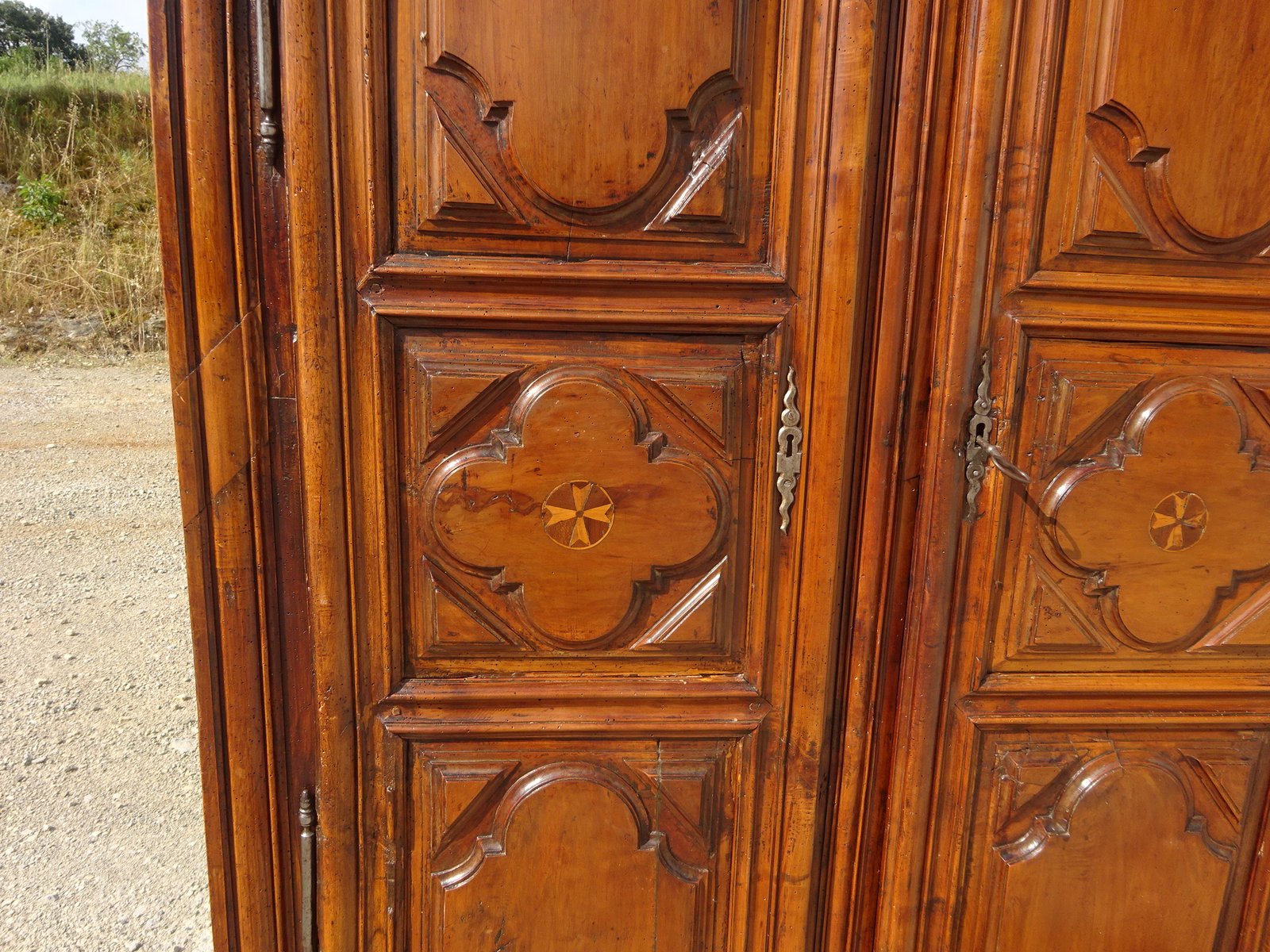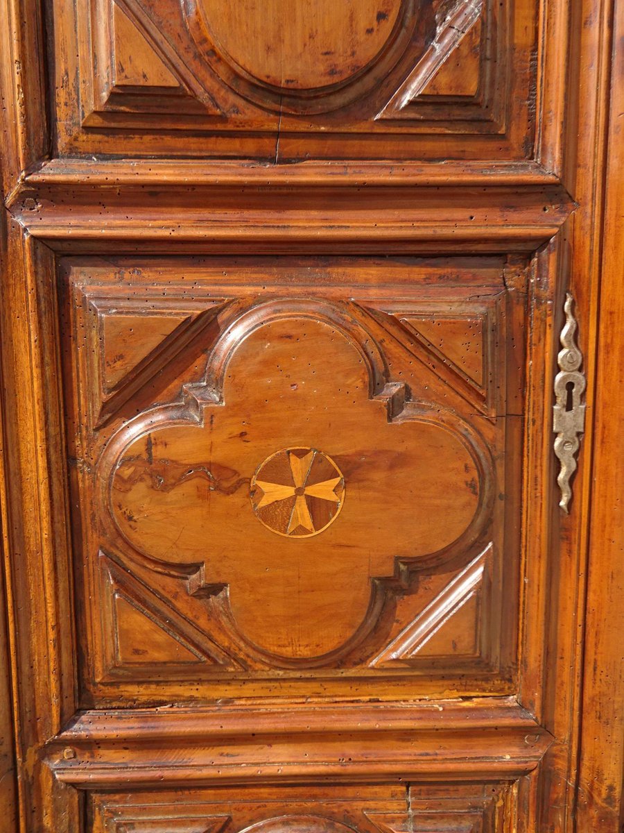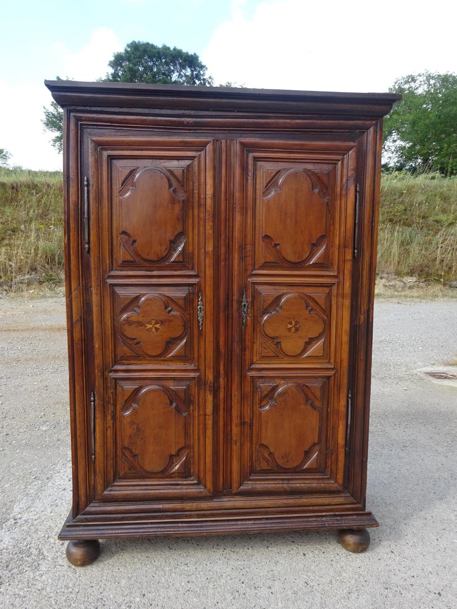Precioso armario de estilo Luis XIII, fabricado íntegramente en nogal macizo. Dos puertas grandes de alta calidad con una notable artesanía; motivos de cuatro hojas tallados en una sola pieza de madera y un motivo central de cruz en marquetería. Bisagras originales de hierro forjado. Escudos decorativos para las cerraduras. Cerradura funcional con una llave.