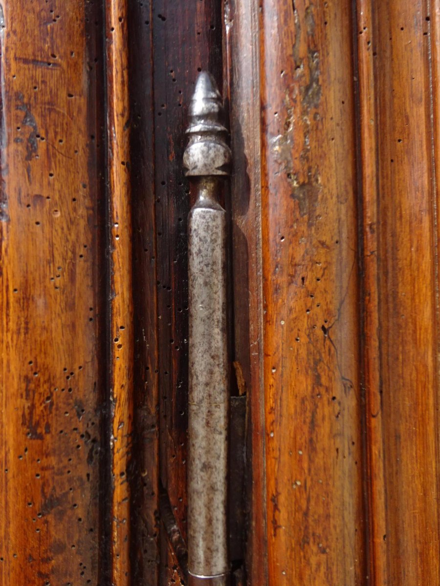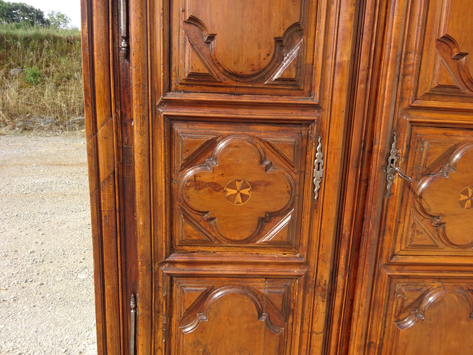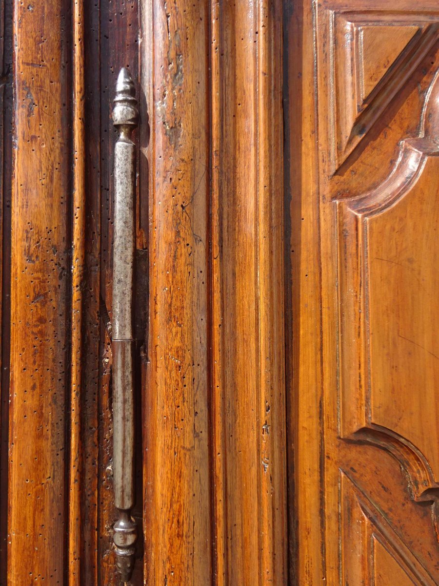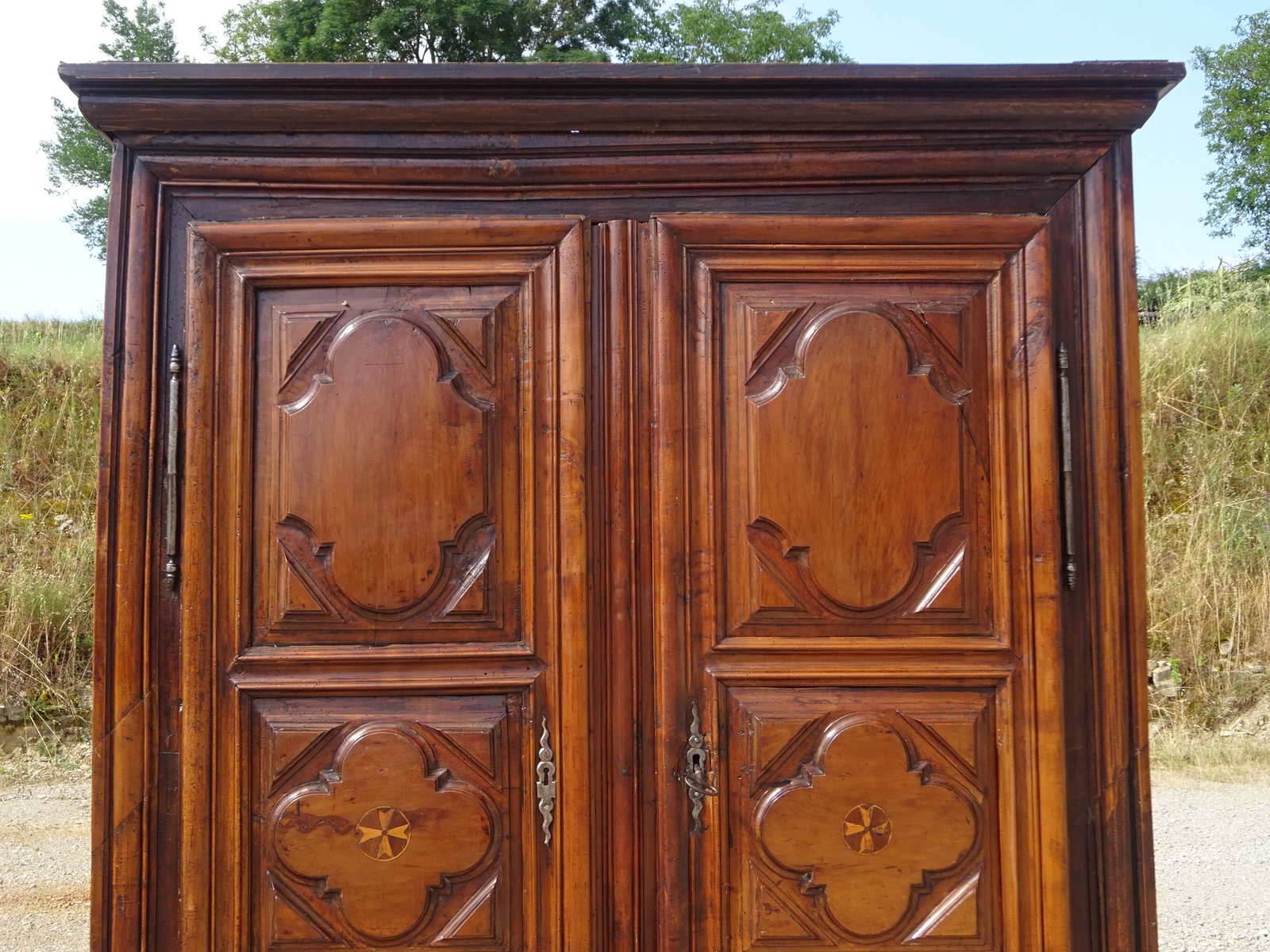 Precioso armario de estilo Luis XIII, fabricado íntegramente en nogal macizo. Dos puertas grandes de alta calidad con una notable artesanía; motivos de cuatro hojas tallados en una sola pieza de madera y un motivo central de cruz en marquetería. Bisagras originales de hierro forjado. Escudos decorativos para las cerraduras. Cerradura funcional con una llave.