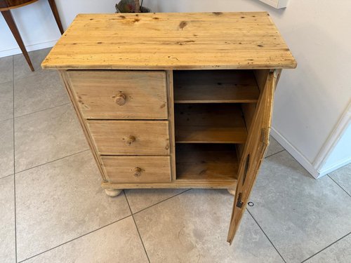 Biedermeier Bread Cabinet/Pantry/Storage Chest Dimensions: Height x Width x Depth 90 x 84 x 43 cm. For sale is an original Biedermeier-era pantry cabinet, crafted from solid spruce – a genuine piece of interior design dating from around 1840–1850. This so-called "Alma" or pantry cabinet is in excellent condition, captivating with its clean lines, elegant proportions, and harmonious overall appearance. with three drawers, a keyed door, and a fragrant interior, this piece of furniture is perfect for the kitchen, pantry, or as charming storage in a modern living space. Everything has been meticulously restored – an original in fantastic condition! A timeless classic, both functional and decorative – ready for a new lease on life.