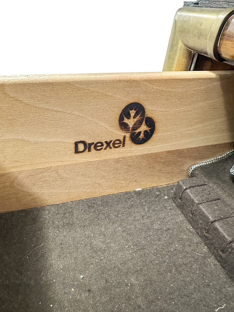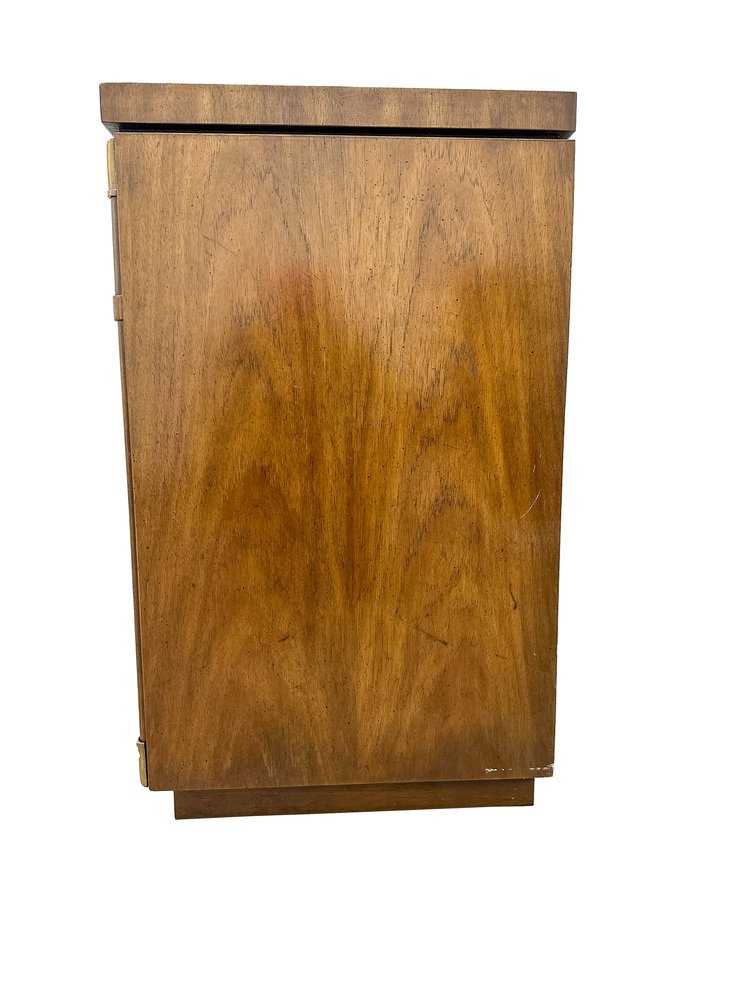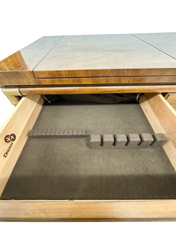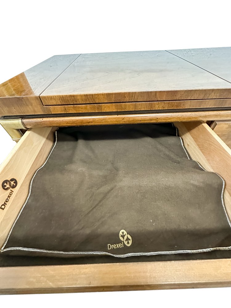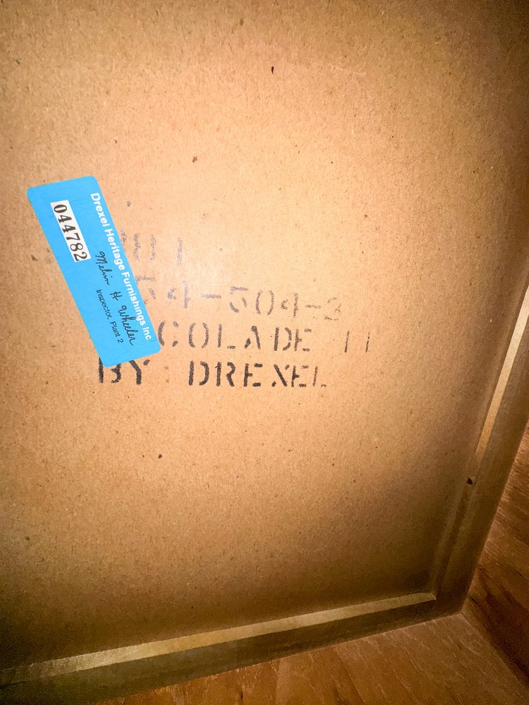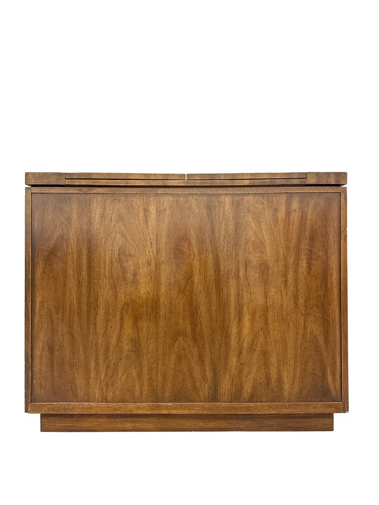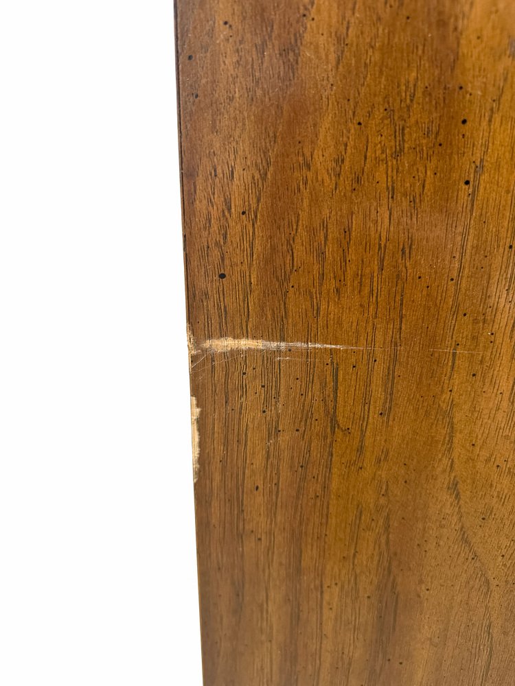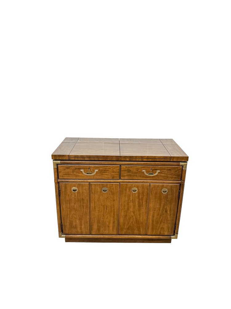 Este aparador vintage de Drexel Heritage es un ejemplo bellamente elaborado del diseño moderno de mediados de siglo con fuertes influencias del estilo Campaign. Fabricado en nogal macizo, la pieza presenta un acabado cálido y ricamente veteado que le da profundidad y carácter, al tiempo que mantiene una forma limpia y atemporal.