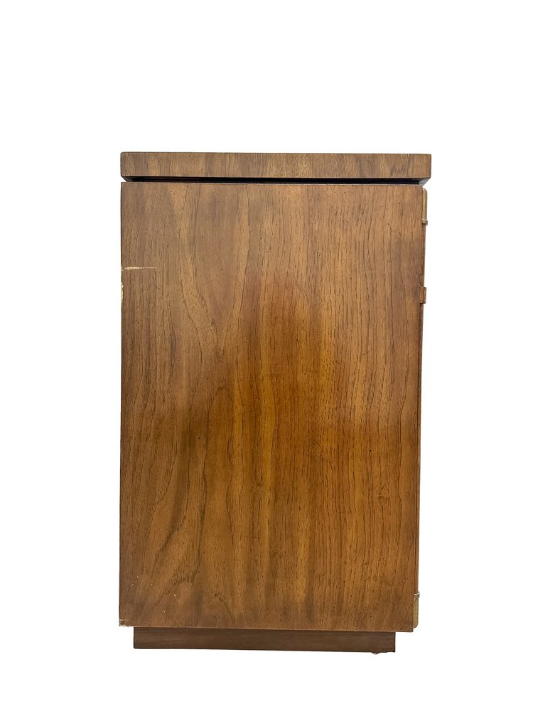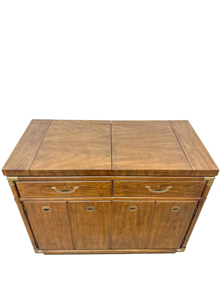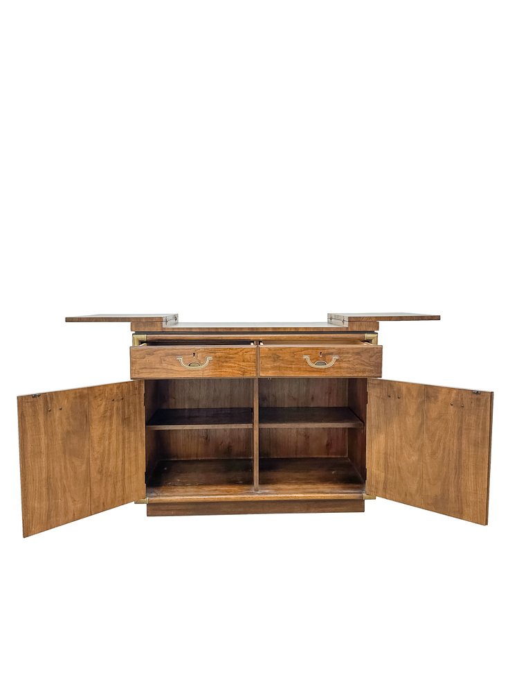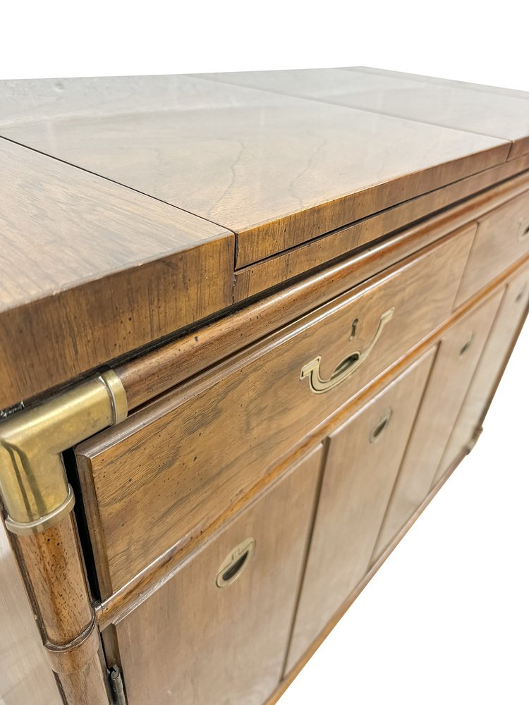 This vintage Drexel Heritage sideboard is a beautifully crafted example of Mid-Century Modern design with strong Campaign-style influences. Made from solid walnut, the piece showcases a warm, richly grained finish that gives it depth and character while remaining clean and timeless in form.