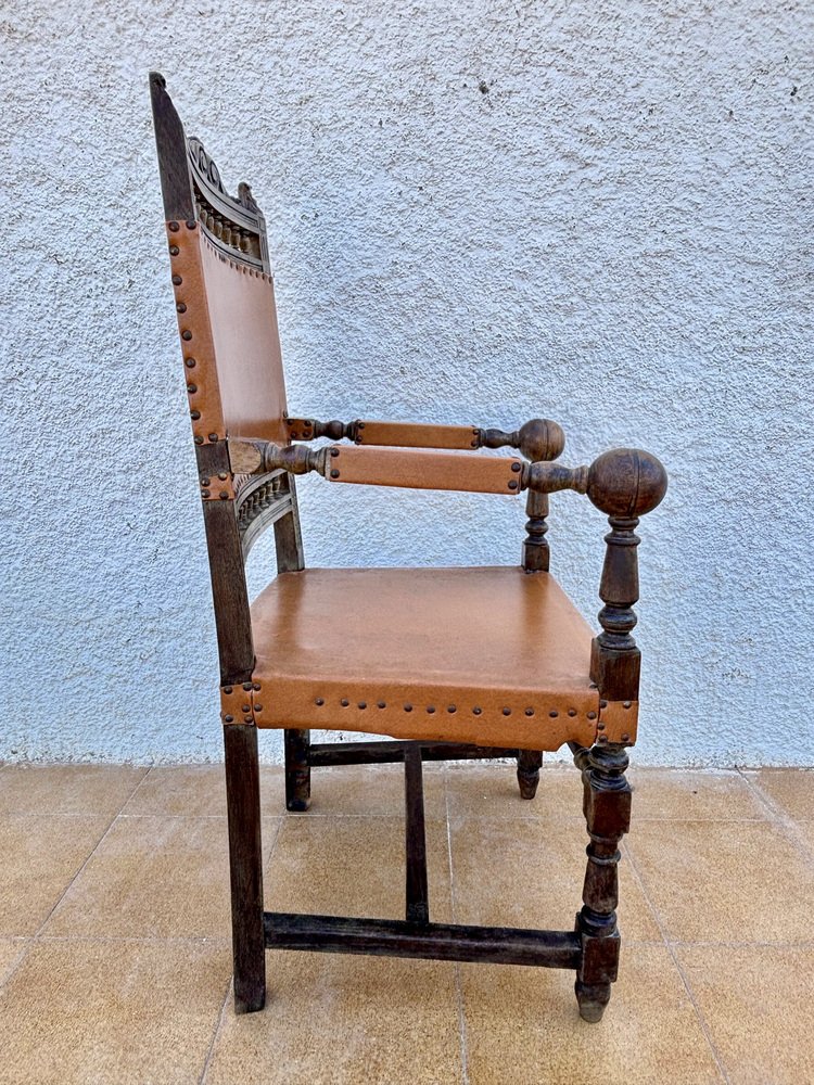 This exquisite armchair, in renacentist style, is a true testimony of timeless design and masterful craftsmanship. Built in solid walnut, the chair features elegant spirally turned details that adorn the arms and frame, adding a dynamic and decorative element to its robust structure. The seat and backrest are upholstered in rich embossed leather.