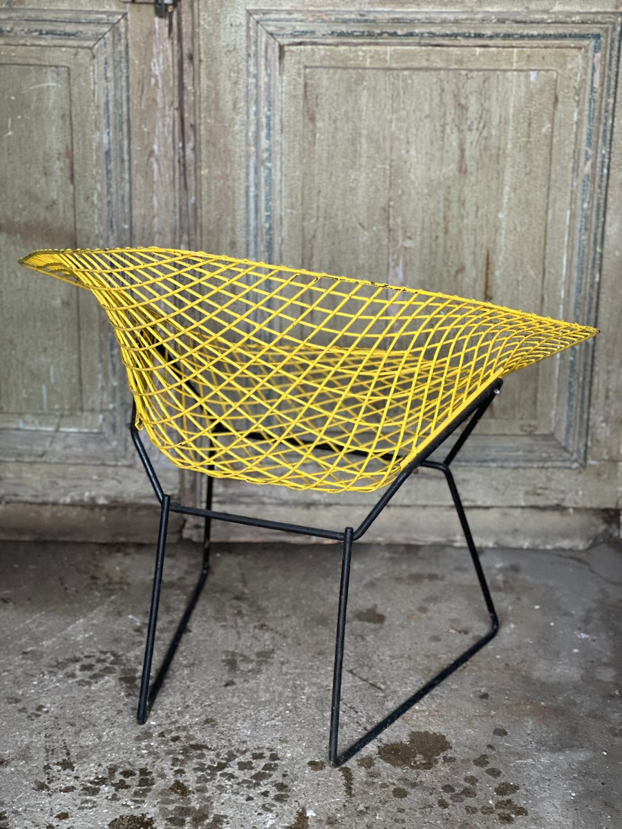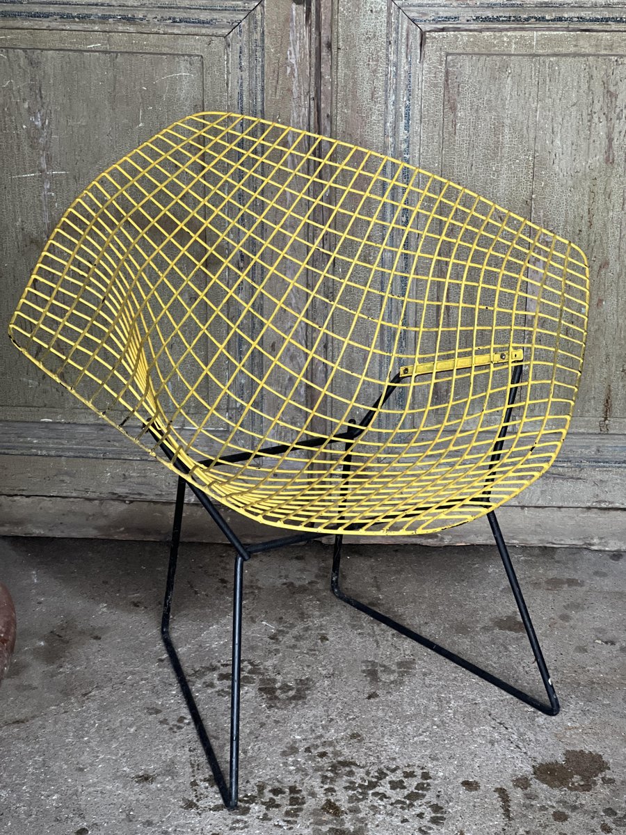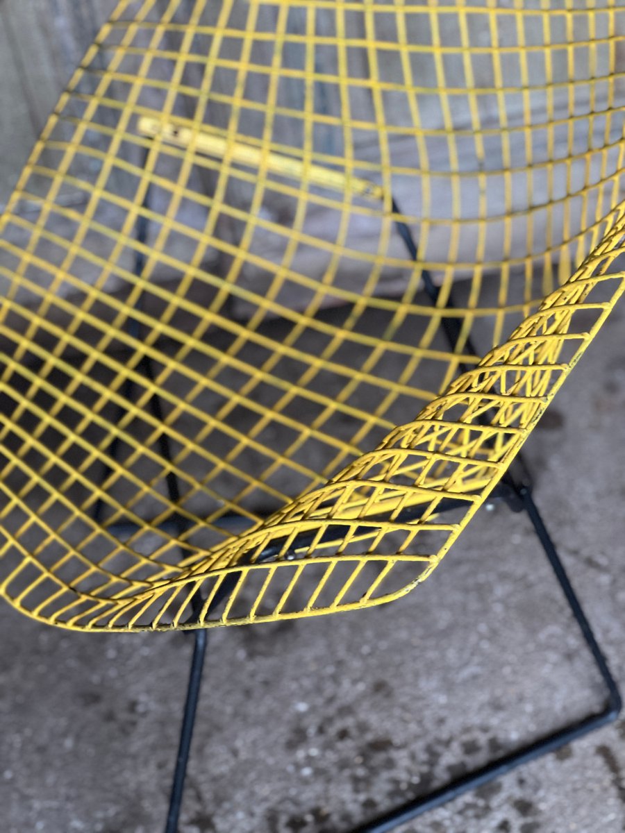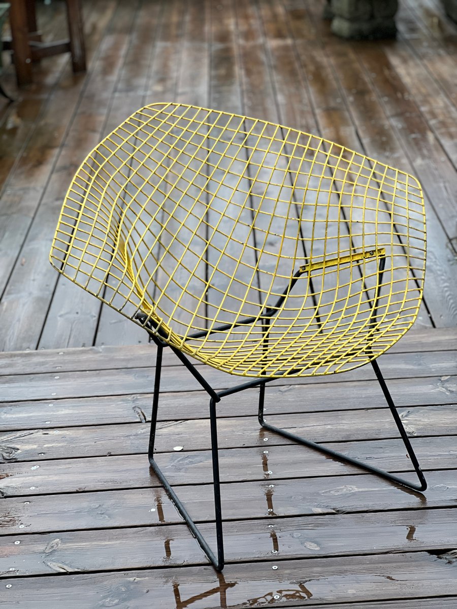 In 1943, Bertoia moved to California to work with Charles and Ray Eames for the Evans Product Company. While there, he also took welding classes at Santa Monica City College, and began to create his first welded sculptures. In 1950, at the invitation of Florence Knoll, he re-settled in Bally, Pennsylvania, where he opened his own furniture and sculpture studio. His furniture designs from this period incorporated welded and molded wire, and included several pieces for the furniture manufacturer Knoll International. The most famous, the Diamond chair (1952-53), featured an organically shaped diamond-like shell seat made of chromium-plated steel wire; it was designed to be viewed from all sides, like a sculpture. Knoll marketed multiple versions of this chair, and the royalties Bertoia received as a result allowed him to devote himself primarily to his sculpture.