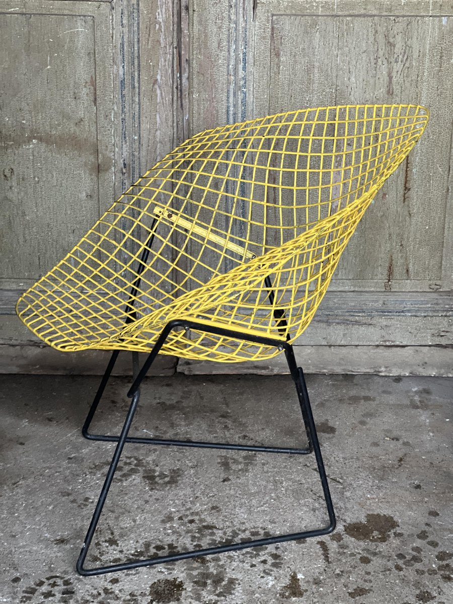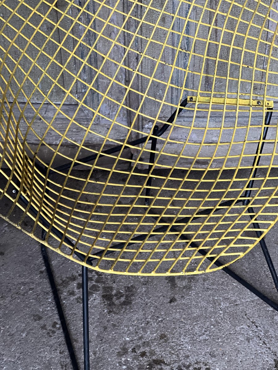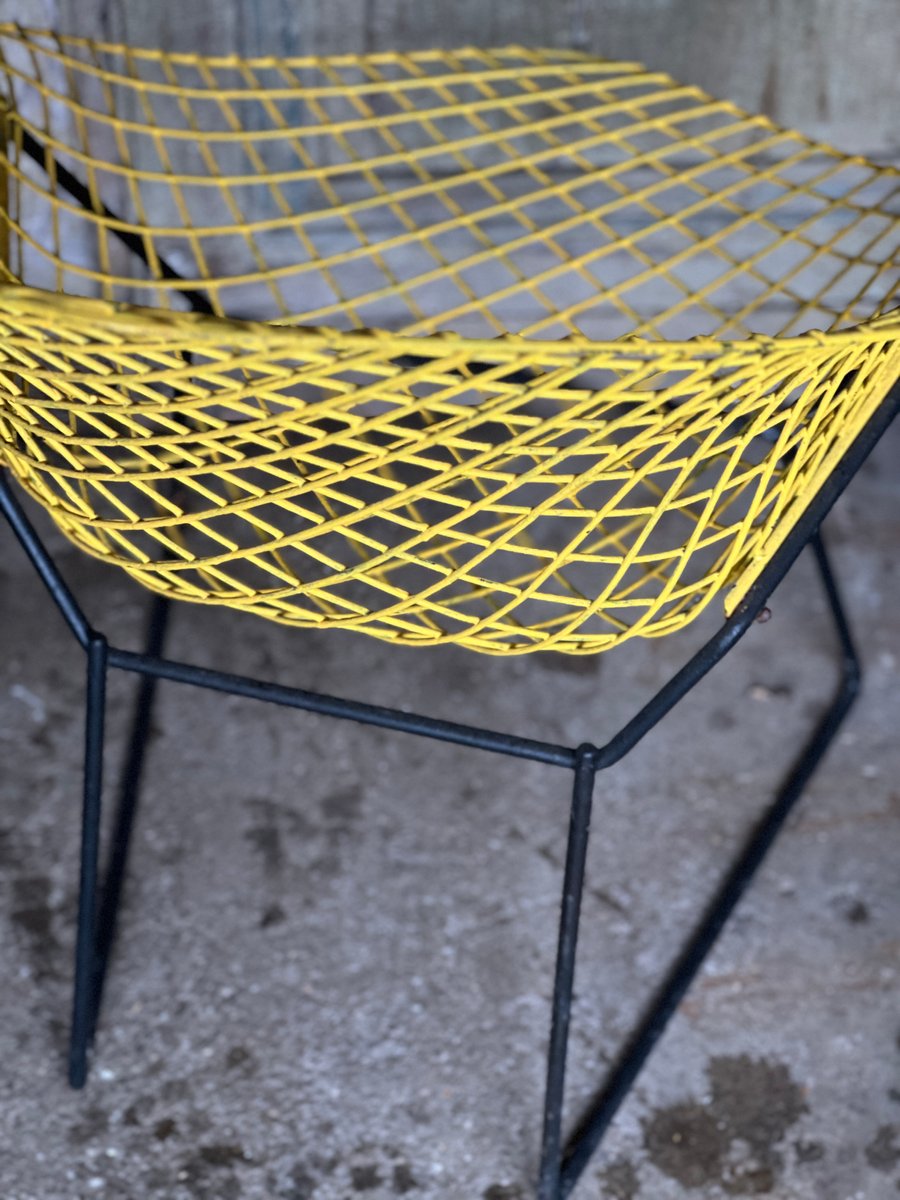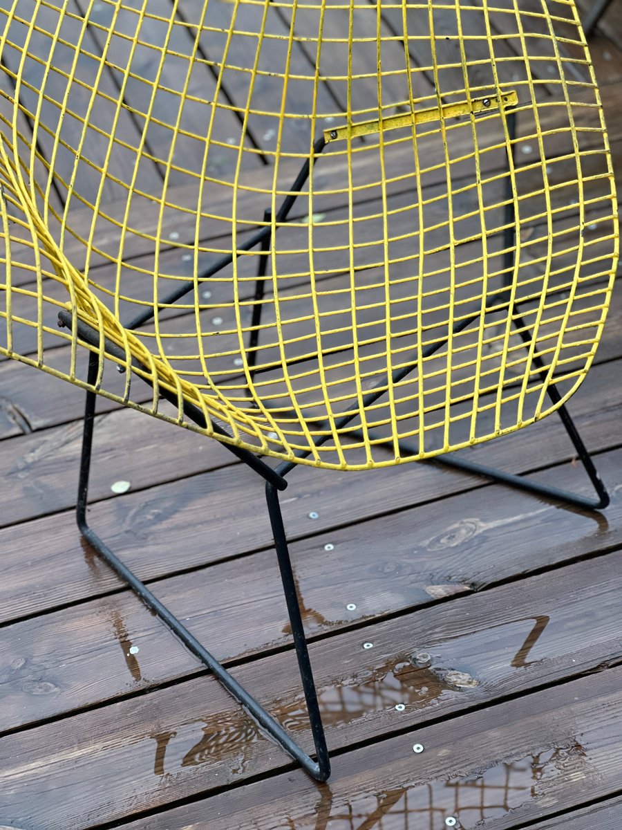 In 1943, Bertoia moved to California to work with Charles and Ray Eames for the Evans Product Company. While there, he also took welding classes at Santa Monica City College, and began to create his first welded sculptures. In 1950, at the invitation of Florence Knoll, he re-settled in Bally, Pennsylvania, where he opened his own furniture and sculpture studio. His furniture designs from this period incorporated welded and molded wire, and included several pieces for the furniture manufacturer Knoll International. The most famous, the Diamond chair (1952-53), featured an organically shaped diamond-like shell seat made of chromium-plated steel wire; it was designed to be viewed from all sides, like a sculpture. Knoll marketed multiple versions of this chair, and the royalties Bertoia received as a result allowed him to devote himself primarily to his sculpture.