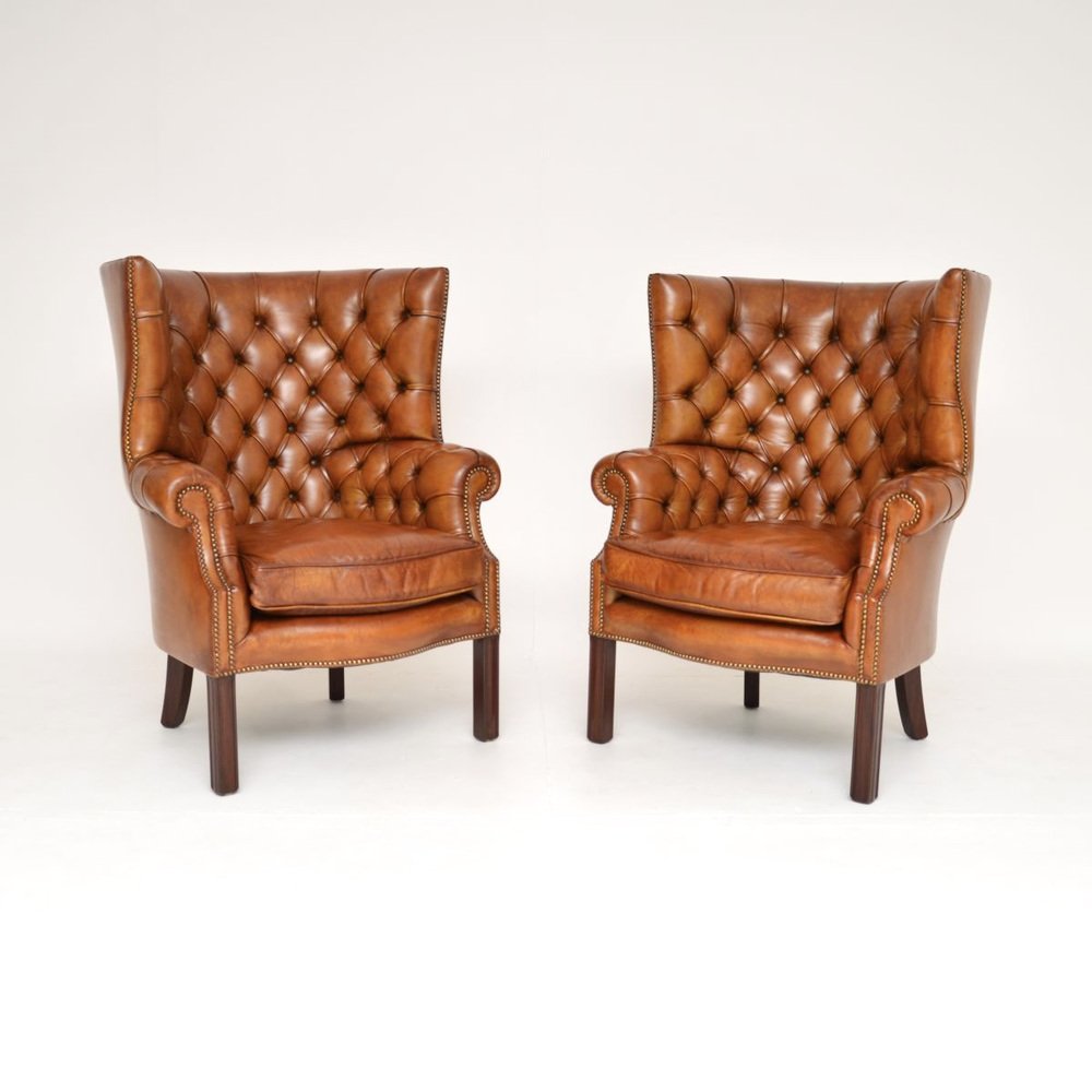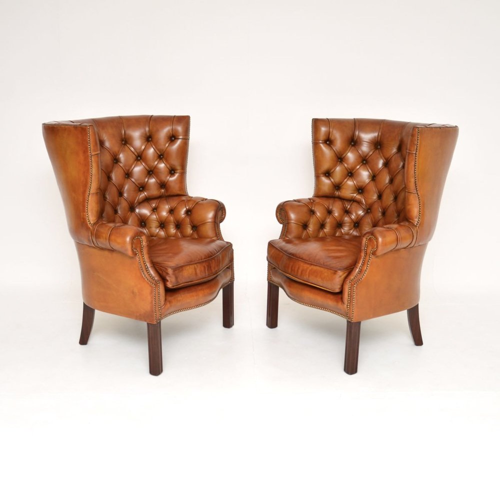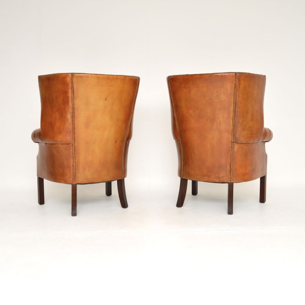 An outstanding pair of antique leather barrel back wing armchairs. They were made in England and date from the early twentieth century, likely around the 1920-30’s.