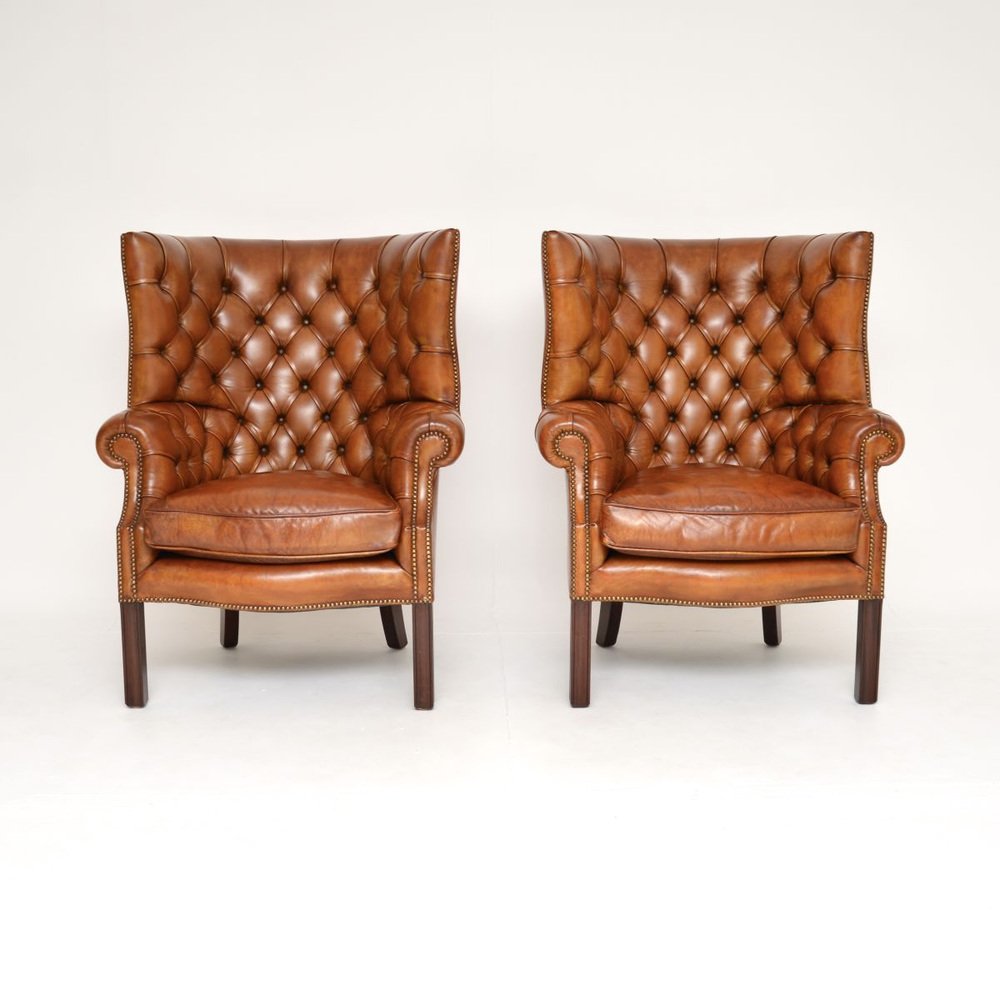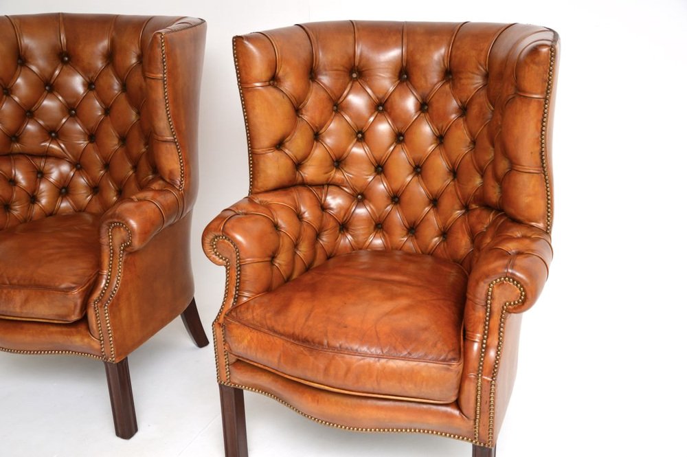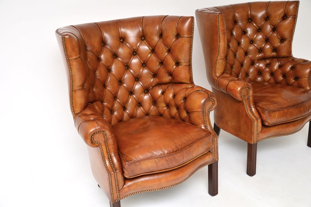 They are of superb quality, they are generous in proportions and are extremely comfortable. The design is beautiful, with wonderful curved barrel shaped backs, the deep buttoned leather frames stand on tapered legs, the plump seat cushions are feather filled.
