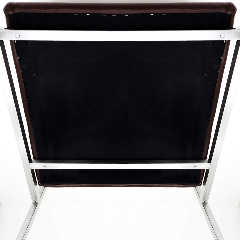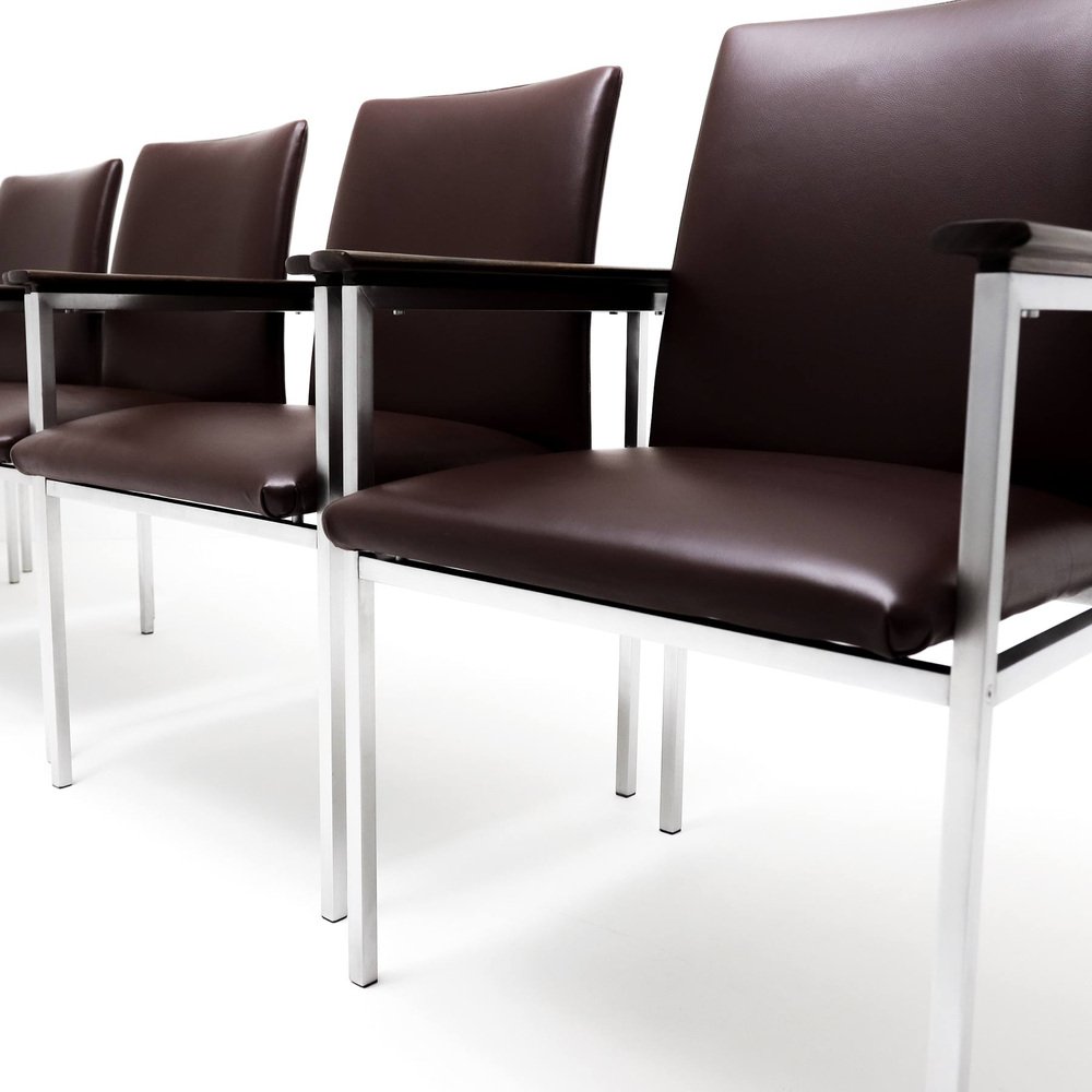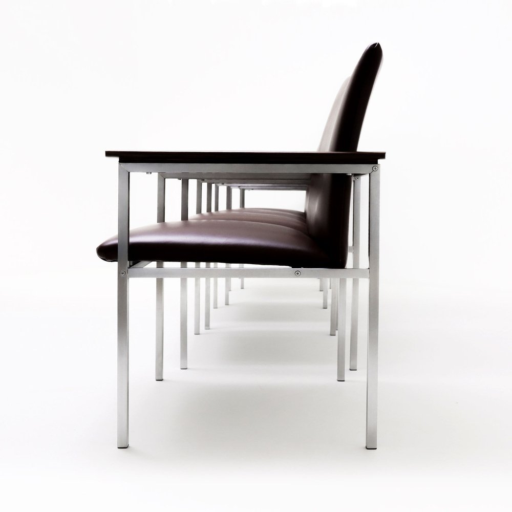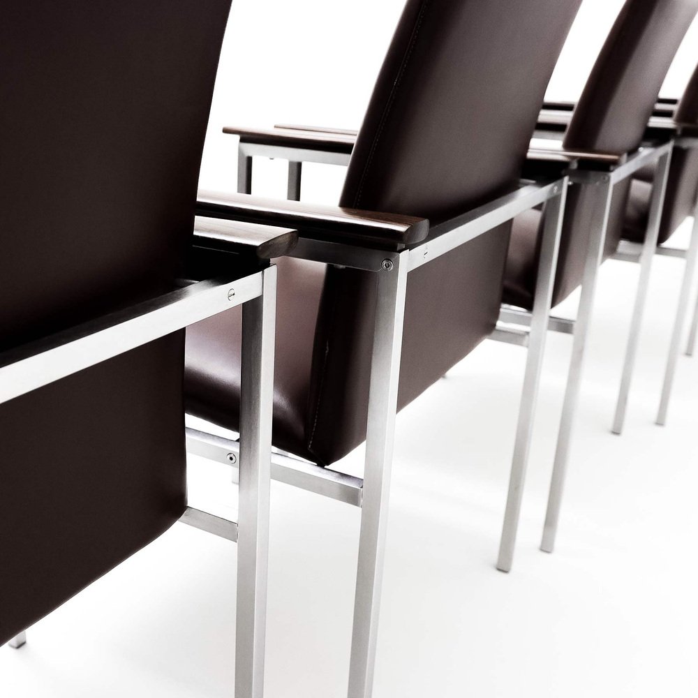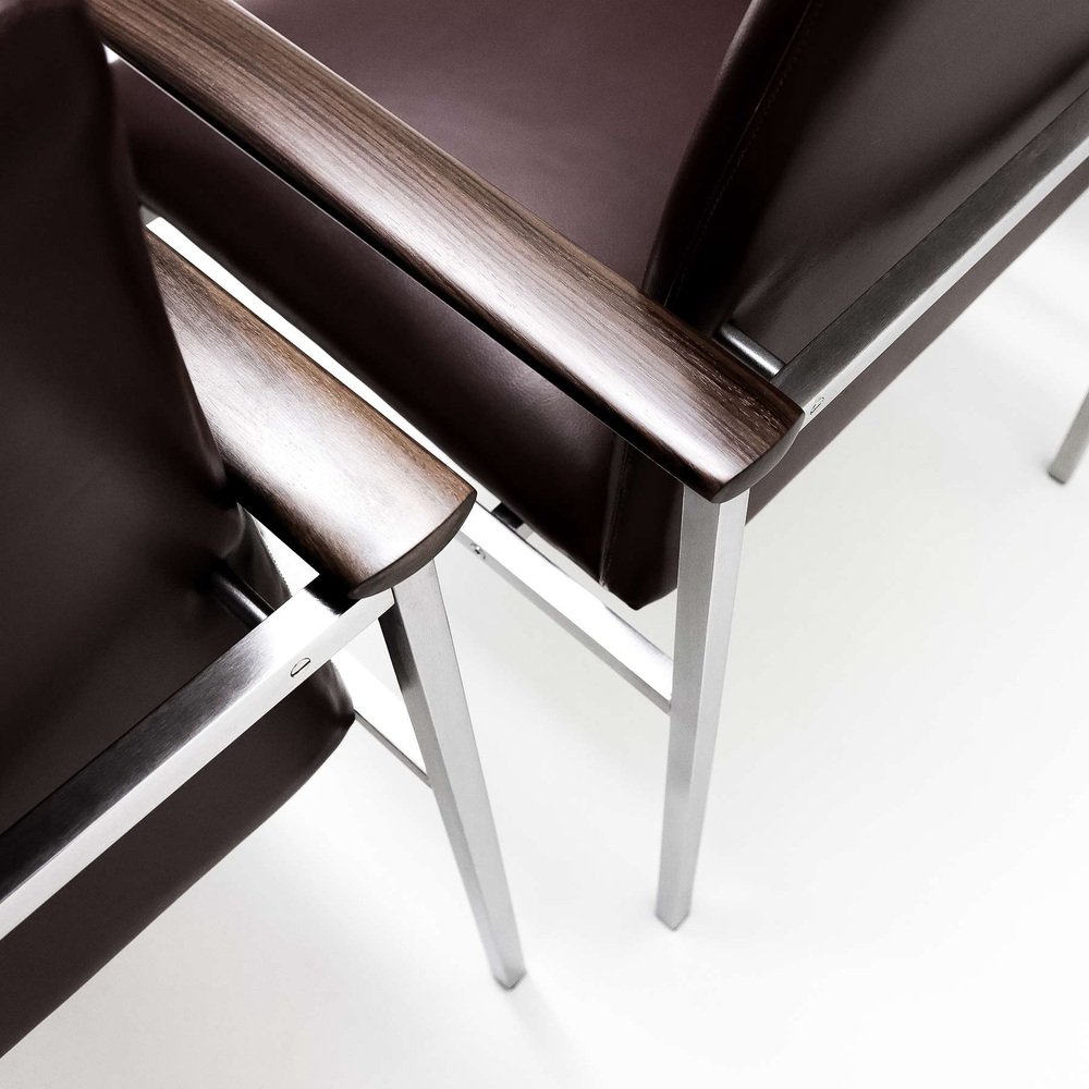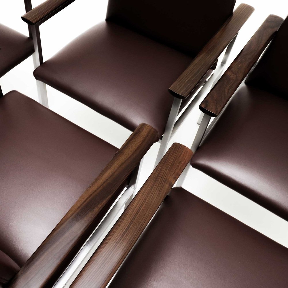 The quality, as always associated with both France & Son and Cado, shines through on these chairs. from the almost seamless welding of the joints on the square tubing to how all the bolts and screws are recessed to be flush with the frame; everything exhibits an impressive attention to detail. It’s therefore reassuring to note that the renovation of the chairs follows the same ideal. It looks like the frames have been meticulously cleaned, stripped, brushed and polished and the chairs beautifully reupholstered in high quality dark burgundy leather. These details combined with the contoured, waxed and polished solid Walnut arms creates a truly sophisticated and elegant set of chairs that would work well as dining chairs or even as a set of impressive board room chairs.