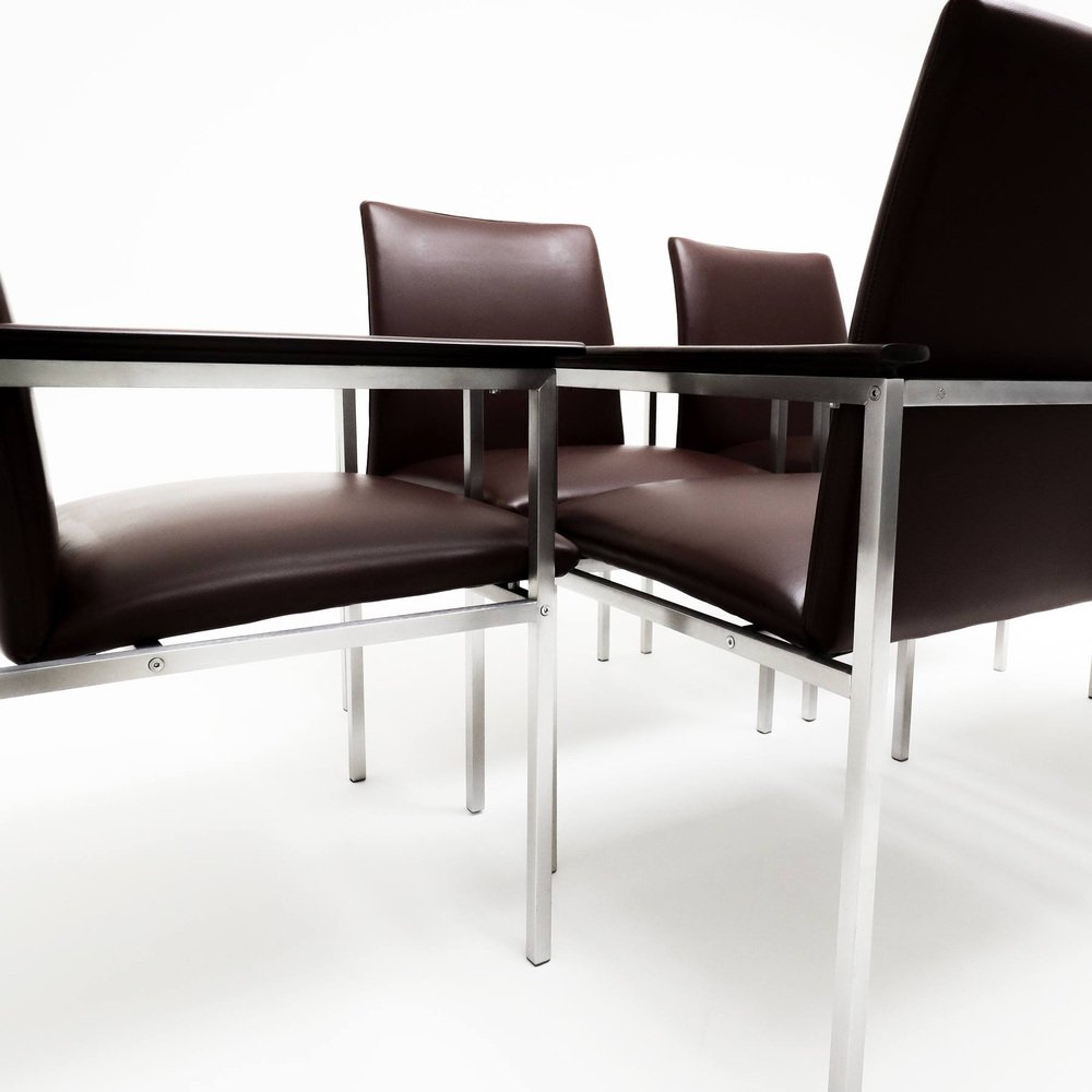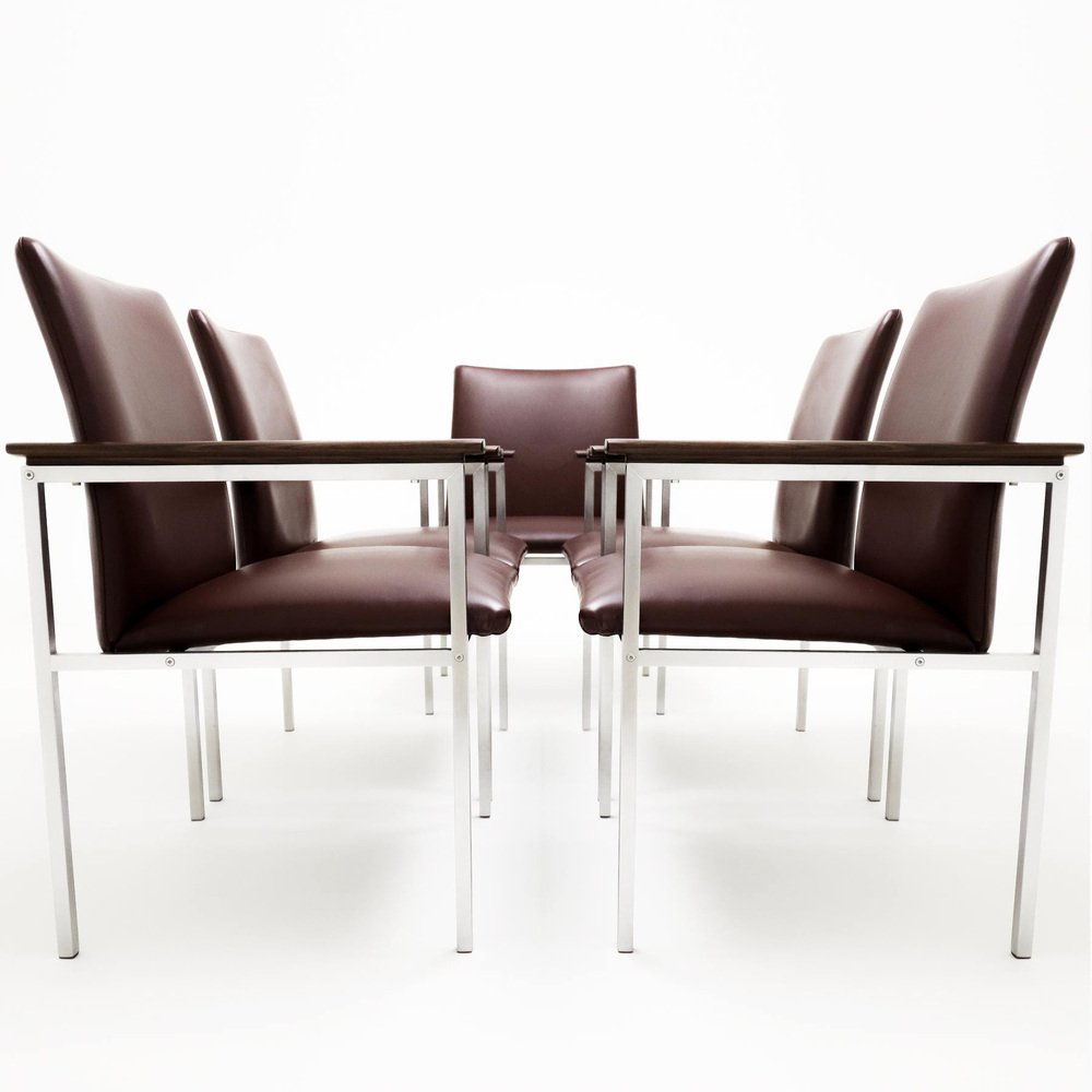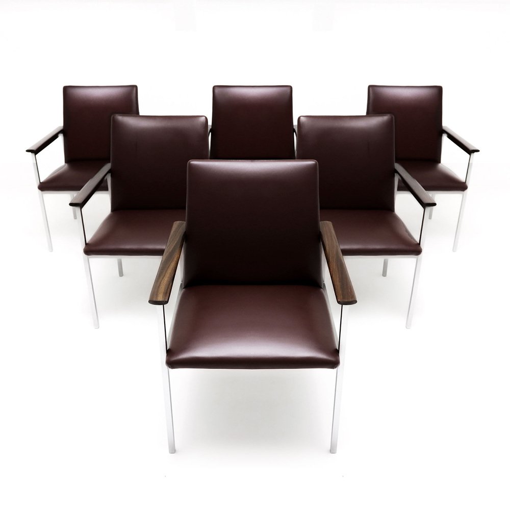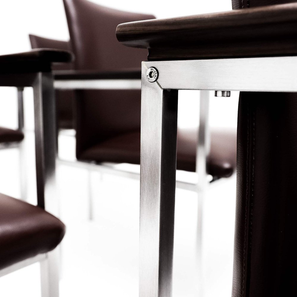 A rare complete set of 6 Sigvard Bernadotte H-line Danish armchairs in dark burgundy leather with brushed steel frames and solid Walnut arms for France & Son.