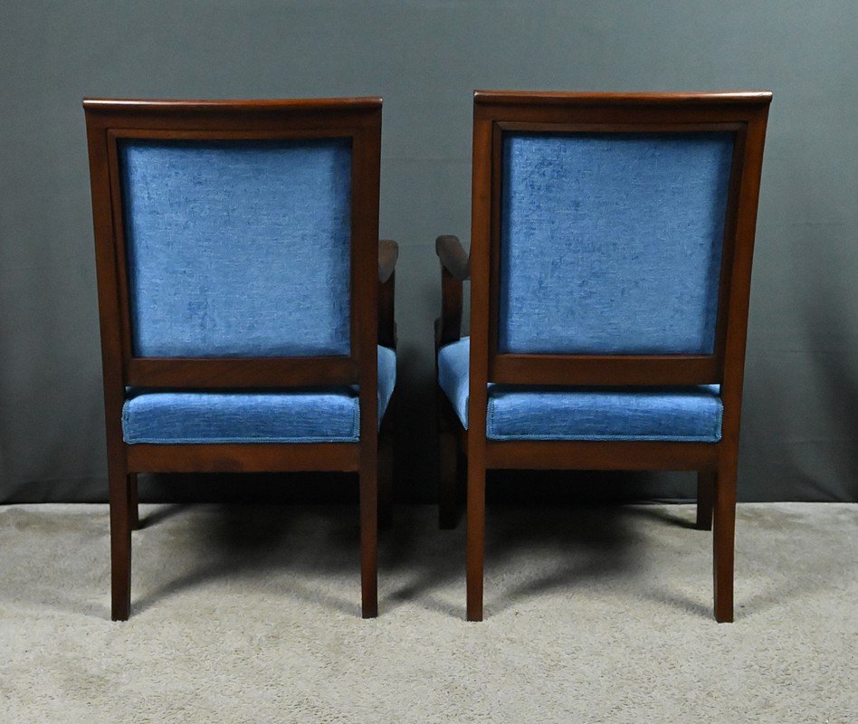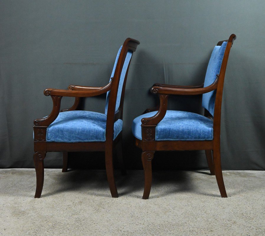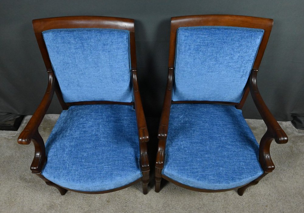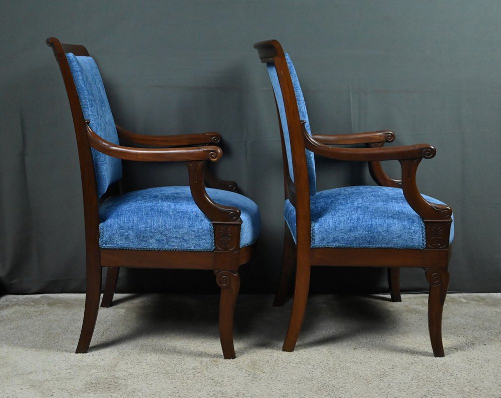 This superb pair of armchairs embodies the nobility of the Restoration style, combining architectural rigor with decorative refinement. Carved from deep-hued mahogany, they rest on powerful and dynamic front legs, known as "hock legs," while the saber-shaped rear legs ensure discreet and elegant stability.