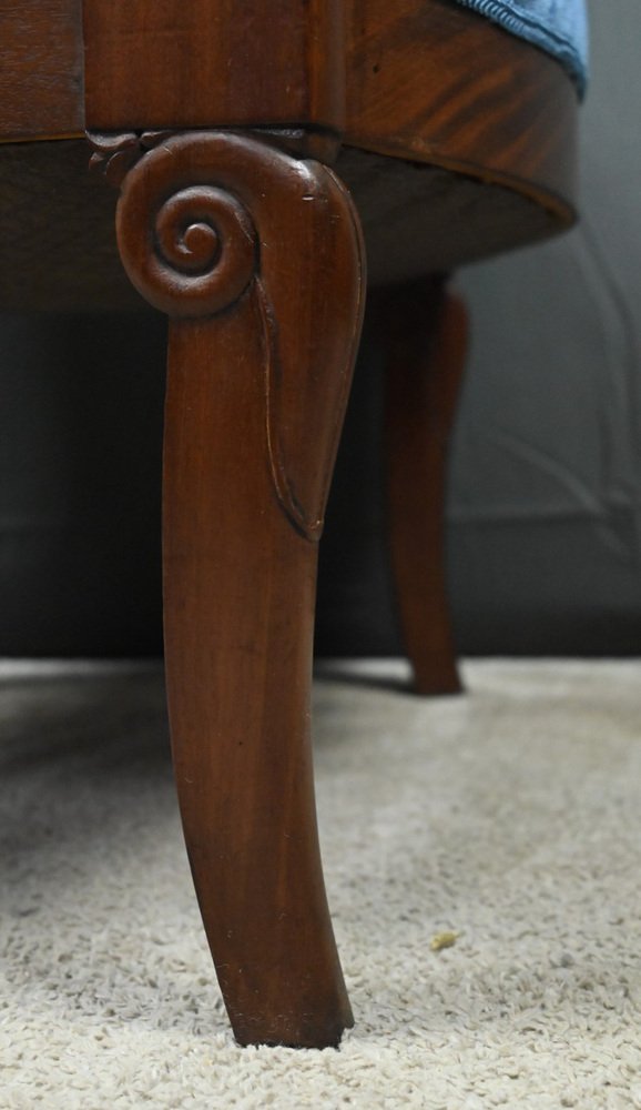 Los reposabrazos, finamente tallados con volutas, se apoyan en consolas elegantemente curvadas, a su vez colocadas sobre bases adornadas con palmetas laterales, una firma decorativa emblemática de la época. Los respaldos curvados y generosamente acolchados ofrecen una comodidad envolvente, realzada por asientos totalmente retapizados con técnicas tradicionales: crin y muelles, para un apoyo perfecto y duradero. El nuevo y luminoso tejido azul Casal añade un toque contemporáneo al conjunto, resaltando sutilmente la calidez de la madera y la pureza de las líneas. Un conjunto ideal para los amantes de los muebles históricos, que buscan combinar autenticidad, comodidad y distinción. Época: principios del siglo XIX. Excelente estado tras su restauración en nuestro taller.