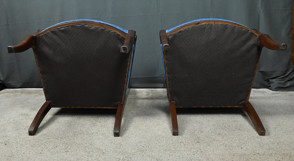 The armrests, finely carved with scrolls, are supported by gracefully curved consoles, themselves set upon bases adorned with lateral palmettes, an emblematic decorative signature of the period. The generously padded, curved backs offer enveloping comfort, enhanced by seats entirely reupholstered using traditional techniques: horsehair and springs, for perfect and lasting support. The new and luminous blue Casal fabric adds a contemporary touch to the ensemble, subtly highlighting the warmth of the wood and the purity of the lines. An ideal set for lovers of historical furniture, seeking to combine authenticity, comfort, and distinction.