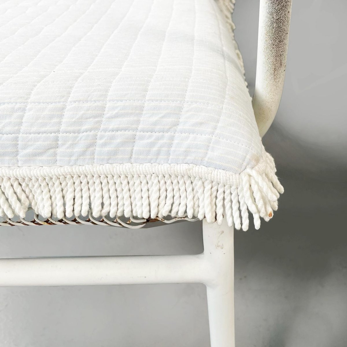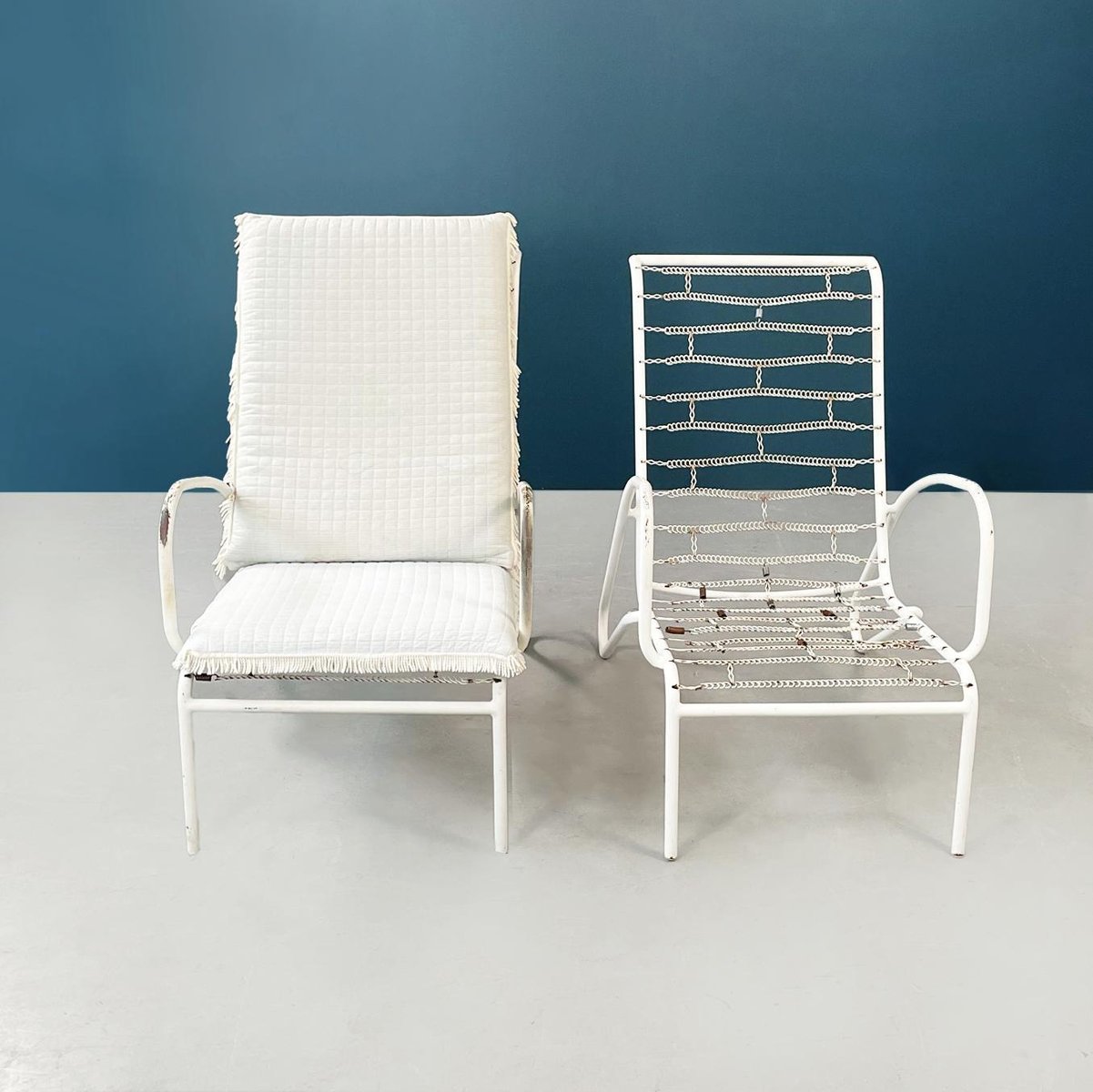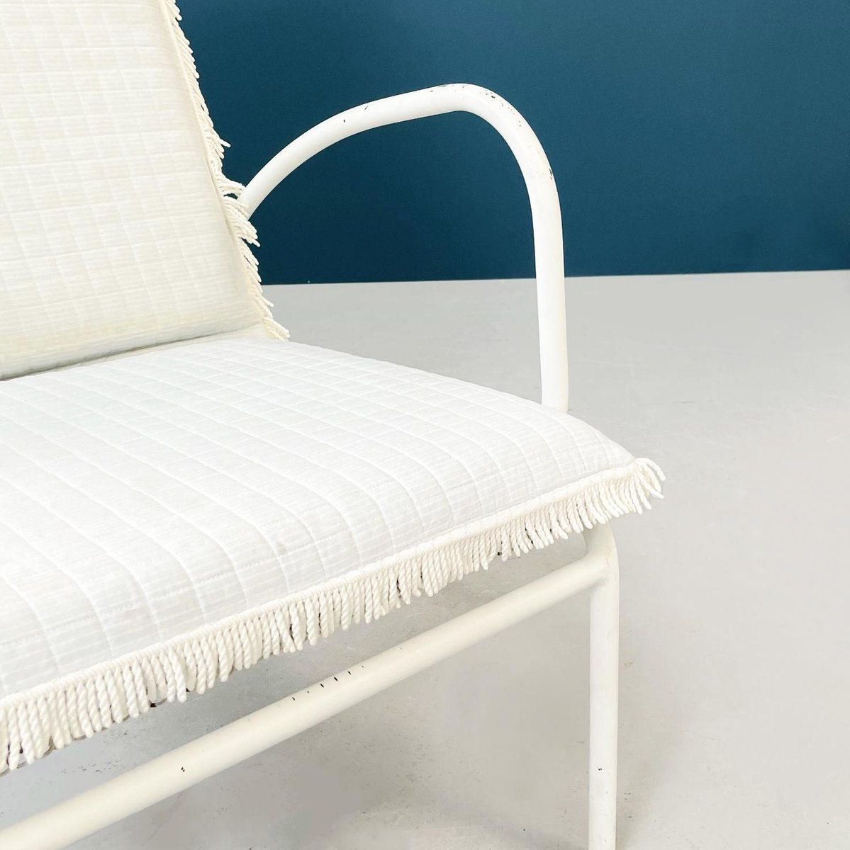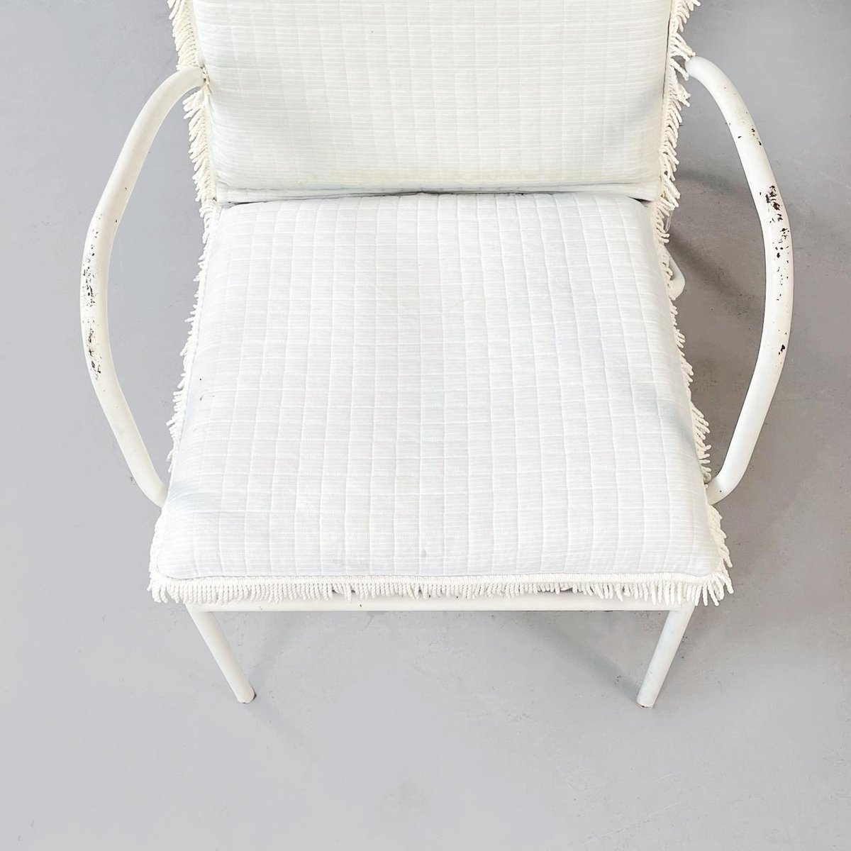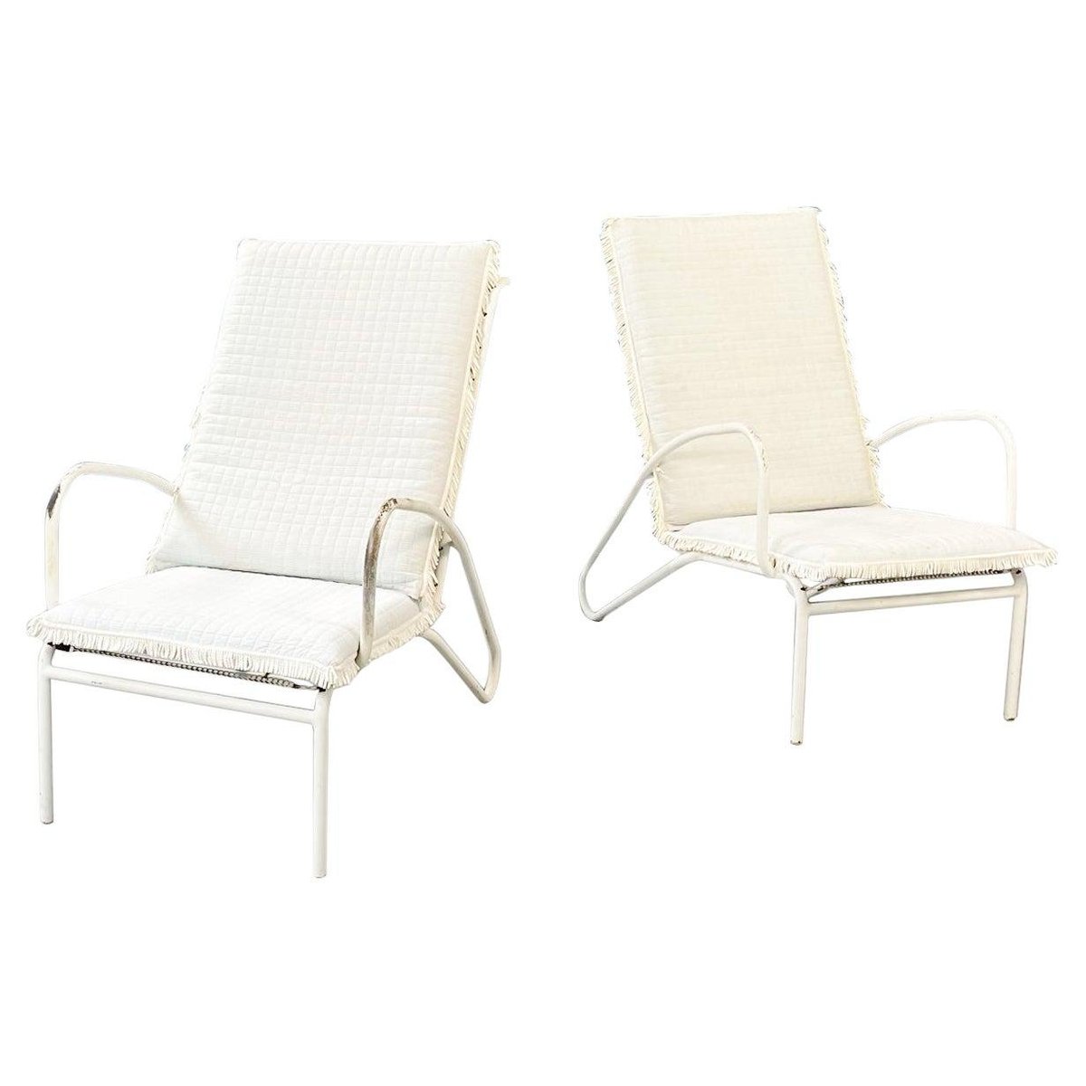 Butacas de jardín italianas Mid-Century de hierro blanco con cojines de tela, años 60. Juego de 2