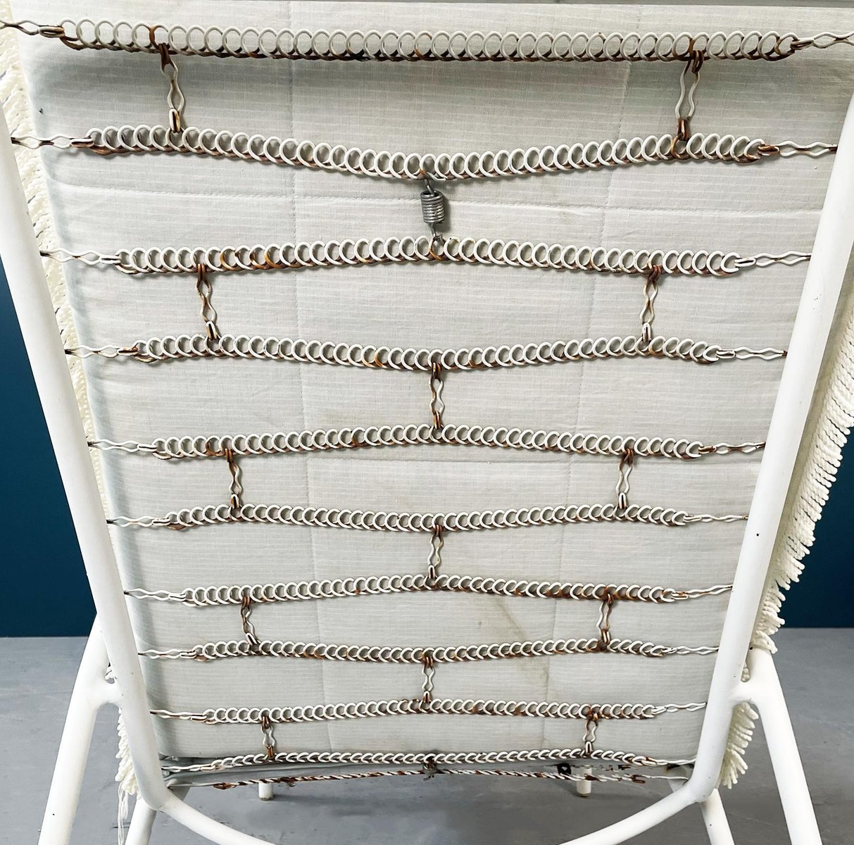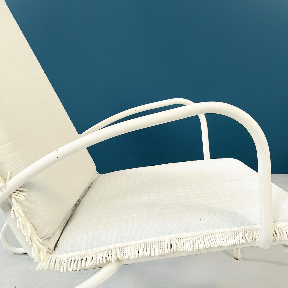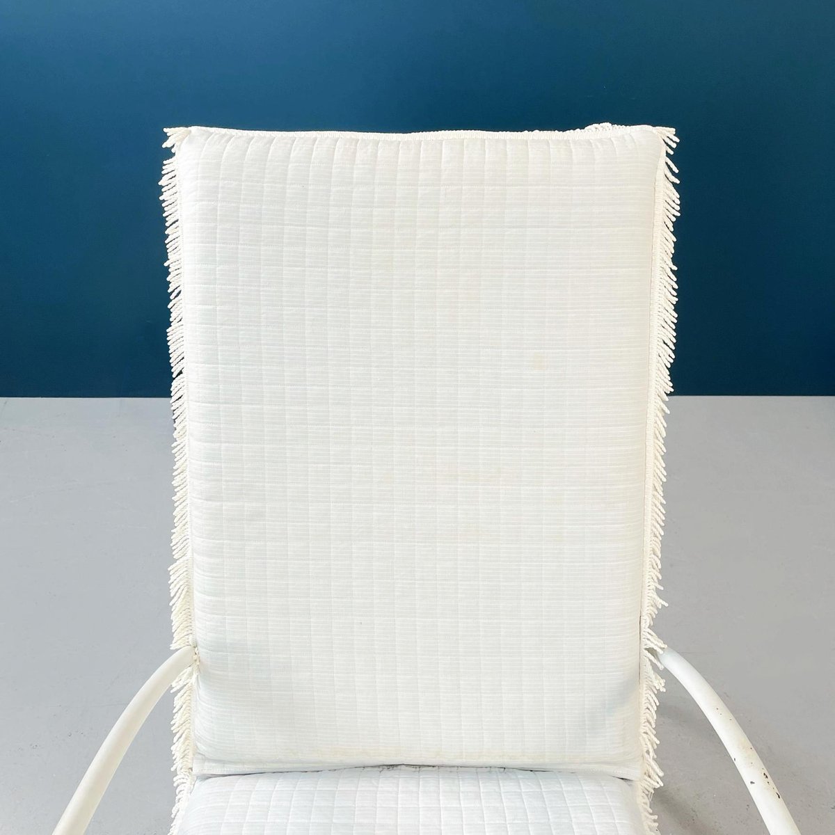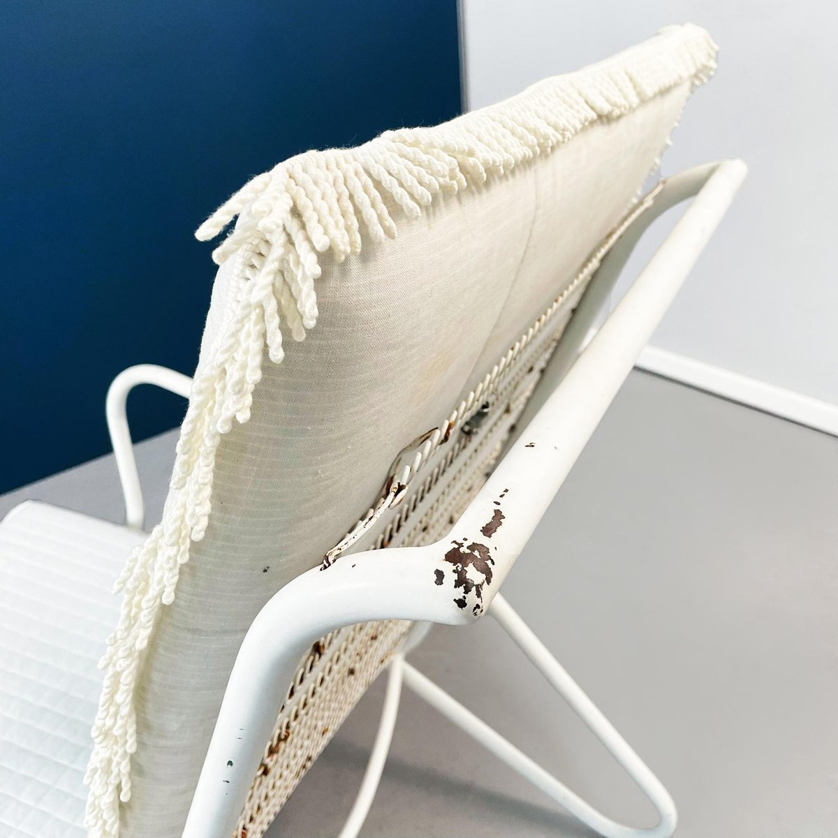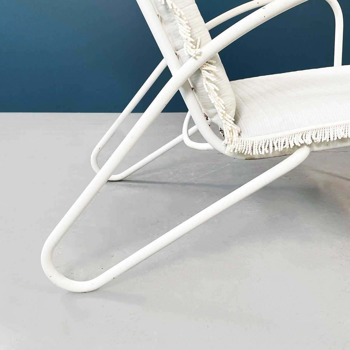 Butacas de jardín italianas Mid-Century de hierro blanco con cojines de tela, años 60. Juego de 2