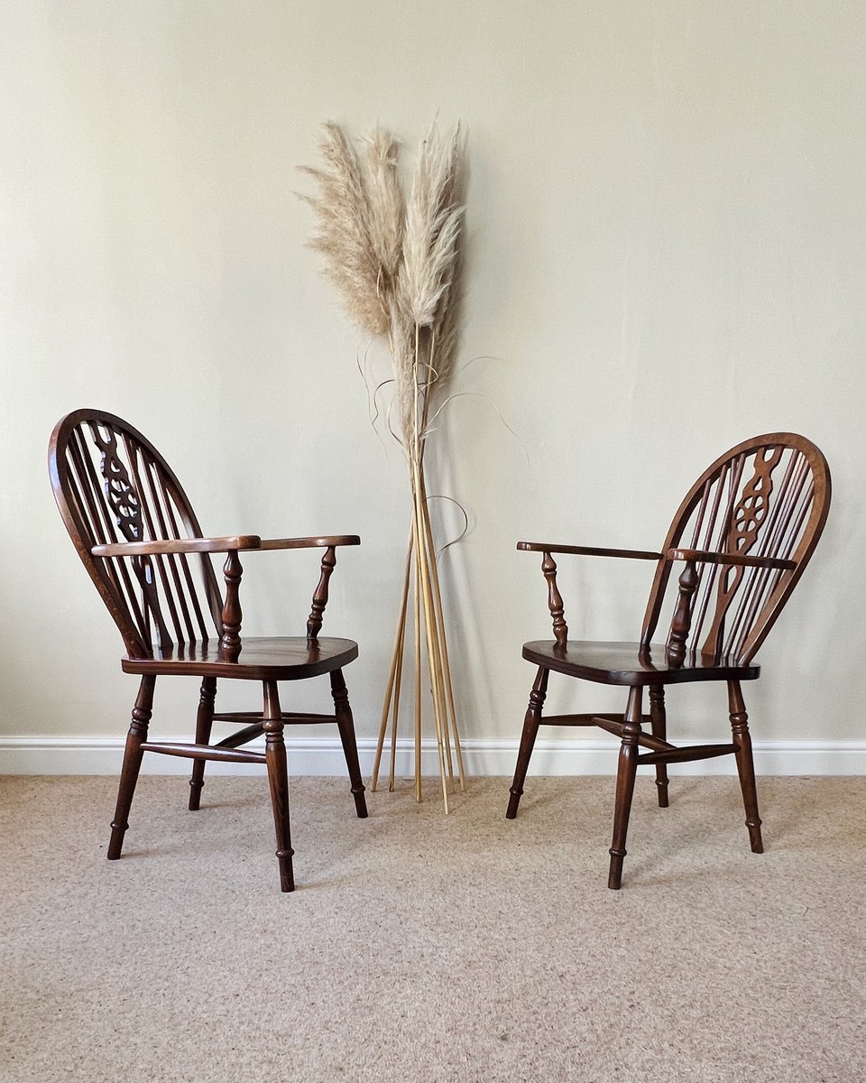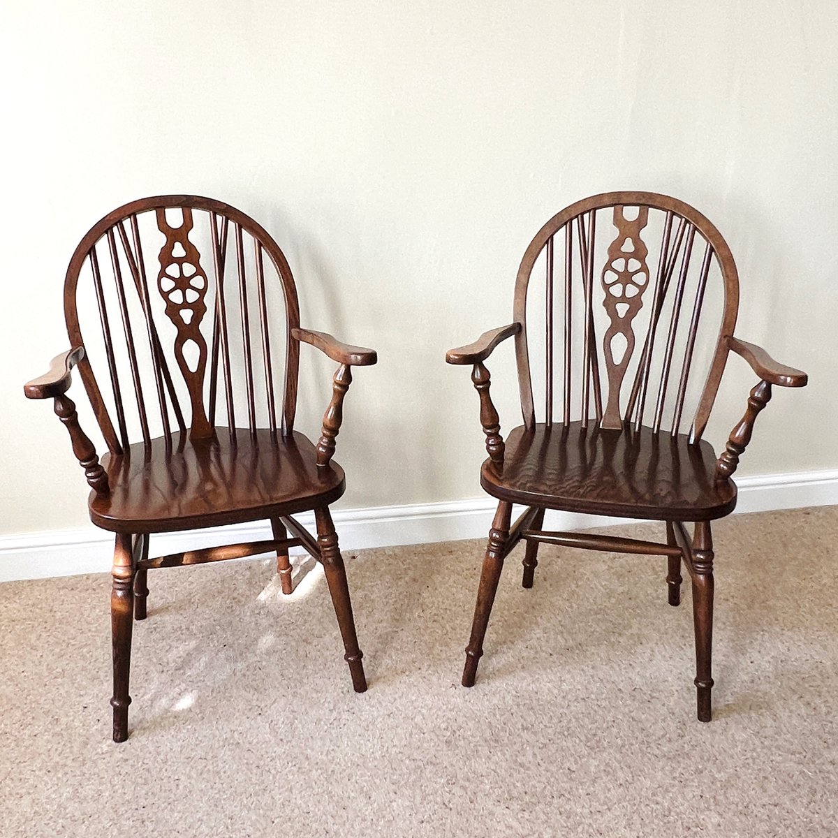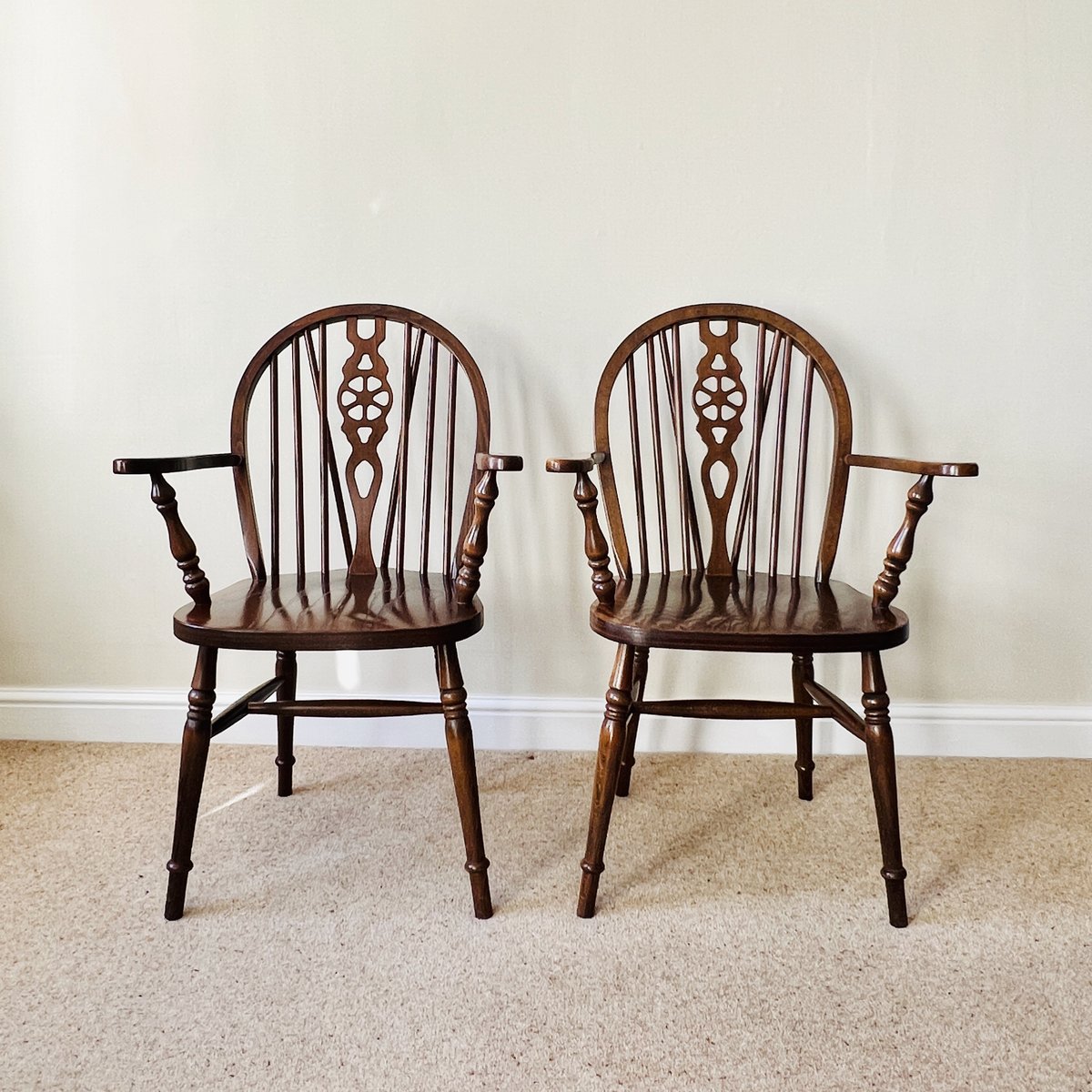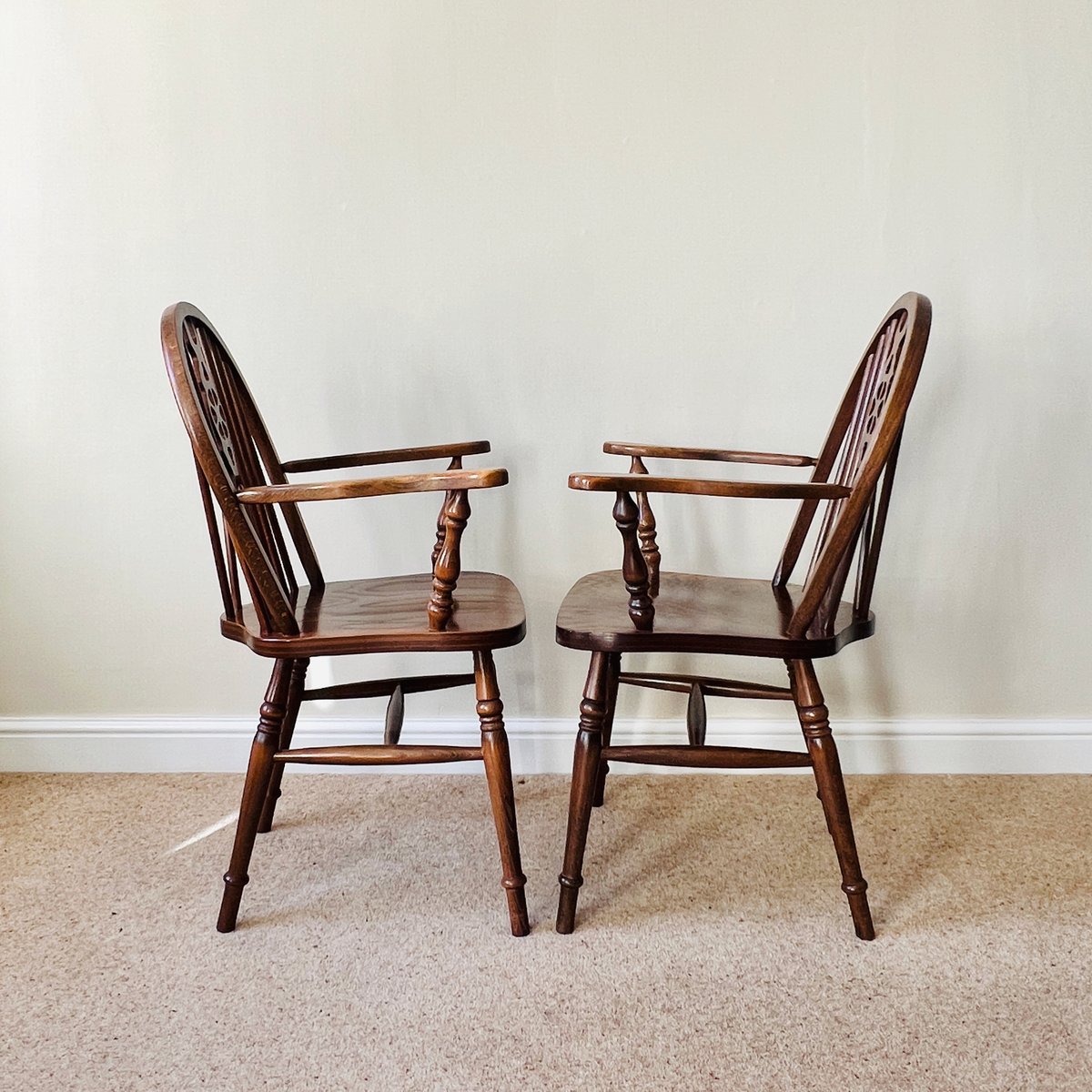 A pair of vintage English Windsor wheelback armchairs in the traditional country style. Each chair features a steam-bent hoop back with slender spindle supports and a distinctive wheelback splat, shaped arms on turned supports, and a broad saddle seat. The turned legs are joined by stretchers, combining strength with elegance, with the additional bracing spindles into the back for extra stiffness.
