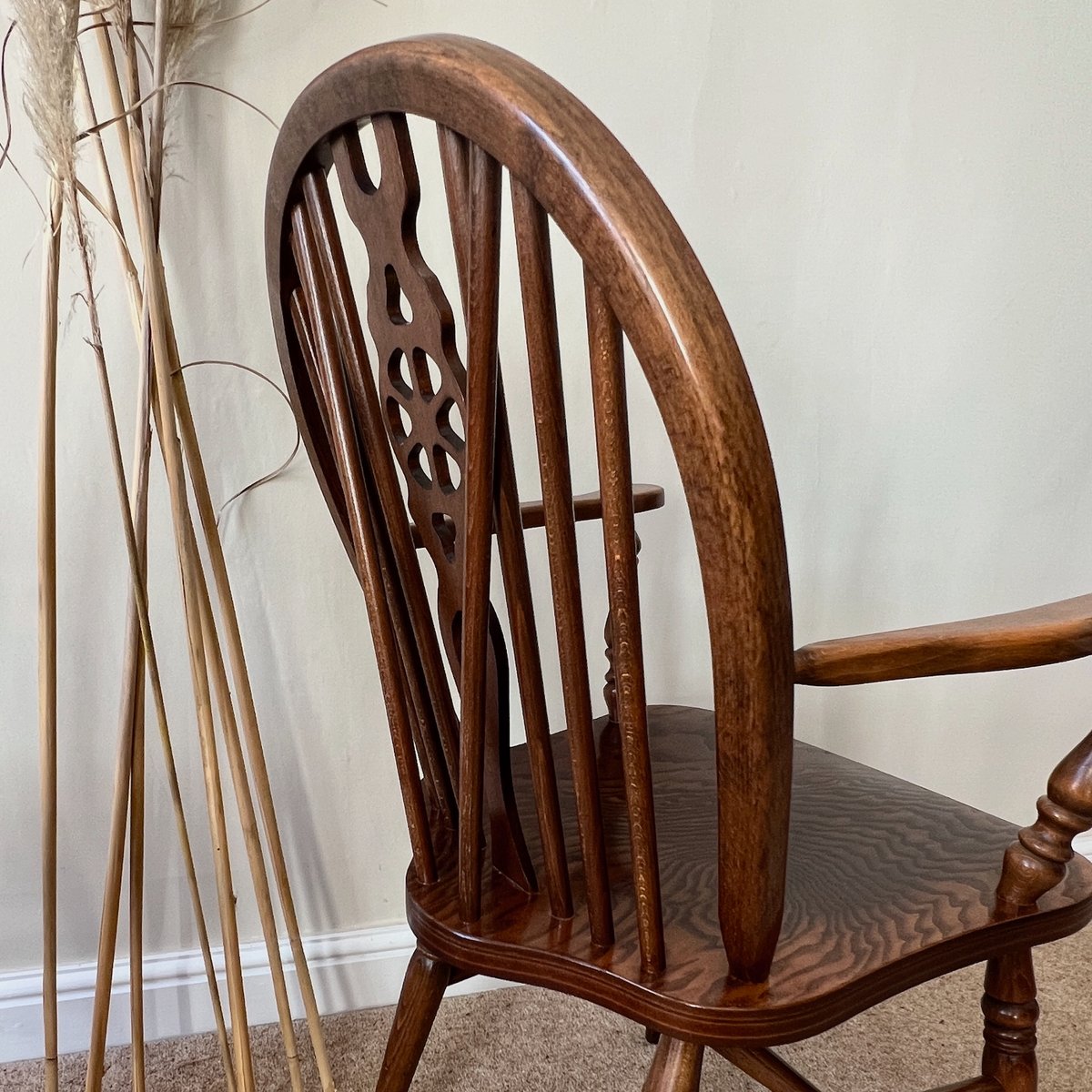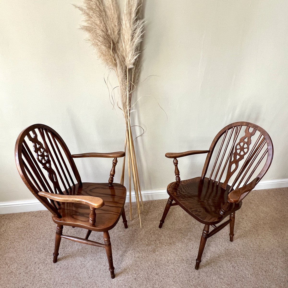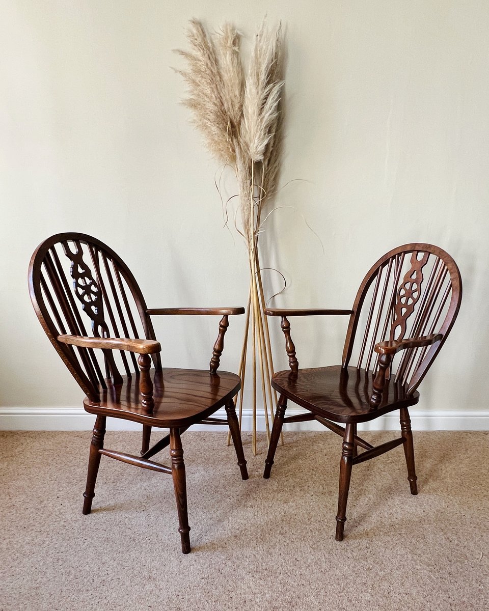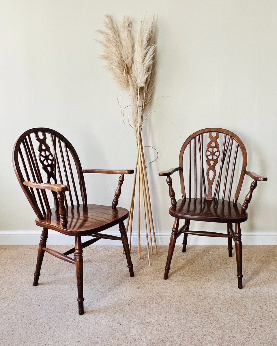 A pair of vintage English Windsor wheelback armchairs in the traditional country style. Each chair features a steam-bent hoop back with slender spindle supports and a distinctive wheelback splat, shaped arms on turned supports, and a broad saddle seat. The turned legs are joined by stretchers, combining strength with elegance, with the additional bracing spindles into the back for extra stiffness.